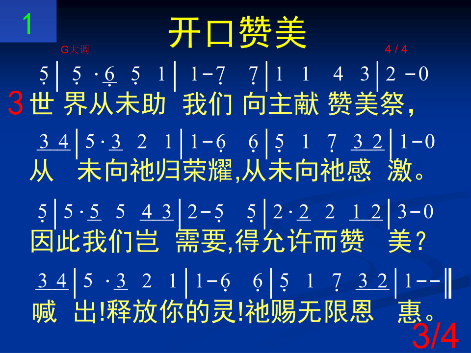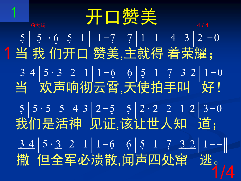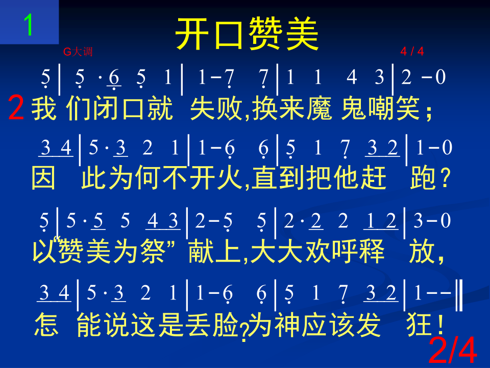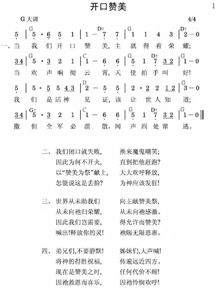 当我们开口赞美,主就得着荣耀;当欢声响彻云霄,天使拍手叫好!我们是活神见证,该让世人知道;撒但全军必溃散,闻声四处窜逃。 二 我们闭口就失败,换来魔鬼嘲笑;因此为何不开火,直到把他赶跑?以“赞美为祭”献上,大大欢呼释放,怎能说这是丢脸?为神应该发狂! 三 世界从未助我们向主献赞美祭,从未向祂归荣耀,从未向祂感激。因此我们岂需要,得允许而赞美?喊出!释放你的灵!祂赐无限恩惠。 四 弟兄们,不要静默!姊妹们,大声喊!将神的得胜祝福,传遍远近四方。现在是赞美之时,任何代价不顾!因祂救恩而喜乐,因祂怜悯欢呼!