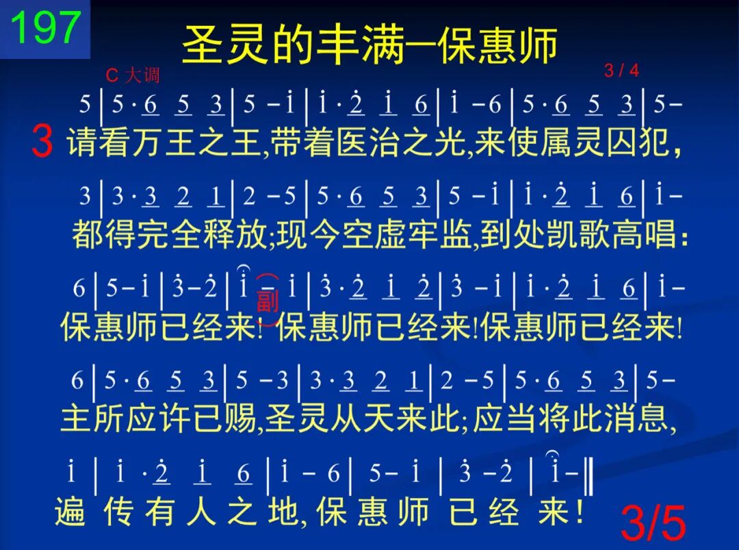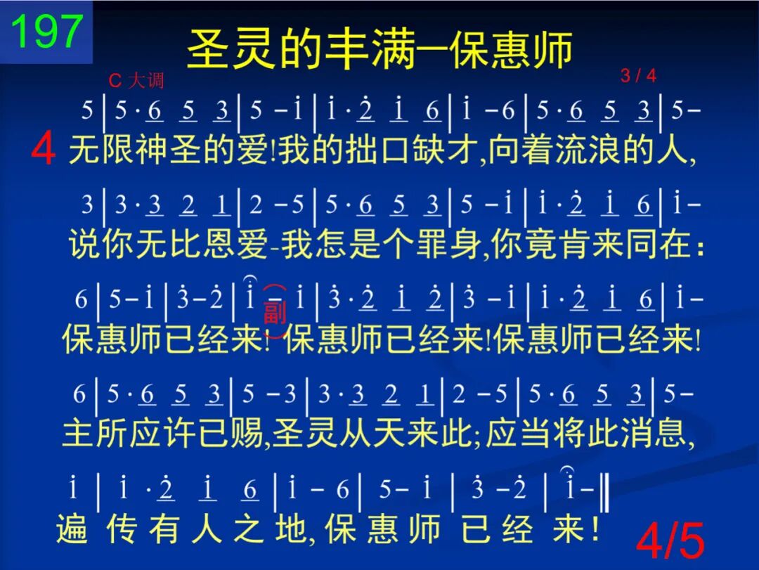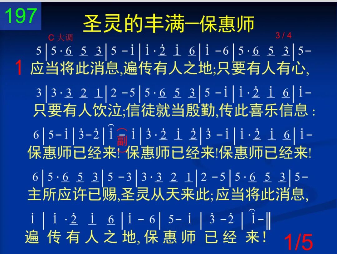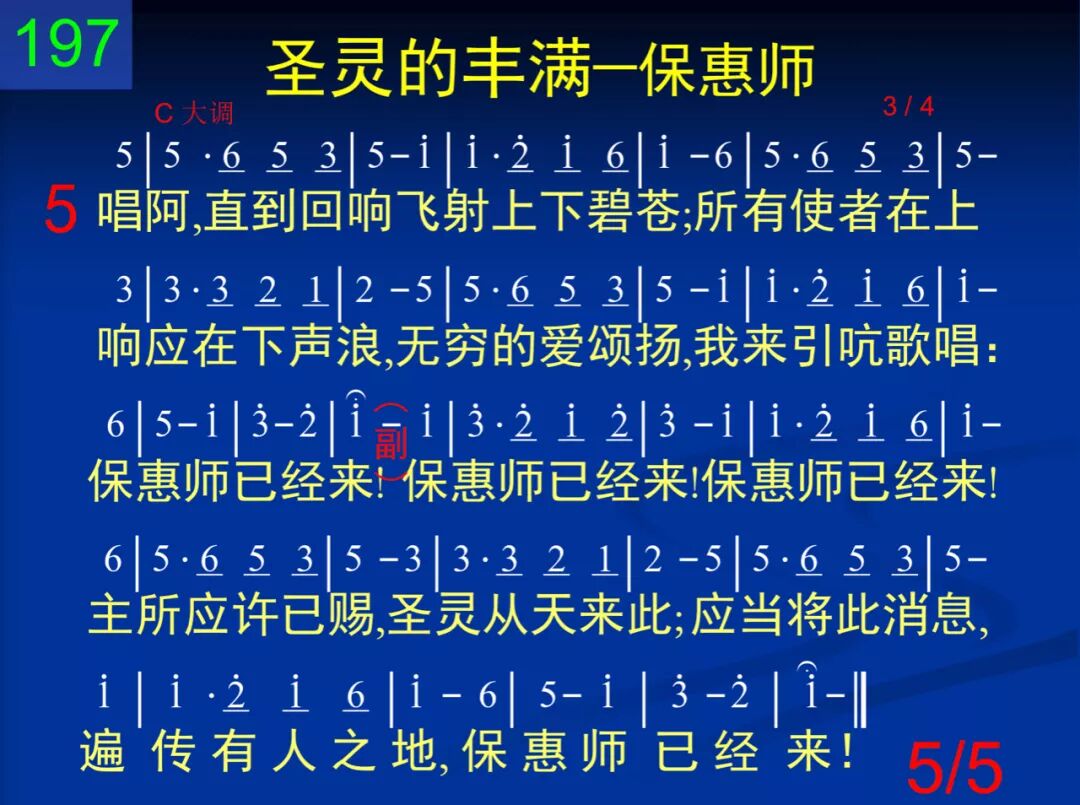应当将此消息,遍传有人之地;只要有人有心,只要有人饮泣;信徒就当殷勤,传此喜乐信息:保惠师已经来! 保惠师已经来!保惠师已经来!主所应许已赐,圣灵从天来此;应当将此消息,遍传有人之地,保惠师已经来! 二 漫漫黑夜已过,最终晨晓已破,悲哭声音停止,哀求声音不作,远山现出金丝,晨曦已在炳烁:保惠师已经来! 保惠师已经来!保惠师已经来!主所应许已赐,圣灵从天来此;应当将此消息,遍传有人之地,保惠师已经来! 三 请看万王之王,带着医治之光,来使属灵囚犯,都得完全释放;现今空虚牢监,到处凯歌高唱:保惠师已经来! 保惠师已经来!保惠师已经来!主所应许已赐,圣灵从天来此;应当将此消息,遍传有人之地,保惠师已经来! 四 无限神圣的爱!我的拙口缺才,向着流浪的人,说你无比恩爱─我怎是个罪身,你竟肯来同在:保惠师已经来! 保惠师已经来!保惠师已经来!主所应许已赐,圣灵从天来此;应当将此消息,遍传有人之地,保惠师已经来! 五 唱阿,直到回响飞射上下碧苍;所有使者在上响应在下声浪,无穷的爱颂扬,我来引吭歌唱:保惠师已经来! 保惠师已经来!保惠师已经来!主所应许已赐,圣灵从天来此;应当将此消息,遍传有人之地,保惠师已经来!