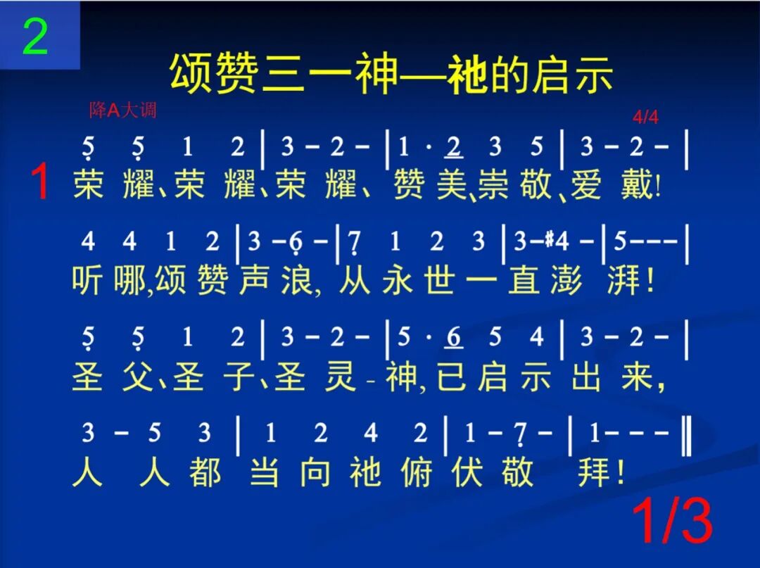 圣父乃是源头,荣耀、无限、丰厚;圣子借着权能,以命令托住万有;圣灵充满全景,荣耀、无往不透,哦,这荣耀丰满配得歌讴!