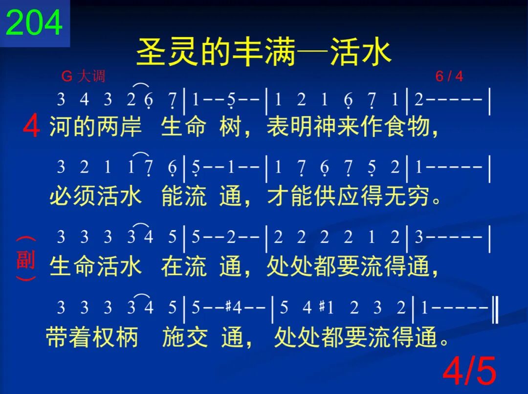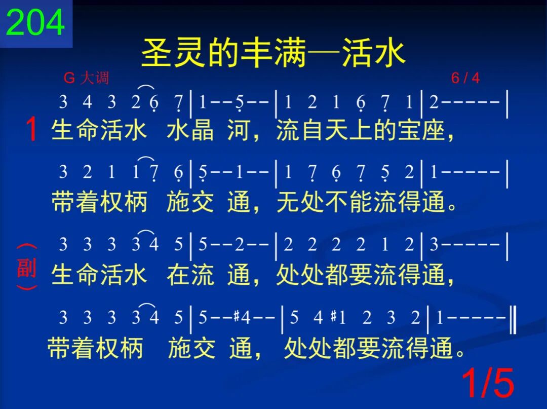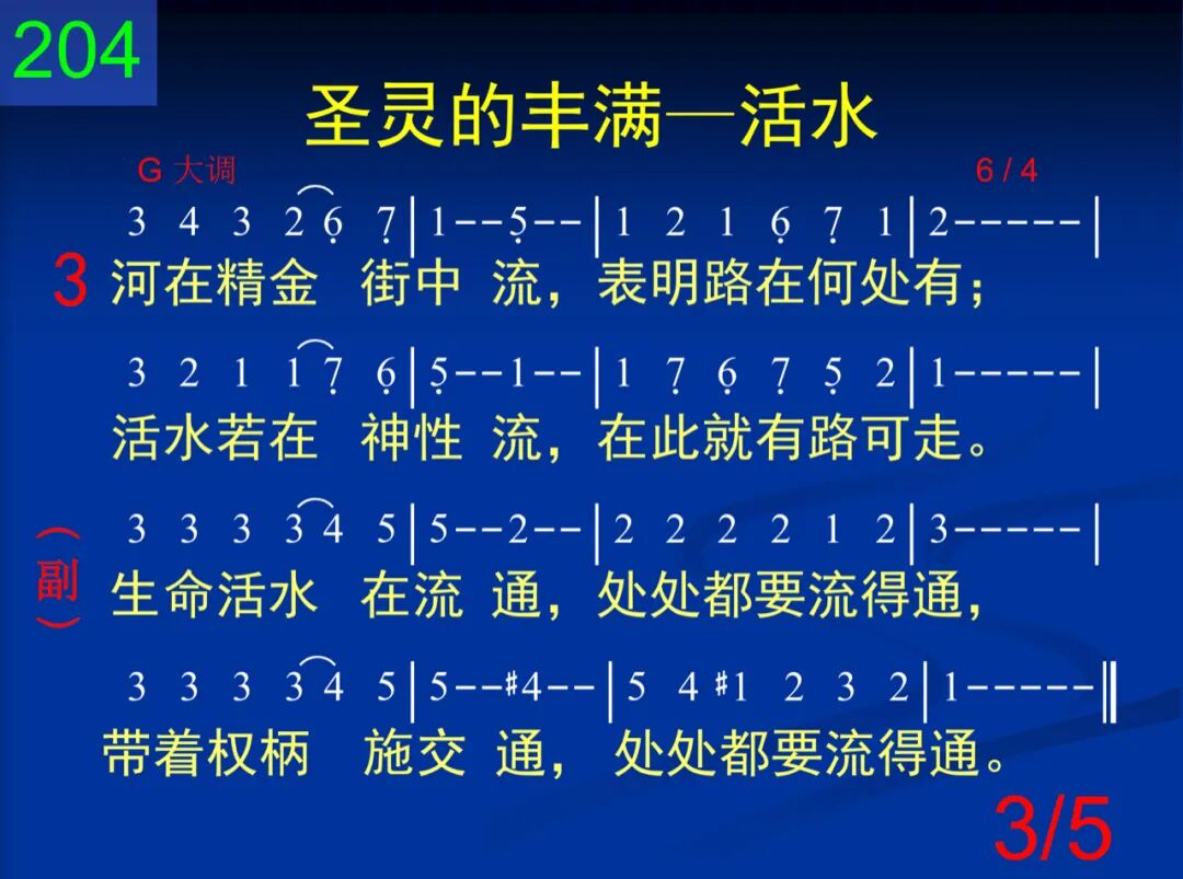生命活水水晶河,流自天上的宝座,带着权柄施交通,无处不能流得通。 生命活水在流通,处处都要流得通,带着权柄施交通,处处都要流得通。 二 生命活水是圣灵,是神流出作生命,带着权柄而流通,处处都要流得通。 生命活水在流通,处处都要流得通,带着权柄施交通,处处都要流得通。 三 河在精金街中流,表明路在何处有;活水若在神性流,在此就有路可走。 生命活水在流通,处处都要流得通,带着权柄施交通,处处都要流得通。 四 河的两岸生命树,表明神来作食物,必须活水能流通,才能供应得无穷。 生命活水在流通,处处都要流得通,带着权柄施交通,处处都要流得通。 五 主阿,你曾被裂开,为将活水流出来;求你也将我打破,让你活水能通过。 生命活水在流通,处处都要流得通,带着权柄施交通,处处都要流得通。