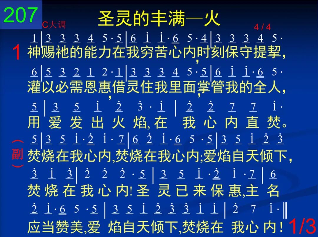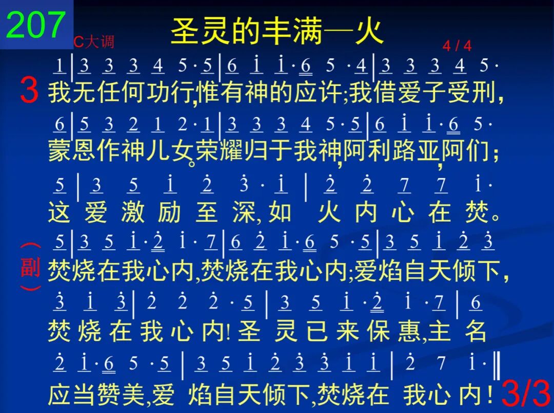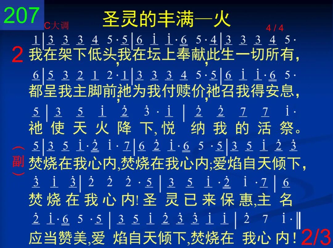 神赐祂的能力在我穷苦心内,时刻保守提挈,灌以必需恩惠,藉灵住我里面,掌管我的全人,用爱发出火焰,在我心内直焚。 焚烧在我心内,焚烧在我心内;爱焰自天倾下,焚烧在我心内!圣灵已来保惠,主名应当赞美,爱焰自天倾下,焚烧在我心内! 二 我在架下低头,我在坛上奉献,此生一切所有,都呈我主脚前;祂为我付赎价,祂召我得安息,祂使天火降下,悦纳我的活祭。 焚烧在我心内,焚烧在我心内;爱焰自天倾下,焚烧在我心内!圣灵已来保惠,主名应当赞美,爱焰自天倾下,焚烧在我心内! 三 我无任何功行,惟有神的应许;我藉爱子受刑,蒙恩作神儿女。荣耀归于我神,阿利路亚,阿们;这爱激励至深,如火内心在焚。 焚烧在我心内,焚烧在我心内;爱焰自天倾下,焚烧在我心内!圣灵已来保惠,主名应当赞美,爱焰自天倾下,焚烧在我心内!