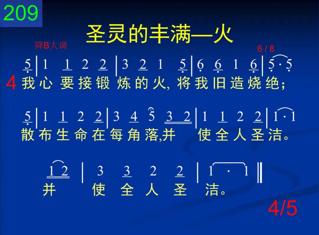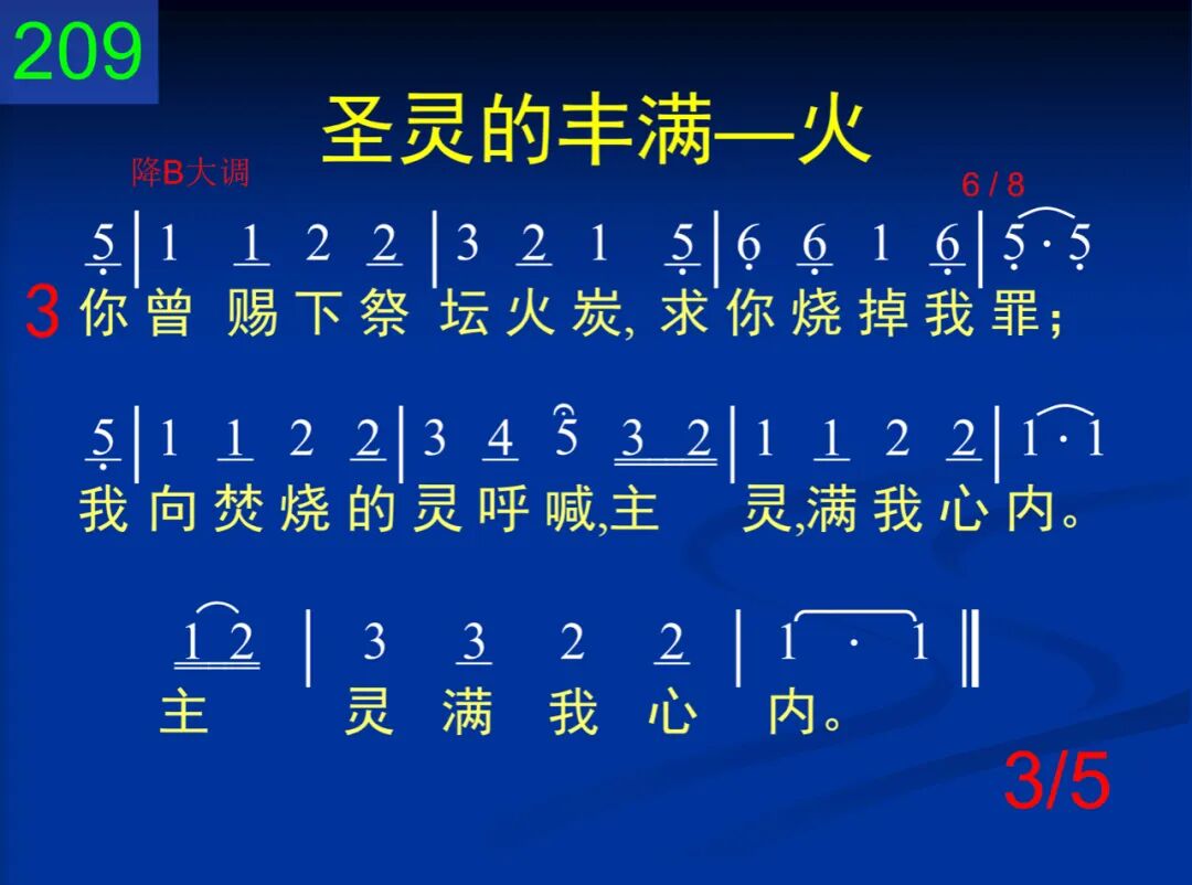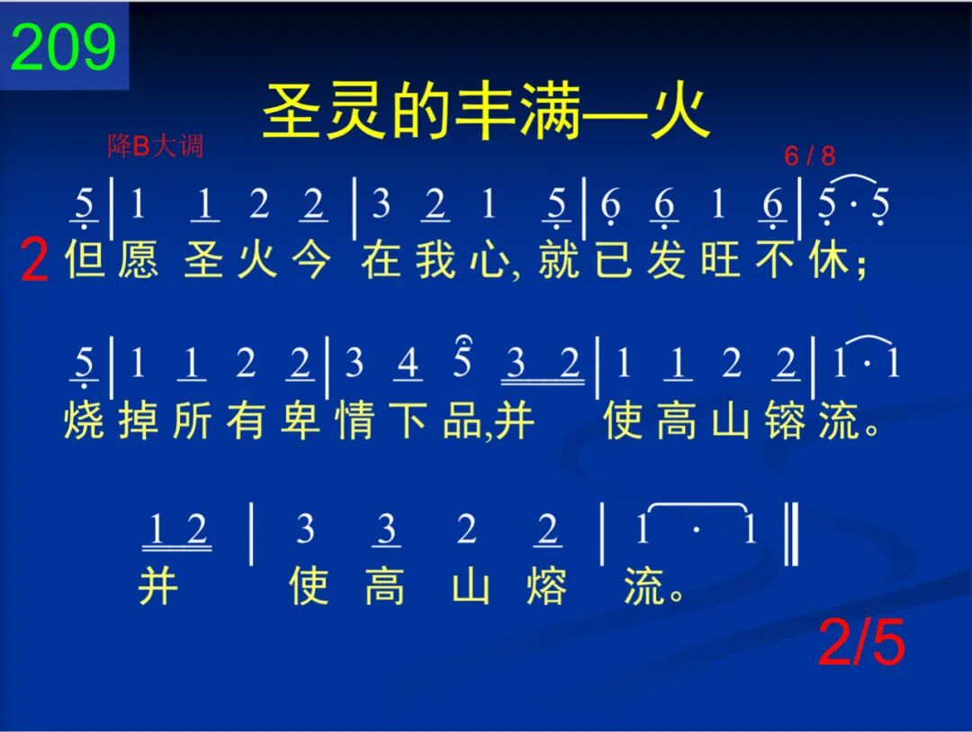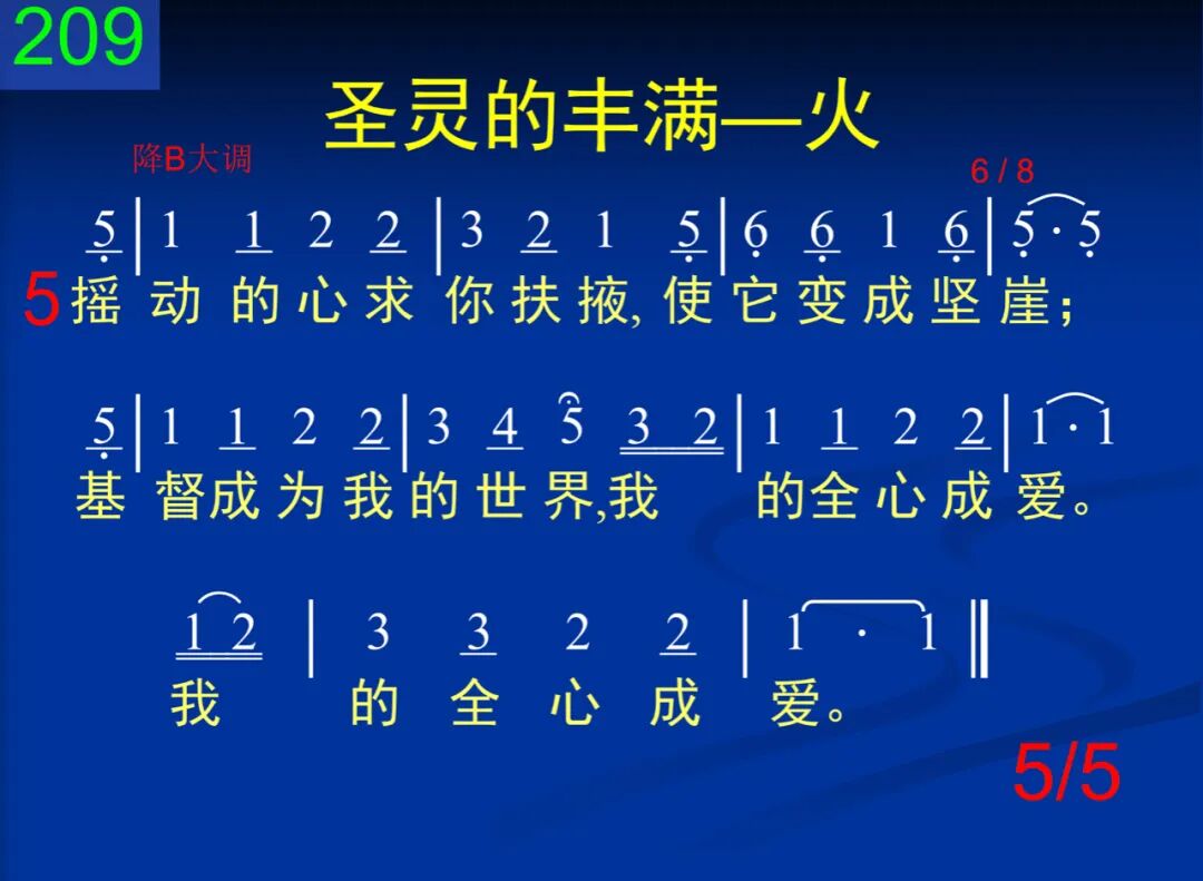 耶稣,你的全胜的爱,已经浇灌我心,我心就不再会摇摆,就能生根于神,就能生根于神。 二 但愿圣火今在我心,就已发旺不休;烧掉所有卑情下品,并使高山熔流,并使高山熔流。 三 你曾赐下祭坛火炭,求你烧掉我罪;我向焚烧的灵呼喊,主灵,满我心内,主灵,满我心内。 四 我心要接锻链的火,将我旧造烧绝;散布生命在每角落,并使全人圣洁,并使全人圣洁。 五 摇动的心求你扶掖,使它变成坚崖;基督成为我的世界,我的全心成爱,我的全心成爱。