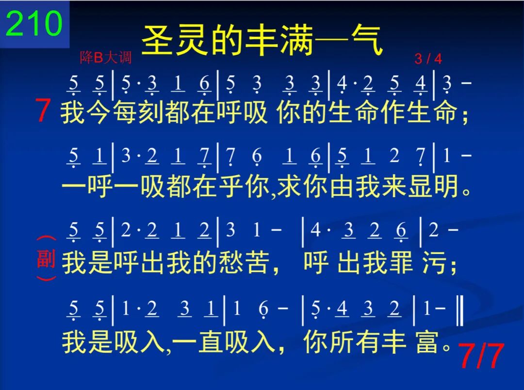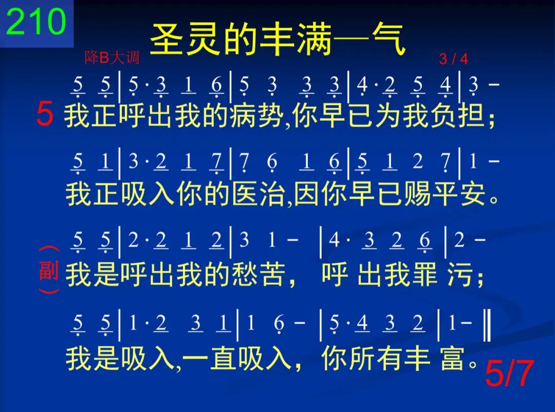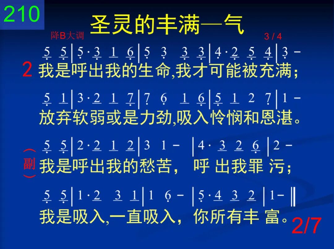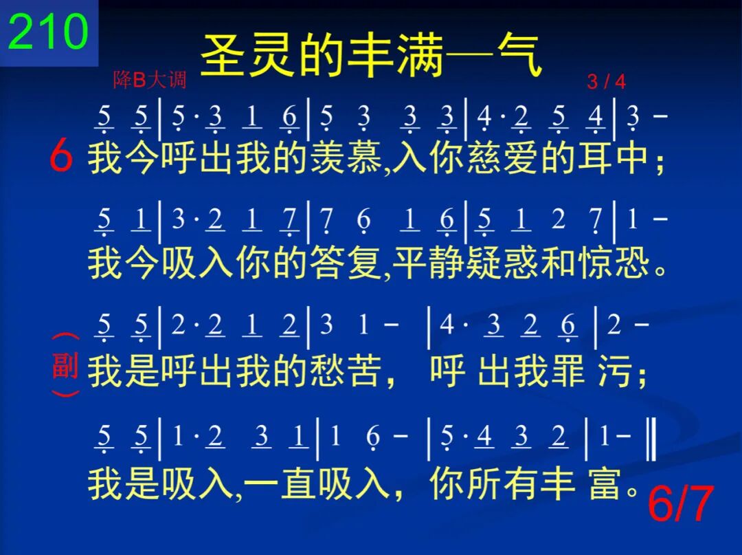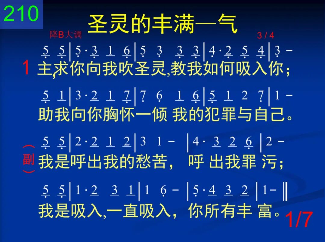 主,求你向我吹圣灵,教我如何吸入你;助我向你胸怀一倾我的犯罪与自己。 我是呼出我的愁苦,呼出我罪污;我是吸入,一直吸入,你所有丰富。 二 我是呼出我的生命,我才可能被充满;放弃软弱或是力劲,吸入怜悯和恩湛。 我是呼出我的愁苦,呼出我罪污;我是吸入,一直吸入,你所有丰富。 三 呼出我的罪律桎梏,你已为我全除摒;吸入你的圣洁丰富,发现惟你是生命。 我是呼出我的愁苦,呼出我罪污;我是吸入,一直吸入,你所有丰富。 四 我正呼出我的忧愁在你慈爱的胸臆;吸入你的喜乐、保守,吸入你的甜安息。 我是呼出我的愁苦,呼出我罪污;我是吸入,一直吸入,你所有丰富。 五 我正呼出我的病势,你早已为我负担;我正吸入你的医治,因你早已赐平安。 我是呼出我的愁苦,呼出我罪污;我是吸入,一直吸入,你所有丰富。 六 我今呼出我的羡慕,入你慈爱的耳中;我今吸入你的答覆,平静疑惑和惊恐。 我是呼出我的愁苦,呼出我罪污;我是吸入,一直吸入,你所有丰富。 七 我今每刻都在呼吸你的生命作生命;一呼一吸都在乎你,求你由我来显明。 我是呼出我的愁苦,呼出我罪污;我是吸入,一直吸入,你所有丰富。