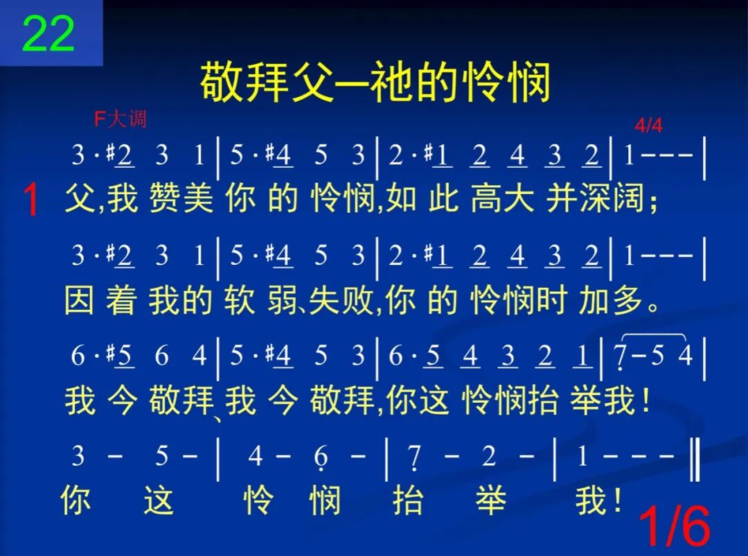 父,我赞美你的怜悯,如此高大并深阔;因着我的软弱、失败,你的怜悯时加多。我今敬拜、我今敬拜,你这怜悯抬举我!你这怜悯抬举我!