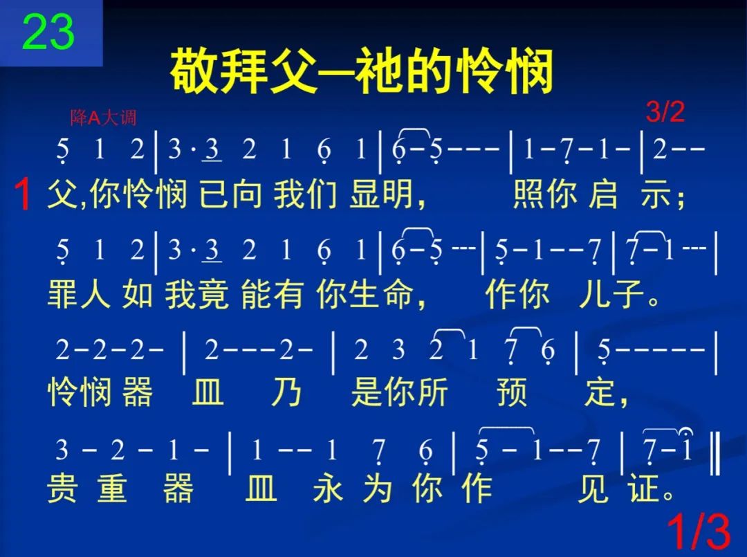 父,你怜悯并你恩惠、慈爱,我已得尝;你这怜悯带来你的同在,并你面光。因你怜悯,我今向你下拜,赞你怜悯,歌颂直到万代。