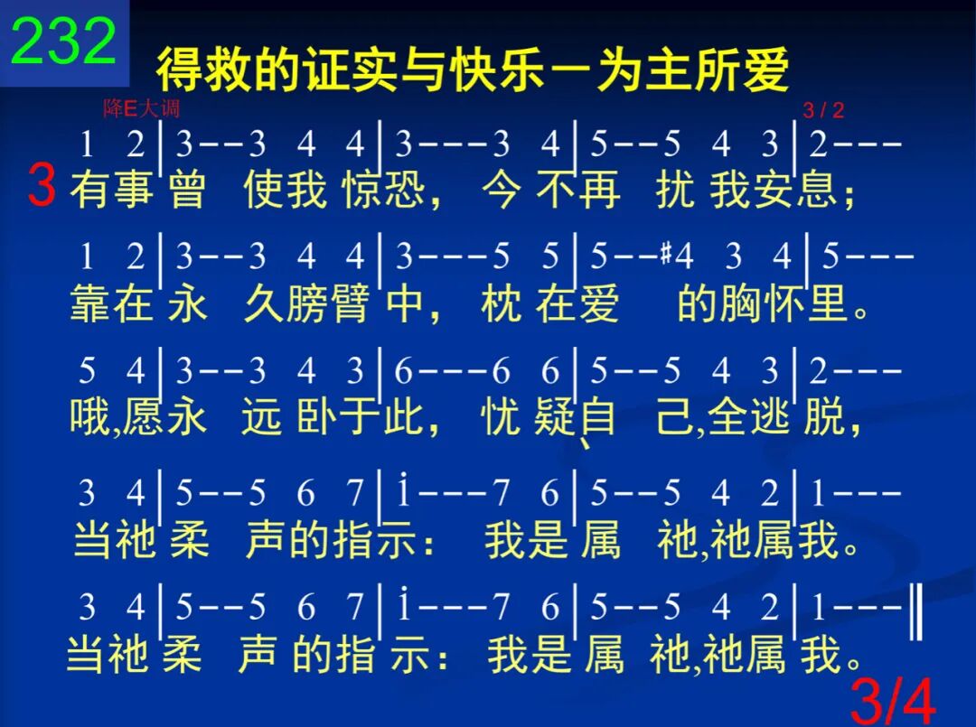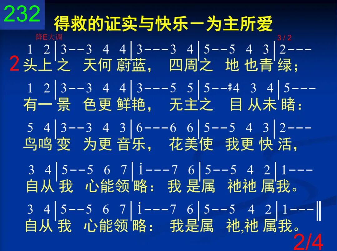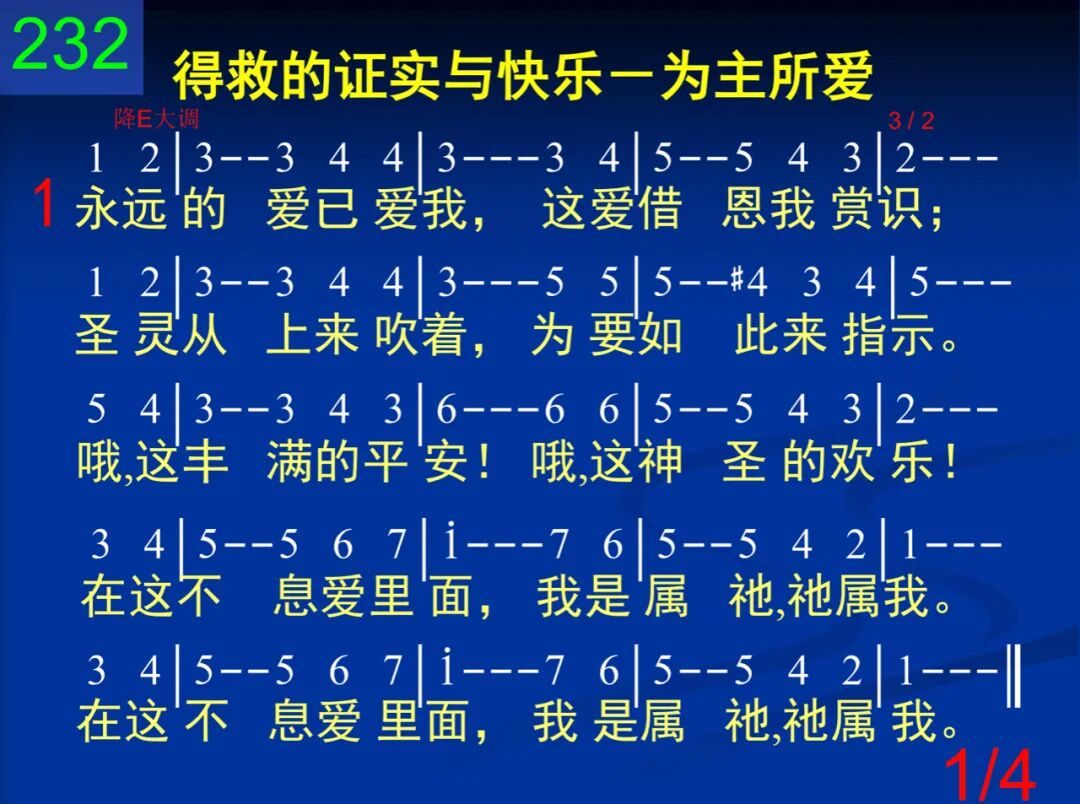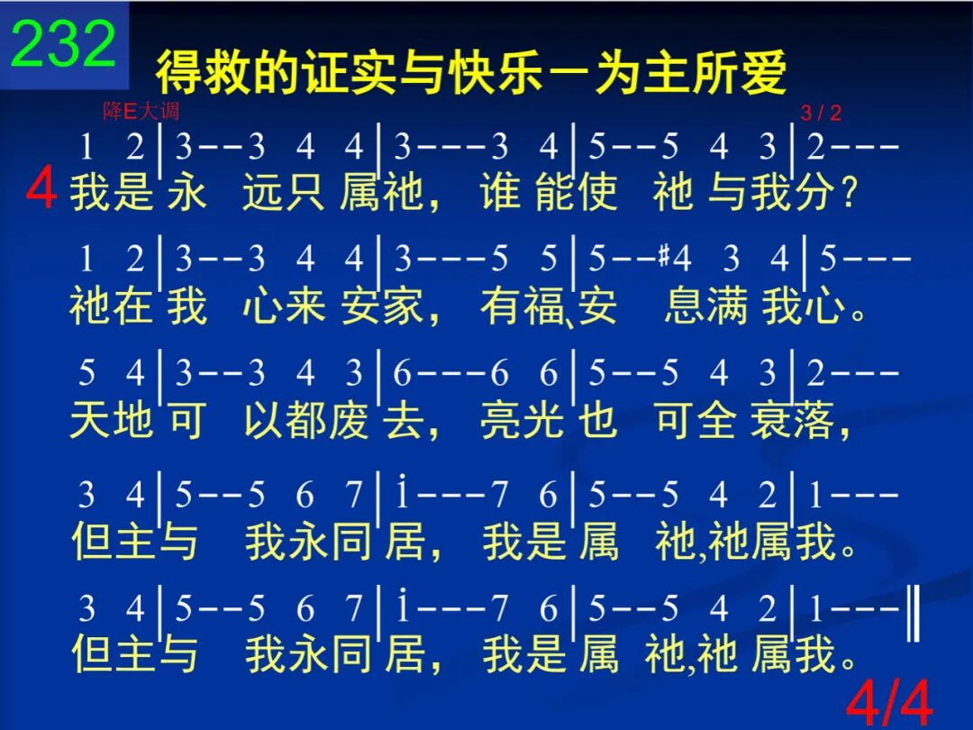 永远的爱已爱我,这爱藉恩我赏识;圣灵从上来吹着,为要如此来指示。哦,这丰满的平安!哦,这神圣的欢乐!在这不息爱里面,我是属祂,祂属我。 二 头上之天何蔚蓝,四周之地也青绿;有一景色更鲜艳,无主之目从未睹:鸟鸣变为更音乐,花美使我更快活,自从我心能领略:我是属祂,祂属我。 三 有事曾使我惊恐,今不再扰我安息;靠在永久膀臂中,枕在爱的胸怀里。哦,愿永远卧于此,忧疑、自己,全逃脱,当祂柔声的指示:我是属祂,祂属我。 四 我是永远只属祂,谁能使祂与我分?祂在我心来安家,有福、安息满我心。天地可以都废去,亮光也可全衰落,但主与我永同居,我是属祂,祂属我。