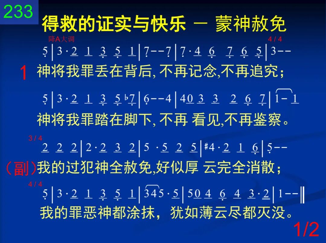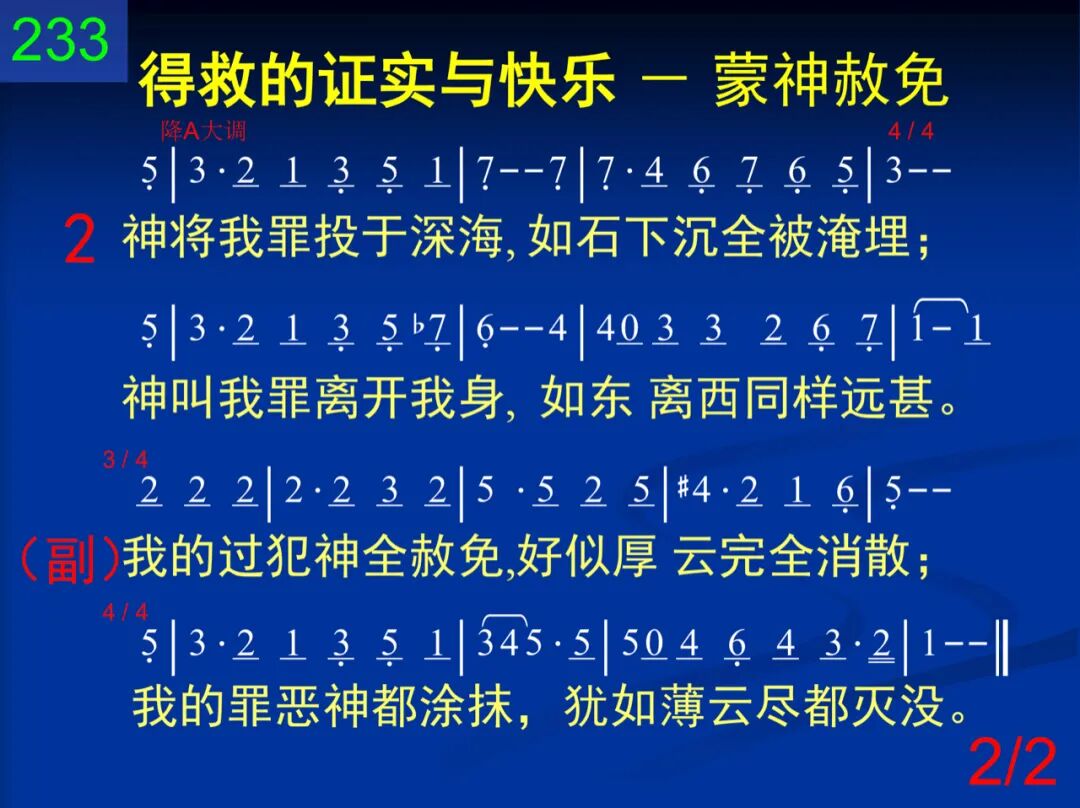 神将我罪丢在背后,不再记念,不再追究;神将我罪踏在脚下,不再看见,不再鉴察。 我的过犯神全赦免,好似厚云完全消散;我的罪恶神都涂抹,犹如薄云尽都灭没。 二 神将我罪投于深海,如石下沉全被淹埋;神叫我罪离开我身,如东离西同样远甚。 我的过犯神全赦免,好似厚云完全消散;我的罪恶神都涂抹,犹如薄云尽都灭没。