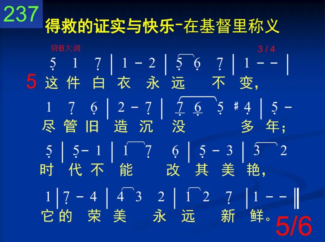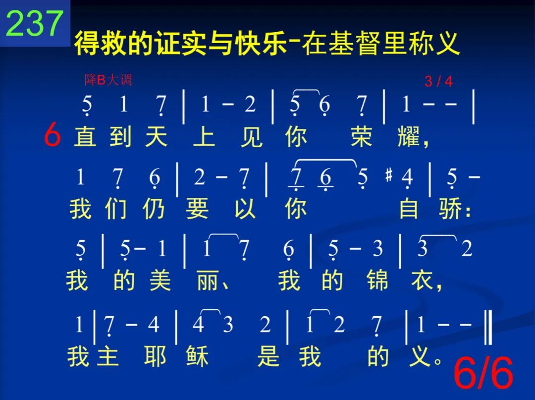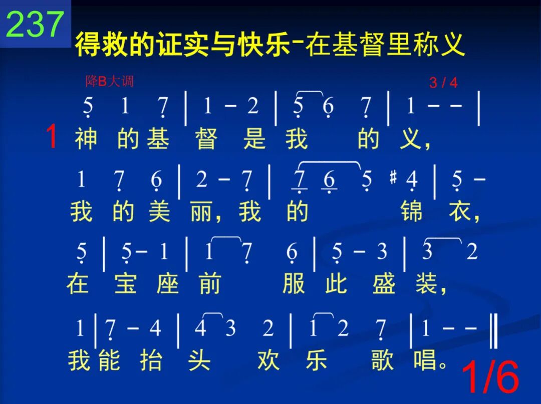 神的基督是我的义,我的美丽,我的锦衣,在宝座前服此盛装,我能抬头欢乐歌唱。 二 主阿,我信你的宝血,已将我罪全都解决,为我洒在神施恩座,永远为我向神求赦。 三 藉你救赎,我已脱去我罪、我过、我耻、我惧;审判大日我敢站立,谁能控告你所称义? 四 亚伯拉罕就是如此,蒙赎圣徒也都一式,宣布你为罪人救星,他们所夸只在你名。 五 这件白衣永远不变,尽管旧造沉没多年;时代不能改其美艳,它的荣美永远新鲜。 六 直到天上见你荣耀,我们仍要以你自骄:我的美丽、我的锦衣,我主耶稣是我的义。