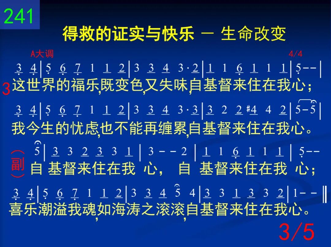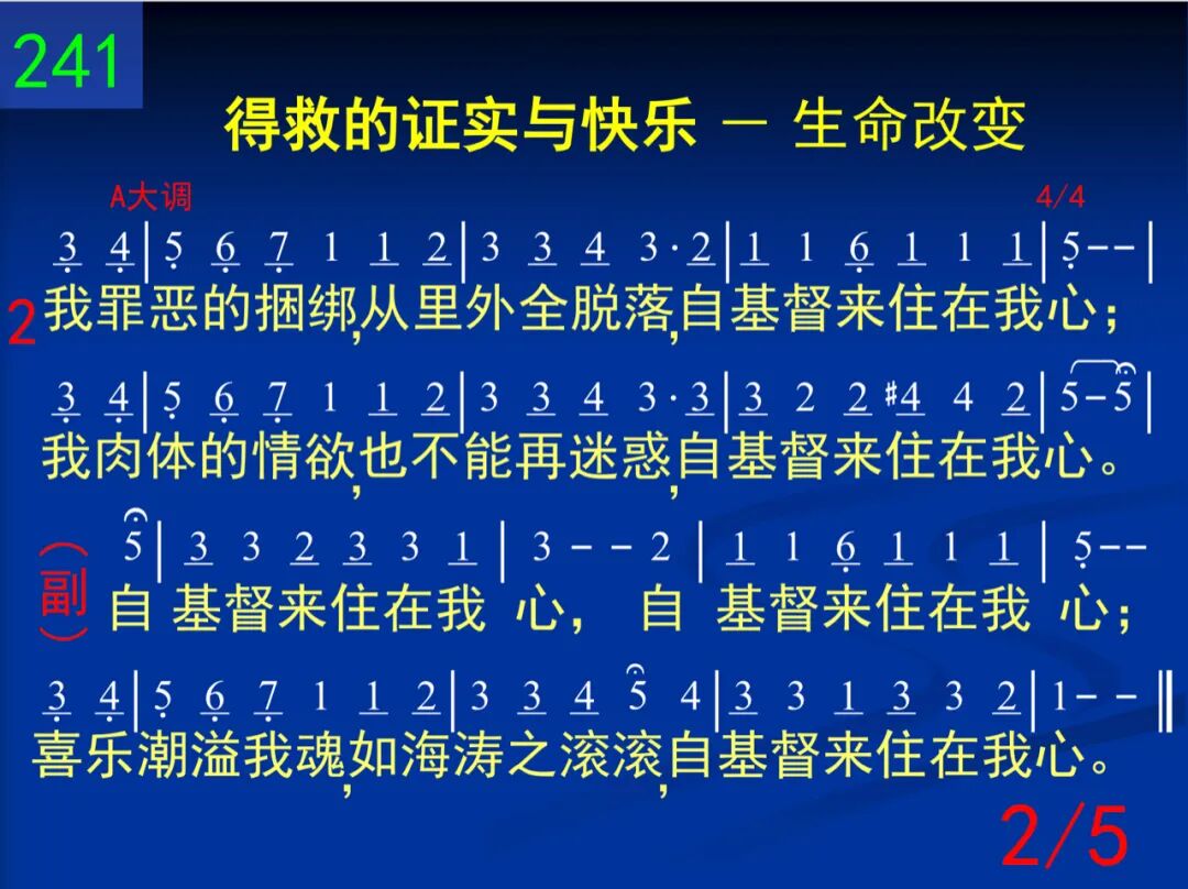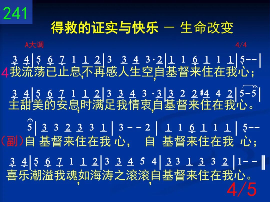 我生命有何等奇妙的大改变,自基督来住在我心;神荣耀的光辉,照耀在我魂间,自基督来住在我心。 自基督来住在我心,自基督来住在我心;喜乐潮溢我魂,如海涛之滚滚,自基督来住在我心。 二 我罪恶的捆绑,从里外全脱落,自基督来住在我心;我肉体的情欲,也不能再迷惑,自基督来住在我心。 自基督来住在我心,自基督来住在我心;喜乐潮溢我魂,如海涛之滚滚,自基督来住在我心。 三 这世界的福乐,既变色,又失味,自基督来住在我心;我今生的忧虑,也不能再缠累,自基督来住在我心。 自基督来住在我心,自基督来住在我心;喜乐潮溢我魂,如海涛之滚滚,自基督来住在我心。 四 我流荡已止息,不再感人生空,自基督来住在我心;主甜美的安息,时满足我情衷,自基督来住在我心。 自基督来住在我心,自基督来住在我心;喜乐潮溢我魂,如海涛之滚滚,自基督来住在我心。 五 往日事都已过,永不再恋旧途,自基督来住在我心;那有福的盼望,吸引我奔义路,自基督来住在我心。 自基督来住在我心,自基督来住在我心;喜乐潮溢我魂,如海涛之滚滚,自基督来住在我心。