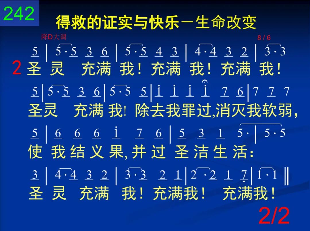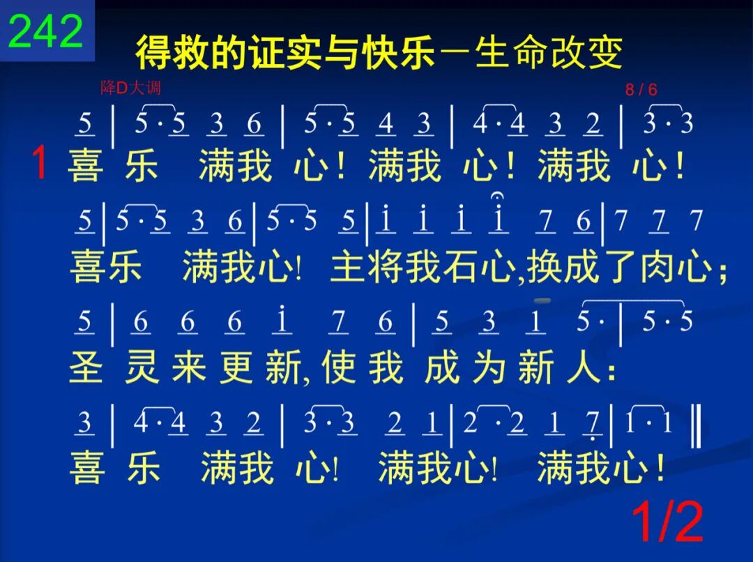 喜乐满我心!满我心!满我心!喜乐满我心!主将我石心,换成了肉心;圣灵来更新,使我成为新人:喜乐满我心!满我心!满我心! 二 圣灵充满我!充满我!充满我!圣灵充满我!除去我罪过,消灭我软弱,使我结义果,并过圣洁生活:圣灵充满我!充满我!充满我!