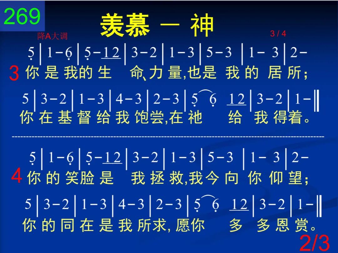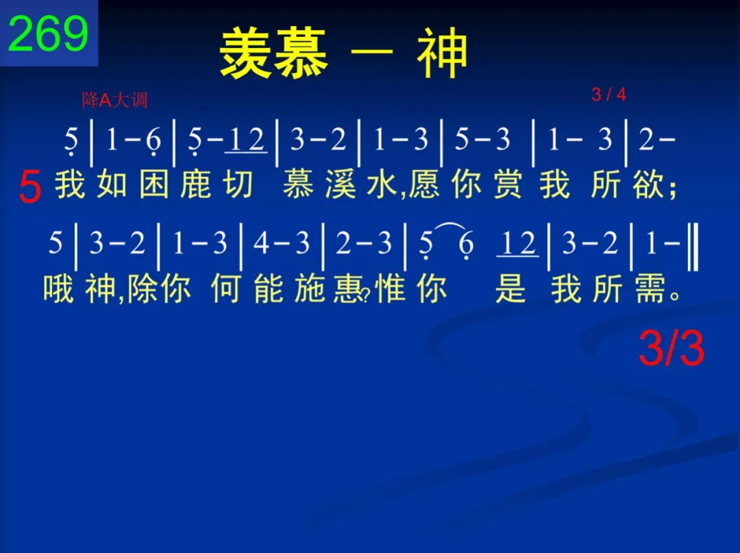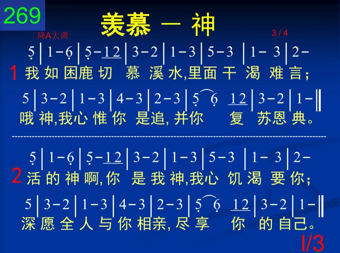 我如困鹿切慕溪水,里面干渴难言;哦神,我心惟你是追,并你复苏恩典。 二 活的神阿,你是我神,我心饥渴要你;深愿全人与你相亲,尽享你的自己。 三 你是我的生命、力量,也是我的居所;你在基督给我饱尝,在祂给我得着。 四 你的笑脸是我拯救,我今向你仰望;你的同在是我所求,愿你多多恩赏。 五 我如困鹿切慕溪水,愿你赏我所欲;哦神,除你何能施惠?惟你是我所需。