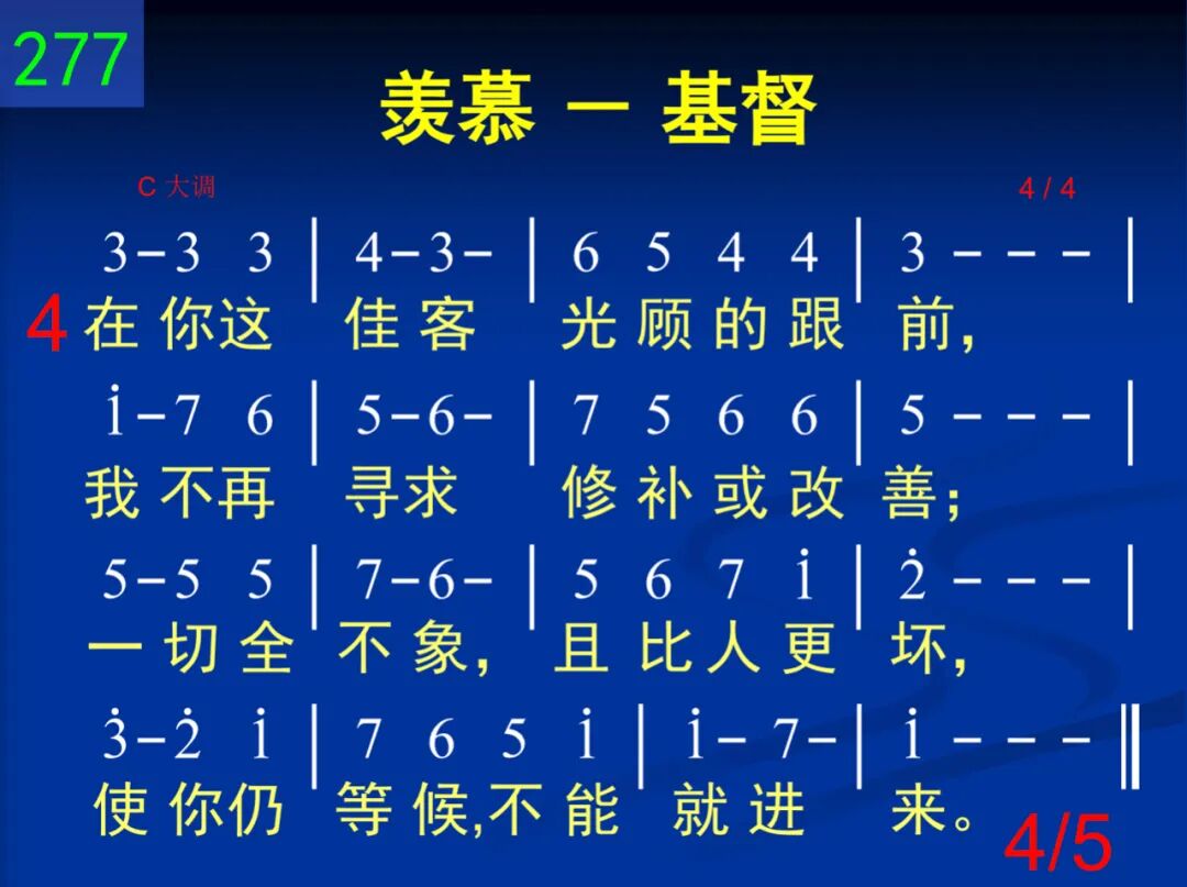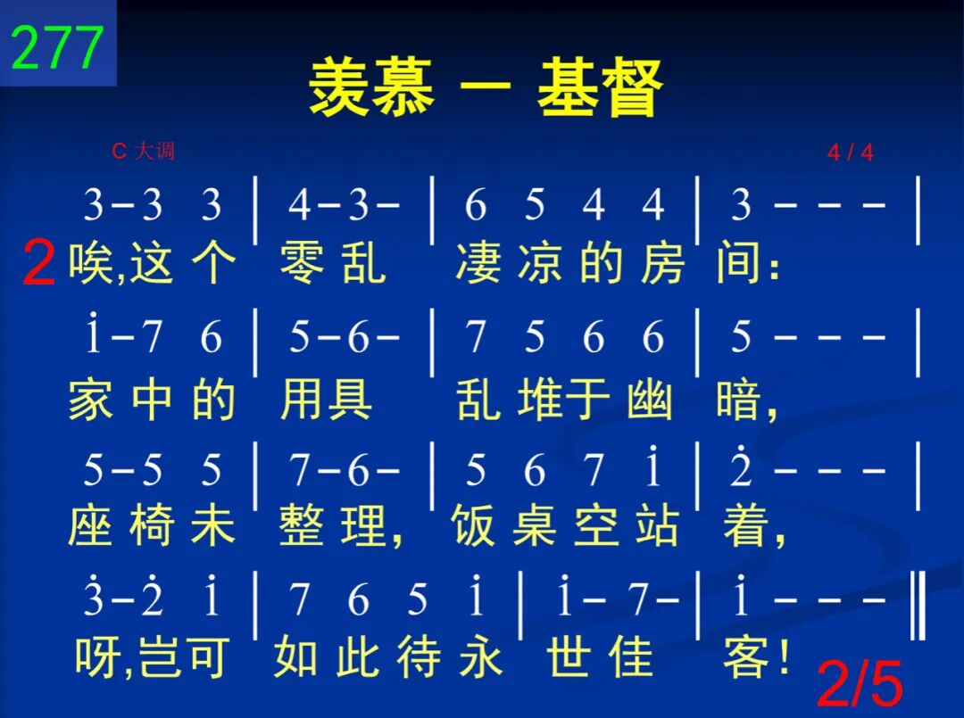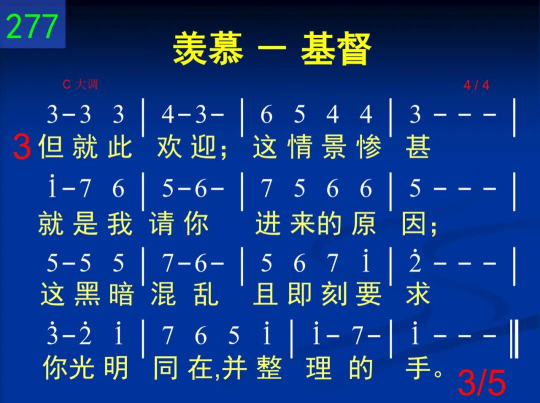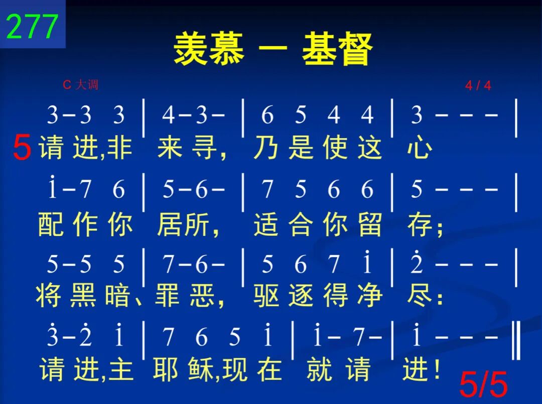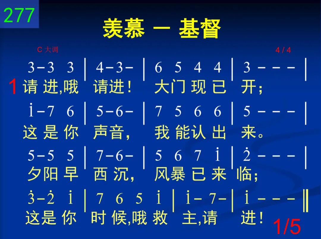 请进,哦请进!大门现已开;这是你声音,我能认出来。夕阳早西沉,风暴已来临;这是你时候,哦救主,请进! 二 唉,这个零乱凄凉的房间:家中的用具乱堆于幽暗,座椅未整理,饭桌空站着,呀,岂可如此待永世佳客! 三 但就此欢迎;这情景惨甚就是我请你进来的原因;这黑暗混乱且即刻要求你光明同在,并整理的手。 四 在你这佳客光顾的跟前,我不再寻求修补或改善;一切全不像,且比人更坏,使你仍等候,不能就进来。 五 请进,非来寻,乃是使这心配作你居所,适合你留存;将黑暗、罪恶,驱逐得净尽:请进,主耶稣,现在就请进!