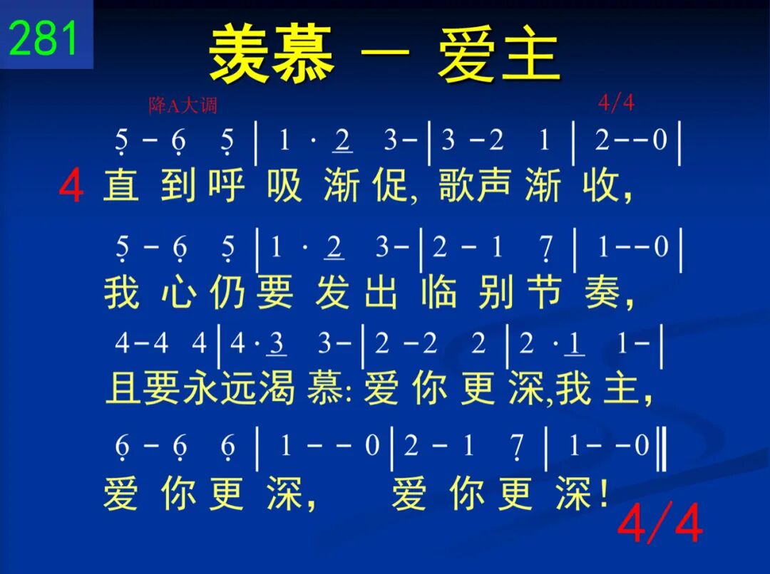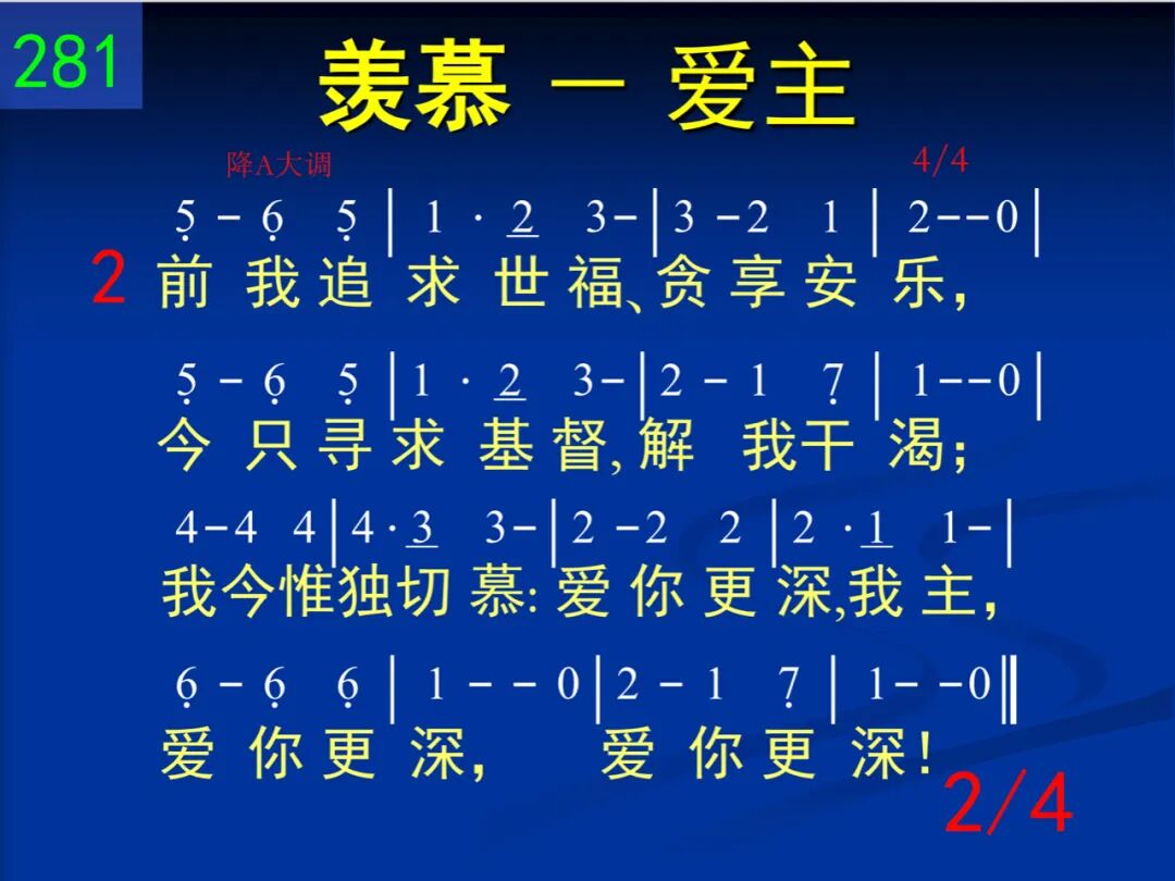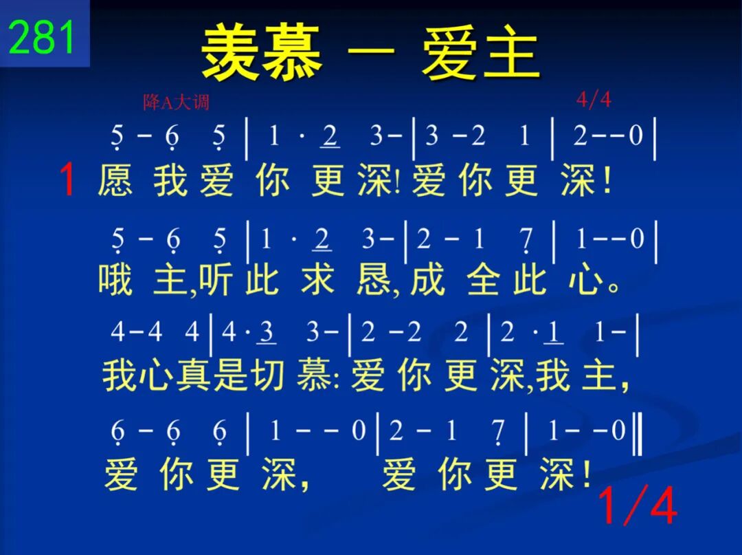 愿我爱你更深!爱你更深!哦主,听此求恳,成全此心。我心真是切慕:爱你更深,我主,爱你更深,爱你更深! 二 前我追求世福、贪享安乐,今只寻求基督,解我干渴;我今惟独切慕:爱你更深,我主,爱你更深,爱你更深! 三 哦,让痛苦、伤悲,将我试炼;你的使者何美!其歌何甜!我同他们唱出:爱你更深,我主,爱你更深,爱你更深! 四 直到呼吸渐促,歌声渐收,我心仍要发出临别节奏,且要永远渴慕:爱你更深,我主,爱你更深,爱你更深!