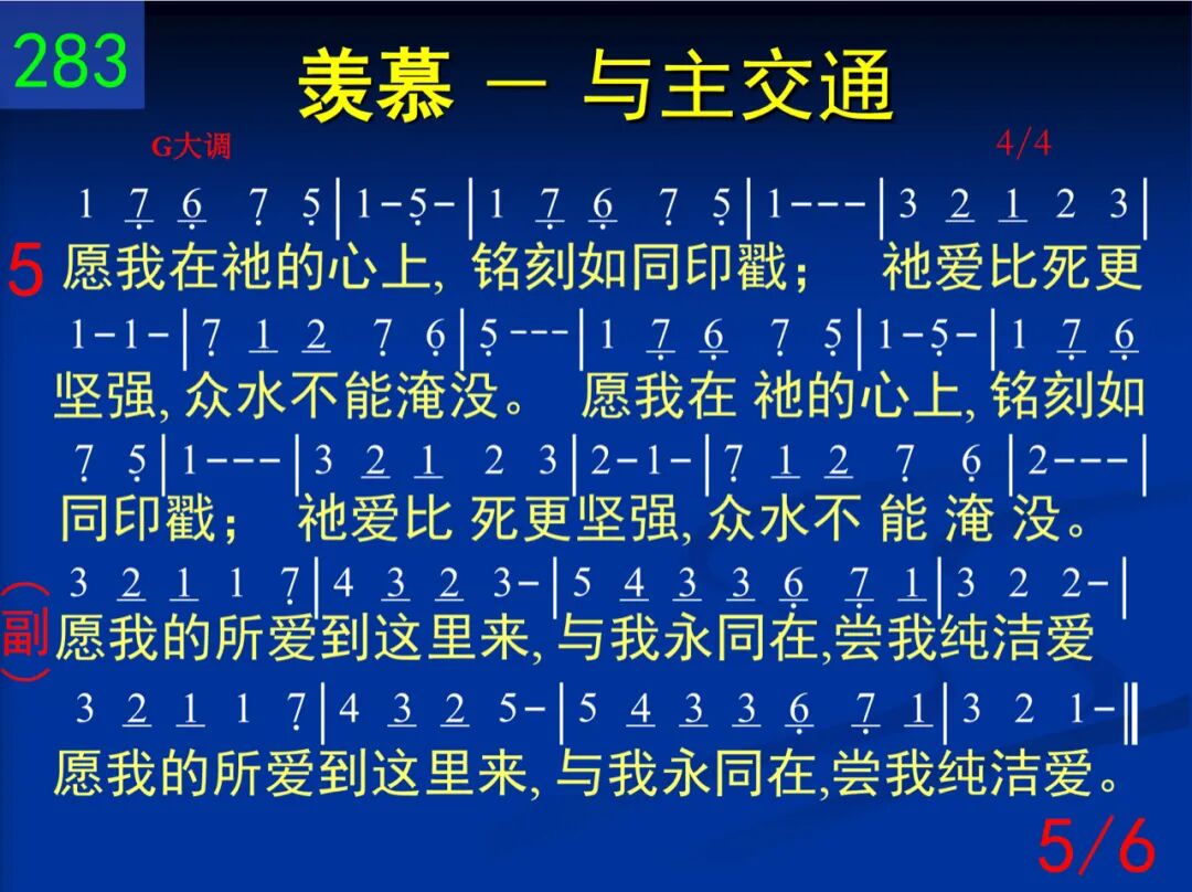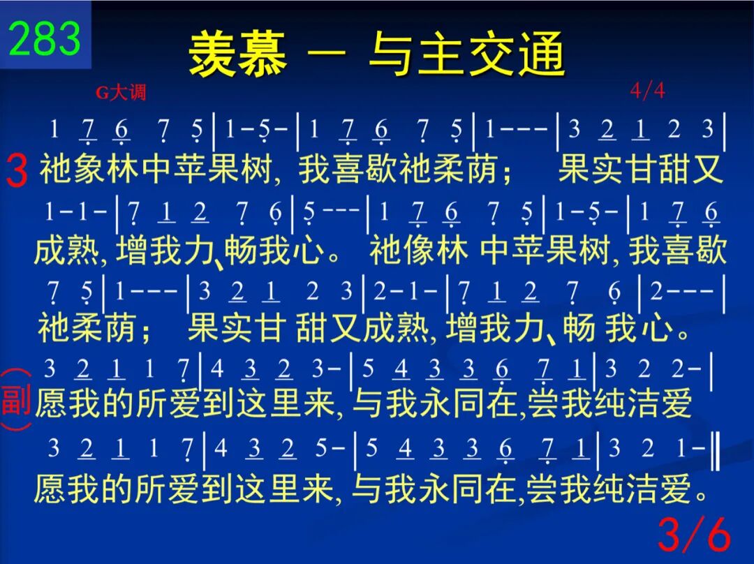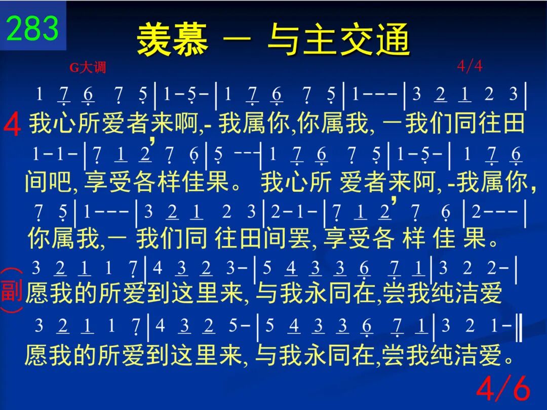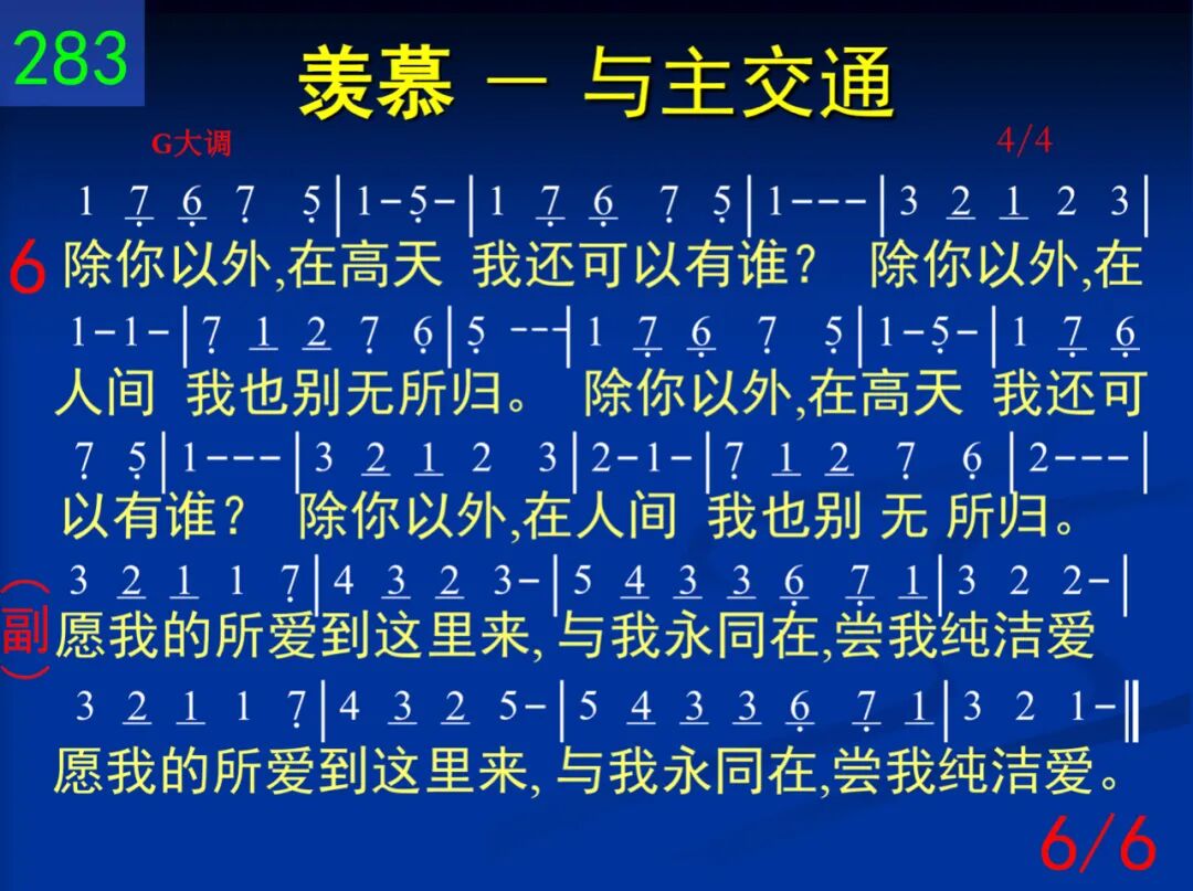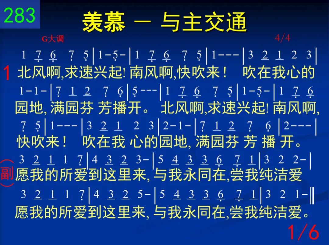 北风阿,求速兴起!南风阿,快吹来!吹在我心的园地,满园芬芳播开。 愿我的所爱到这里来,与我永同在,尝我纯洁爱。愿我的所爱到这里来,与我永同在,尝我纯洁爱。 二 哪哒香膏浇祂头,秀丽发擦祂脚;正当王坐席时候,满屋馨香四飘。 愿我的所爱到这里来,与我永同在,尝我纯洁爱。愿我的所爱到这里来,与我永同在,尝我纯洁爱。 三 祂像林中苹果树,我喜歇祂柔荫;果实甘甜又成熟,增我力、畅我心。 愿我的所爱到这里来,与我永同在,尝我纯洁爱。愿我的所爱到这里来,与我永同在,尝我纯洁爱。 四 我心所爱者,来阿,─我属你,你属我,─我们同往田间罢,享受各样佳果。 愿我的所爱到这里来,与我永同在,尝我纯洁爱。愿我的所爱到这里来,与我永同在,尝我纯洁爱。 五 愿我在祂的心上,铭刻如同印戳;祂爱比死更坚强,众水不能淹没。 愿我的所爱到这里来,与我永同在,尝我纯洁爱。愿我的所爱到这里来,与我永同在,尝我纯洁爱。 六 除你以外,在高天我还可以有谁?除你以外,在人间我也别无所归。 愿我的所爱到这里来,与我永同在,尝我纯洁爱。愿我的所爱到这里来,与我永同在,尝我纯洁爱。