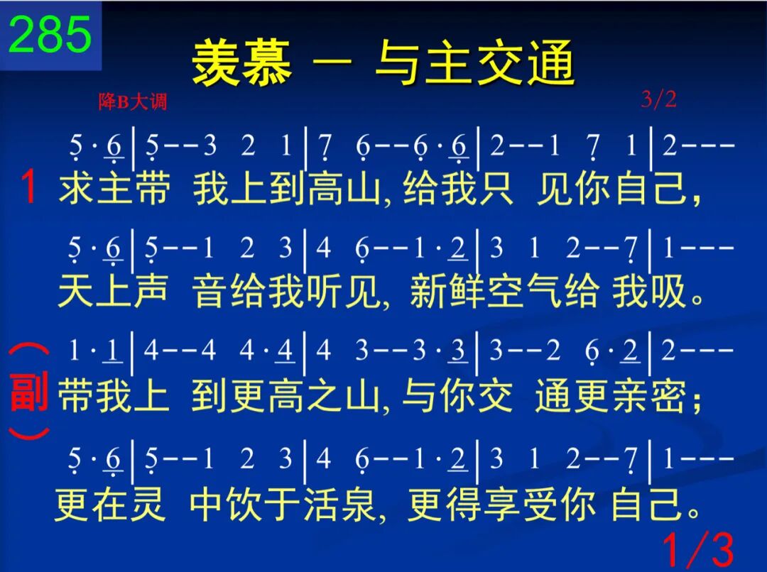求主带我上到高山,给我只见你自己,天上声音给我听见,新鲜空气给我吸。 带我上到更高之山,与你交通更亲密;更在灵中饮于活泉,更得享受你自己。 二 更高山上,更高亮光,远超属地的遮蔽;生命之中与你同王,脱开挣扎的自己。 带我上到更高之山,与你交通更亲密;更在灵中饮于活泉,更得享受你自己。 三 保守我在更高山上,向着标竿直往前;直到模成你的形像,流露你爱和恩典。 带我上到更高之山,与你交通更亲密;更在灵中饮于活泉,更得享受你自己。