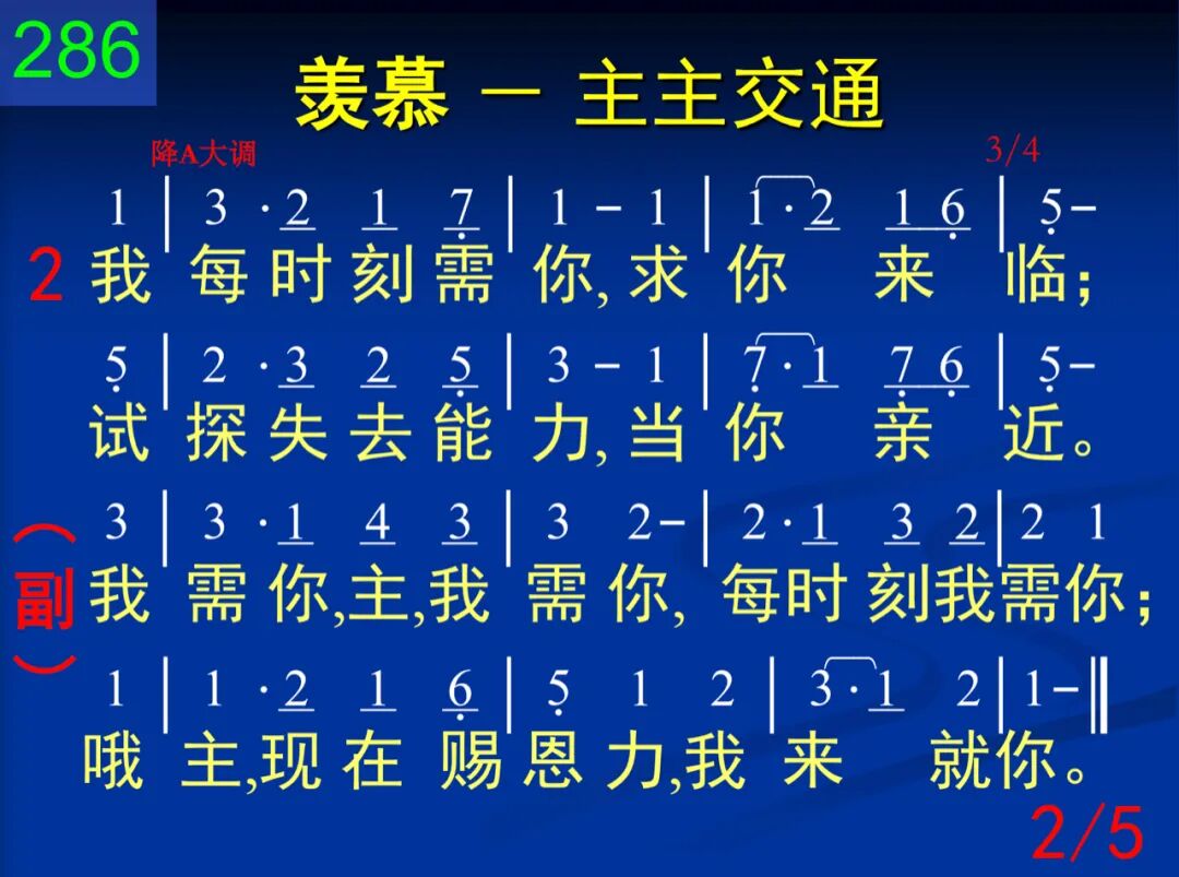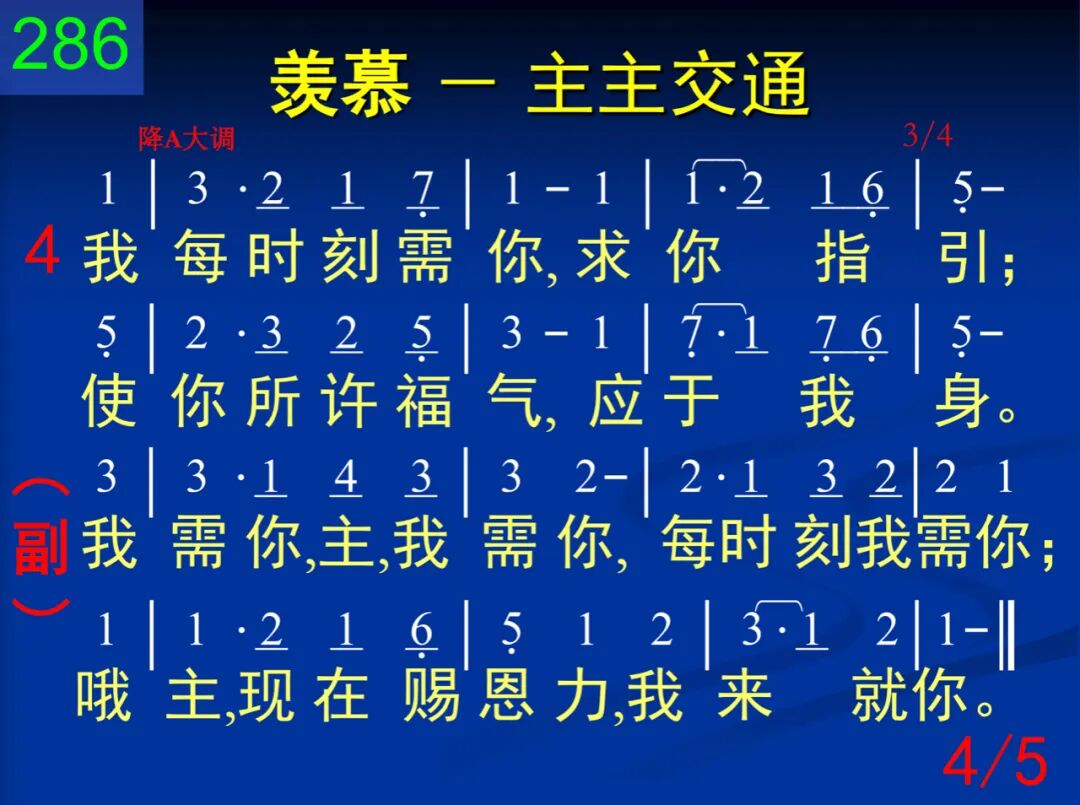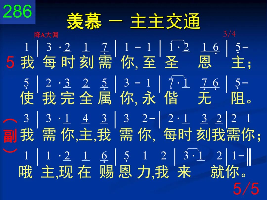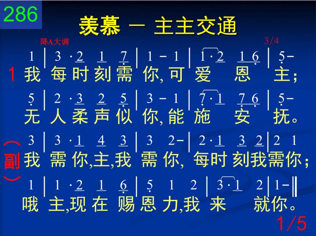 我每时刻需你,可爱恩主;无人柔声似你,能施安抚。 我需你,主,我需你,每时刻我需你;哦主,现在赐恩力,我来就你。 二 我每时刻需你,求你来临;试探失去能力,当你亲近。 我需你,主,我需你,每时刻我需你;哦主,现在赐恩力,我来就你。 三 我每时刻需你,或乐或苦;速来住留不离,免我虚度。 我需你,主,我需你,每时刻我需你;哦主,现在赐恩力,我来就你。 四 我每时刻需你,求你指引;使你所许福气,应于我身。 我需你,主,我需你,每时刻我需你;哦主,现在赐恩力,我来就你。 五 我每时刻需你,至圣恩主;使我完全属你,永偕无阻。 我需你,主,我需你,每时刻我需你;哦主,现在赐恩力,我来就你。