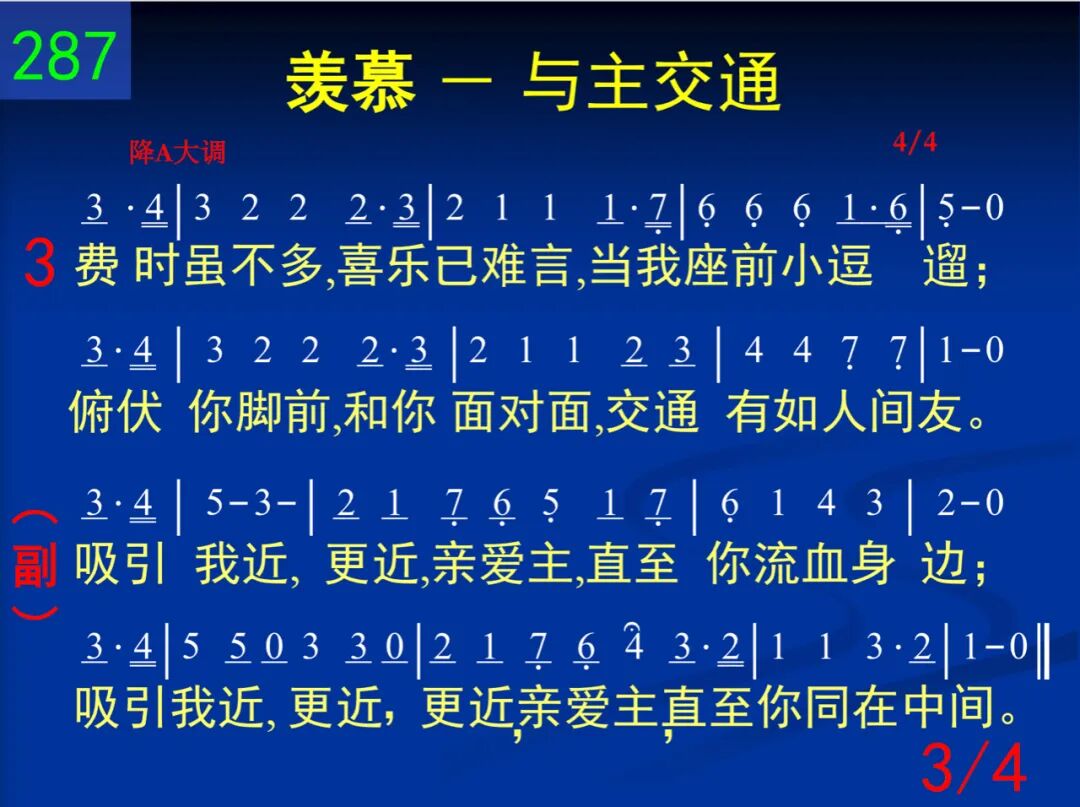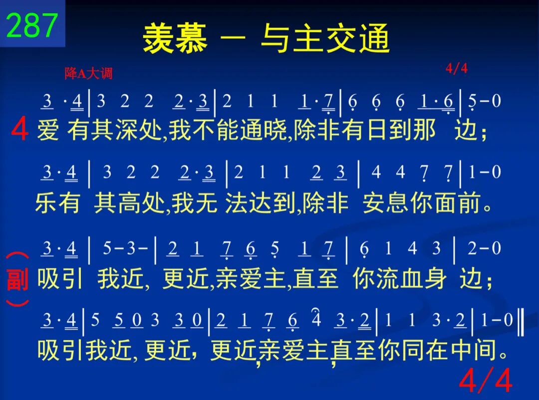 主,我是属你,我听你宣告,知你爱我的无匹;但我是渴望能因信升高,能以和你更亲密。 吸引我近,更近,亲爱主,直至你流血身边;吸引我近,更近,更近,亲爱主,直至你同在中间。 二 靠着你恩典,求你分别我,从此专一事奉你;让我灵望你,有坚定把握,我志消失你旨里。 吸引我近,更近,亲爱主,直至你流血身边;吸引我近,更近,更近,亲爱主,直至你同在中间。 三 费时虽不多,喜乐已难言,当我座前小逗遛;俯伏你脚前,和你面对面,交通有如人间友。 吸引我近,更近,亲爱主,直至你流血身边;吸引我近,更近,更近,亲爱主,直至你同在中间。 四 爱有其深处,我不能通晓,除非有日到那边;乐有其高处,我无法达到,除非安息你面前。 吸引我近,更近,亲爱主,直至你流血身边;吸引我近,更近,更近,亲爱主,直至你同在中间。