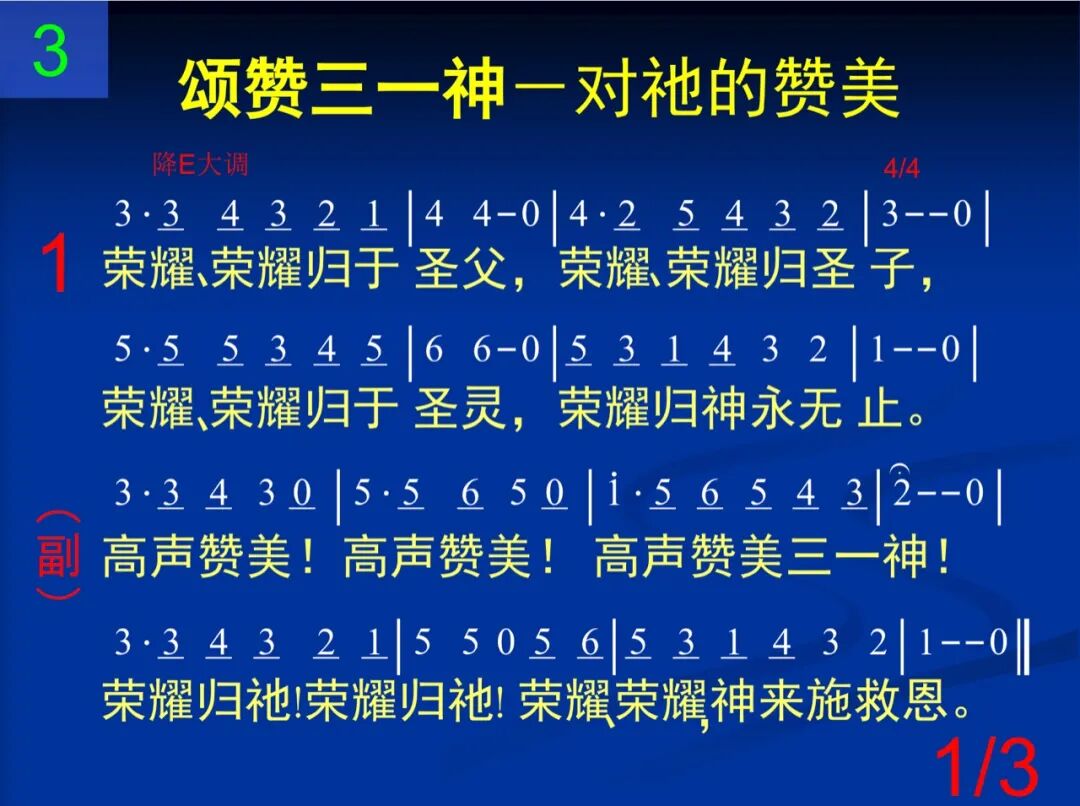 荣耀、荣耀归于圣父,荣耀、荣耀归圣子,荣耀、荣耀归于圣灵,荣耀归神永无止。