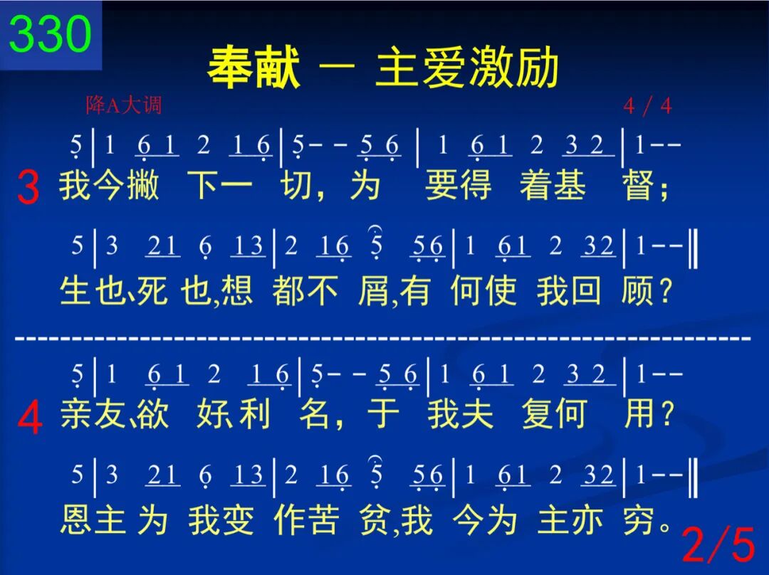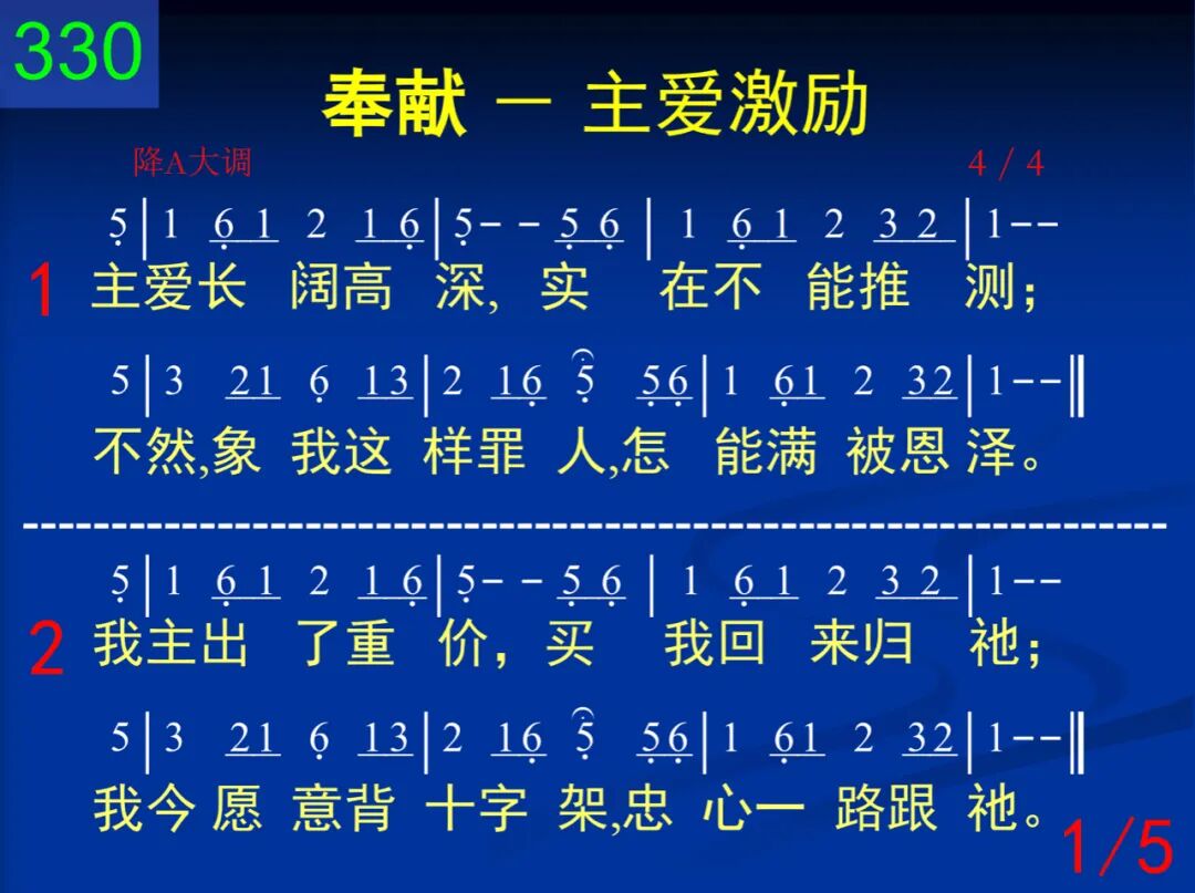 主爱长阔高深,实在不能推测;不然,像我这样罪人,怎能满被恩泽。 二 我主出了重价,买我回来归祂;我今愿意背十字架,忠心一路跟祂。 三 我今撇下一切,为要得着基督;生也、死也,想都不屑,有何使我回顾? 四 亲友、欲好、利名,于我夫复何用?恩主为我变作苦贫,我今为主亦穷。 五 我爱我的救主,我求祂的称是;为祂之故,安逸变苦,利益变为损失! 六 你是我的安慰,我的恩主耶稣!除你之外,在天何归?在地何所爱慕? 七 艰苦、反对、飘零,我今一起不理;只求我主用你爱情,绕我灵、魂、身体。 七 主阿,我今求你,施恩引导小子,立在我旁,常加我力,过此黑暗罪世。 九 撒但、世界、肉体,时常试探、欺凌;你若不加小子能力,恐将贻羞你名! 十 现今时候不多,求主使我脱尘;你一再来,我即唱说:阿利路亚!阿们!