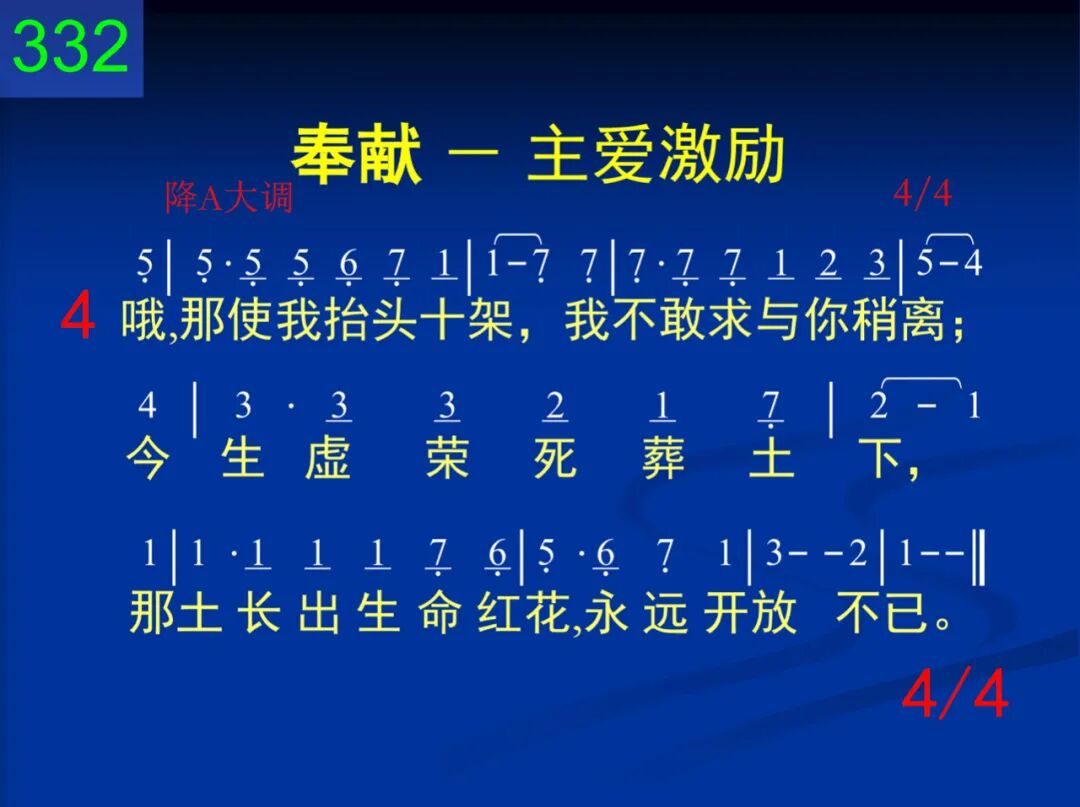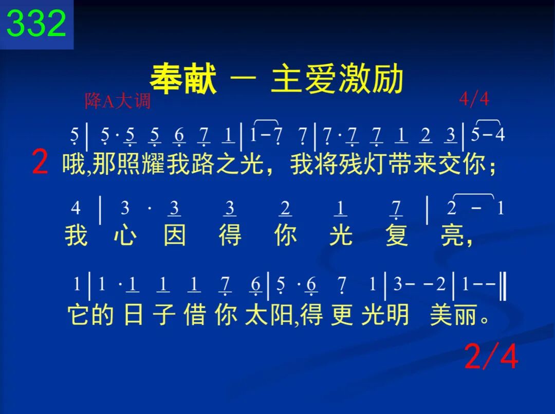 哦,那不肯放我之爱,我将疲魂安息于你;我把所欠余生归来,好使它在你这深海,得更丰满洋溢。 二 哦,那照耀我路之光,我将残灯带来交你;我心因得你光复亮,它的日子藉你太阳,得更光明美丽。 三 哦,那苦中寻我之乐,我心不能向你关闭;我在雨中彩虹寻得,知你应许不会空说,天亮便无泪涕。 四 哦,那使我抬头十架,我不敢求与你稍离;今生虚荣死葬土下,那土长出生命红花,永远开放不已。
