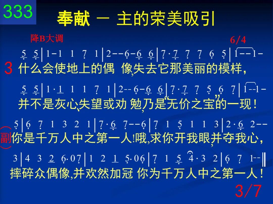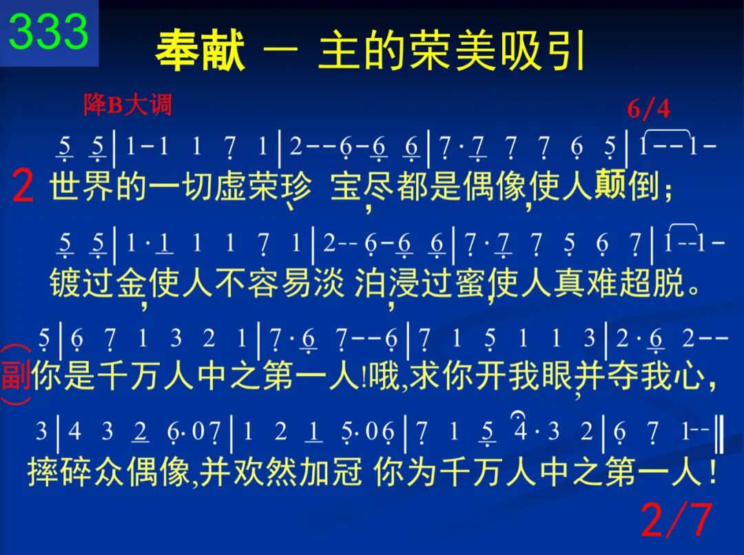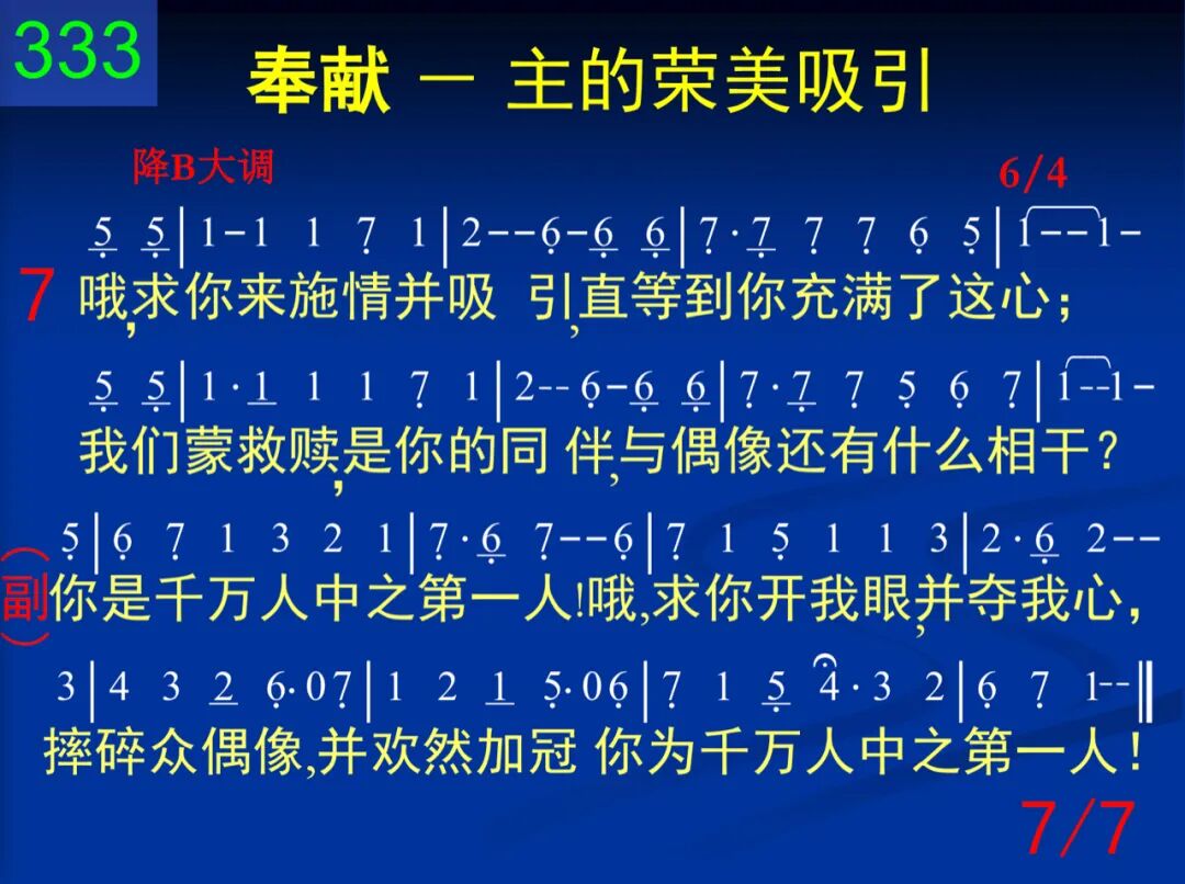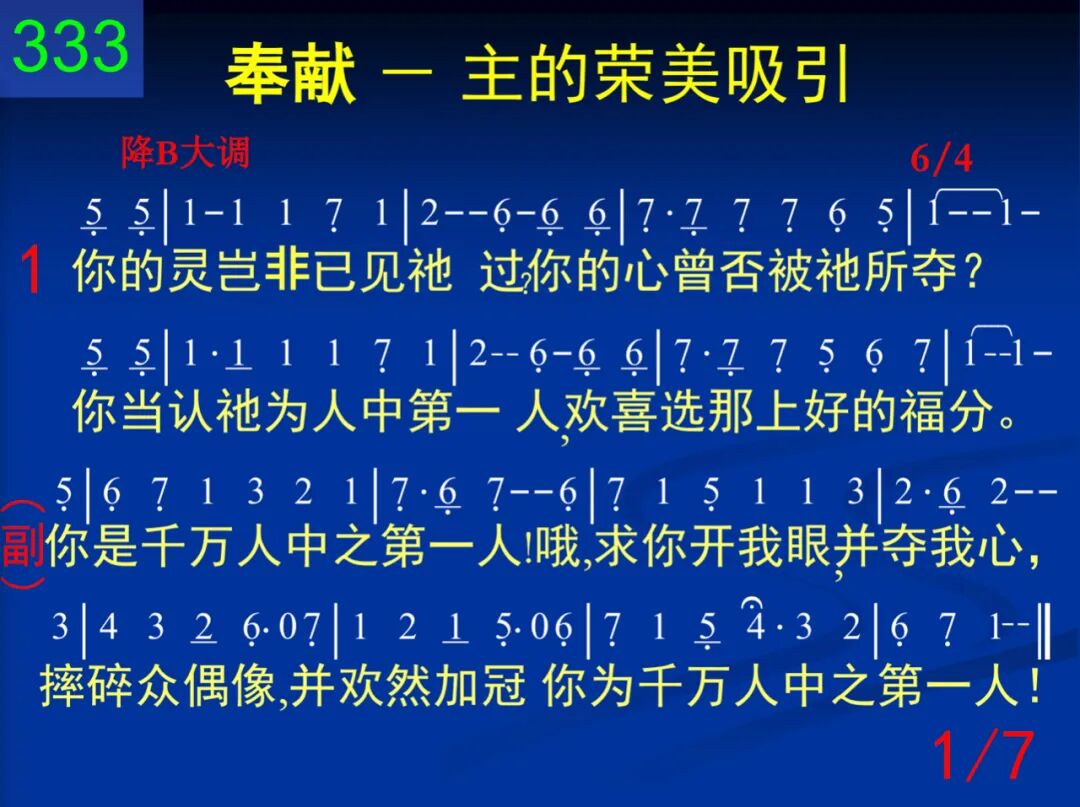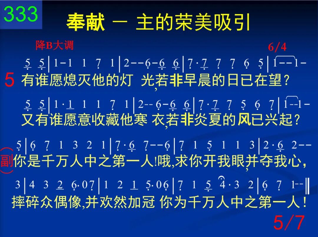 你的灵岂非已见祂过?你的心曾否被祂所夺?你当认祂为人中第一人,欢喜选那上好的福分。 你是千万人中之第一人!哦,求你开我眼,并夺我心,摔碎众偶像,并欢然加冠你为千万人中之第一人! 二 世界的一切虚荣、珍宝,尽都是偶像,使人颠倒;镀过金,使人不容易淡泊,浸过蜜,使人真难超脱。 你是千万人中之第一人!哦,求你开我眼,并夺我心,摔碎众偶像,并欢然加冠你为千万人中之第一人! 三 什么会使地上的偶像,失去它那美丽的模样,并不是灰心、失望或劝勉,乃是“无价之宝”的一现! 你是千万人中之第一人!哦,求你开我眼,并夺我心,摔碎众偶像,并欢然加冠你为千万人中之第一人! 四 并不是什么本分催促,就会使偶像化成灰土;乃是祂荣耀美丽的倾投,并祂心里柔爱的流露。 你是千万人中之第一人!哦,求你开我眼,并夺我心,摔碎众偶像,并欢然加冠你为千万人中之第一人! 五 有谁愿熄灭他的灯光,若非早晨的日已在望?又有谁愿意收藏他寒衣,若非炎夏的风已兴起? 你是千万人中之第一人!哦,求你开我眼,并夺我心,摔碎众偶像,并欢然加冠你为千万人中之第一人! 六 惟有彼得所见的泪眼,司提反所仰望的荣脸,陪着马利亚同哭的慈心,会使我脱离地的吸引。 你是千万人中之第一人!哦,求你开我眼,并夺我心,摔碎众偶像,并欢然加冠你为千万人中之第一人! 七 哦,求你来施情并吸引,直等到你充满了这心;我们蒙救赎,是你的同伴,与偶像还有什么相干? 你是千万人中之第一人!哦,求你开我眼,并夺我心,摔碎众偶像,并欢然加冠你为千万人中之第一人!