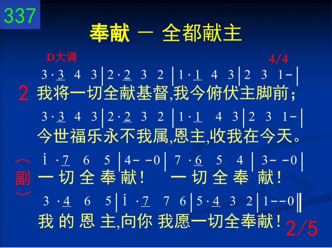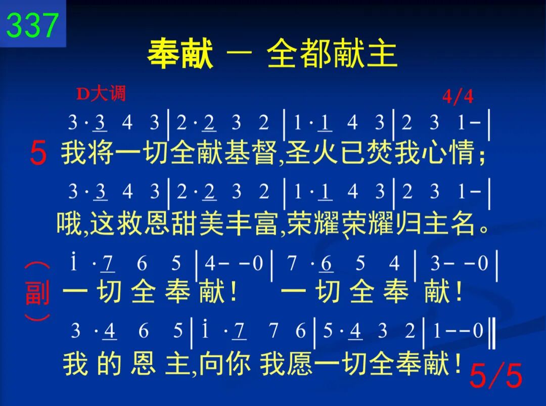 我将一切全献基督,全献恩主心甘愿;我要永远爱主,随主,天天活在主面前。 一切全奉献!一切全奉献!我的恩主,向你我愿一切全奉献! 二 我将一切全献基督,我今俯伏主脚前;今世福乐永不我属,恩主,收我在今天。 一切全奉献!一切全奉献!我的恩主,向你我愿一切全奉献! 三 我将一切全献基督,恩主,将我全得着。惟愿圣灵从我证出:我是属主,主属我。 一切全奉献!一切全奉献!我的恩主,向你我愿一切全奉献! 四 我将一切全献基督,主,我愿作你器皿;恩惠、能力充我如注,显明你生在我身。 一切全奉献!一切全奉献!我的恩主,向你我愿一切全奉献! 五 我将一切全献基督,圣火已焚我心情;哦,这救恩甜美丰富,荣耀、荣耀归主名。