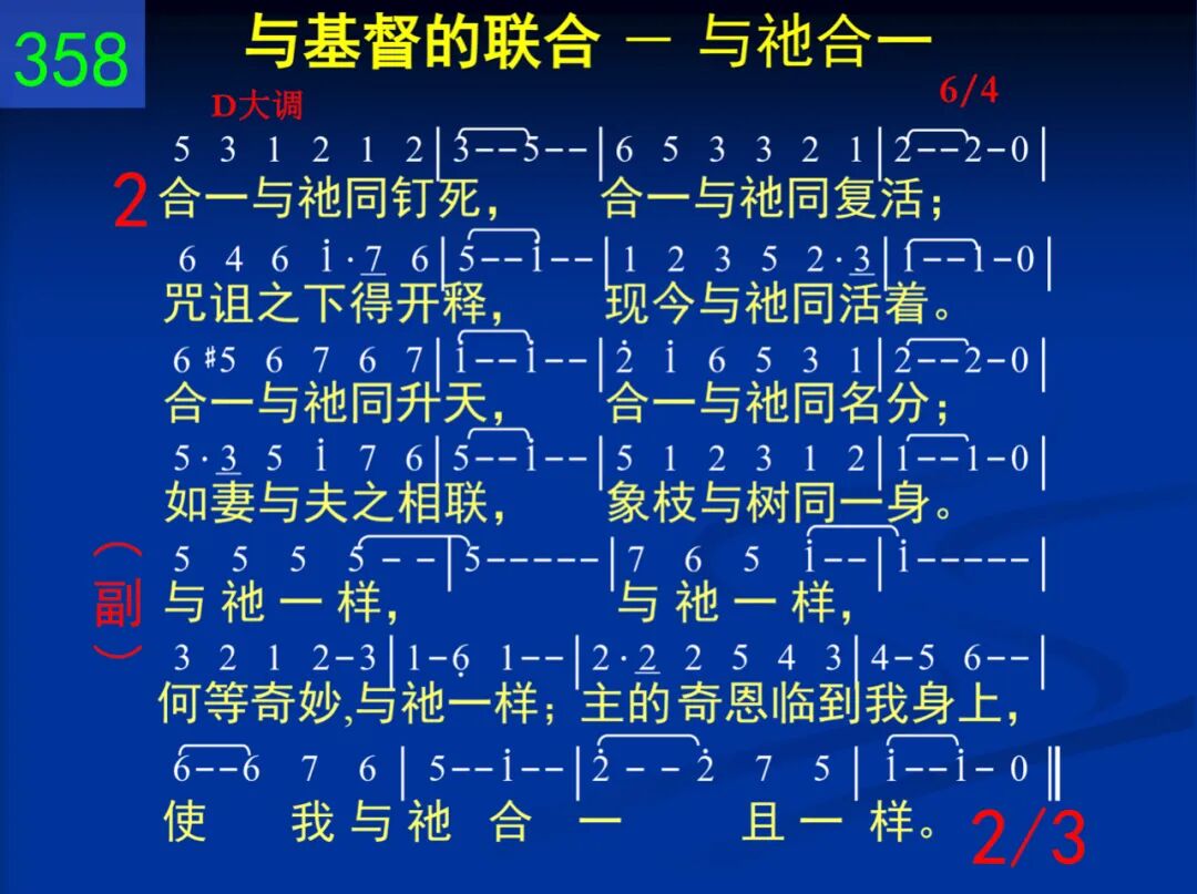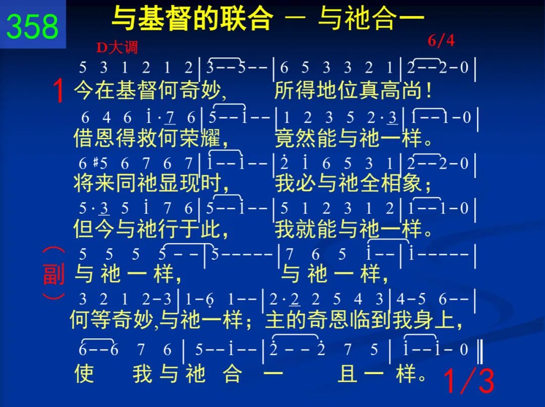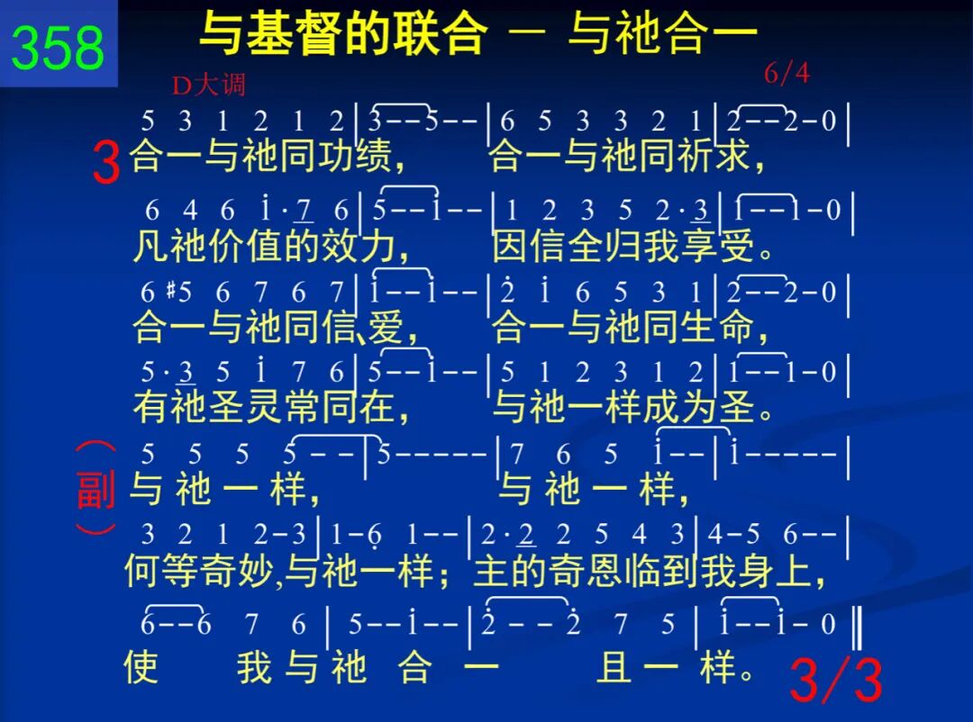 今在基督何奇妙,所得地位真高尚!藉恩得救何荣耀,竟然能与祂一样。将来同祂显现时,我必与祂全相像;但今与祂行于此,我就能与祂一样。 与祂一样,与祂一样,何等奇妙,与祂一样;主的奇恩临到我身上,使我与祂合一且一样。 二 合一与祂同钉死,合一与祂同复活;咒诅之下得开释,现今与祂同活着。合一与祂同升天,合一与祂同名分;如妻与夫之相联,像枝与树同一身。 与祂一样,与祂一样,何等奇妙,与祂一样;主的奇恩临到我身上,使我与祂合一且一样。 三 合一与祂同功绩,合一与祂同祈求,凡祂价值的效力,因信全归我享受。合一与祂同信、爱,合一与祂同生命,有祂圣灵常同在,与祂一样成为圣。 与祂一样,与祂一样,何等奇妙,与祂一样;主的奇恩临到我身上,使我与祂合一且一样。