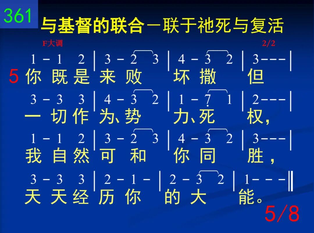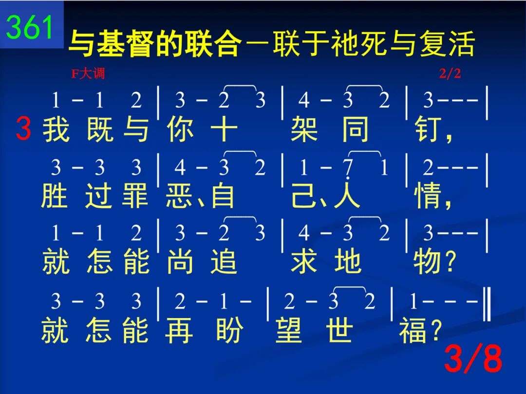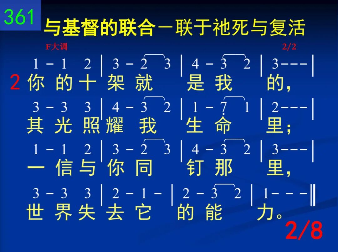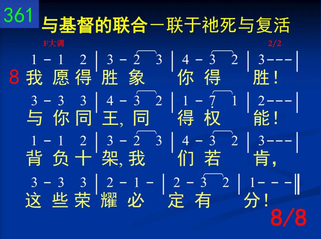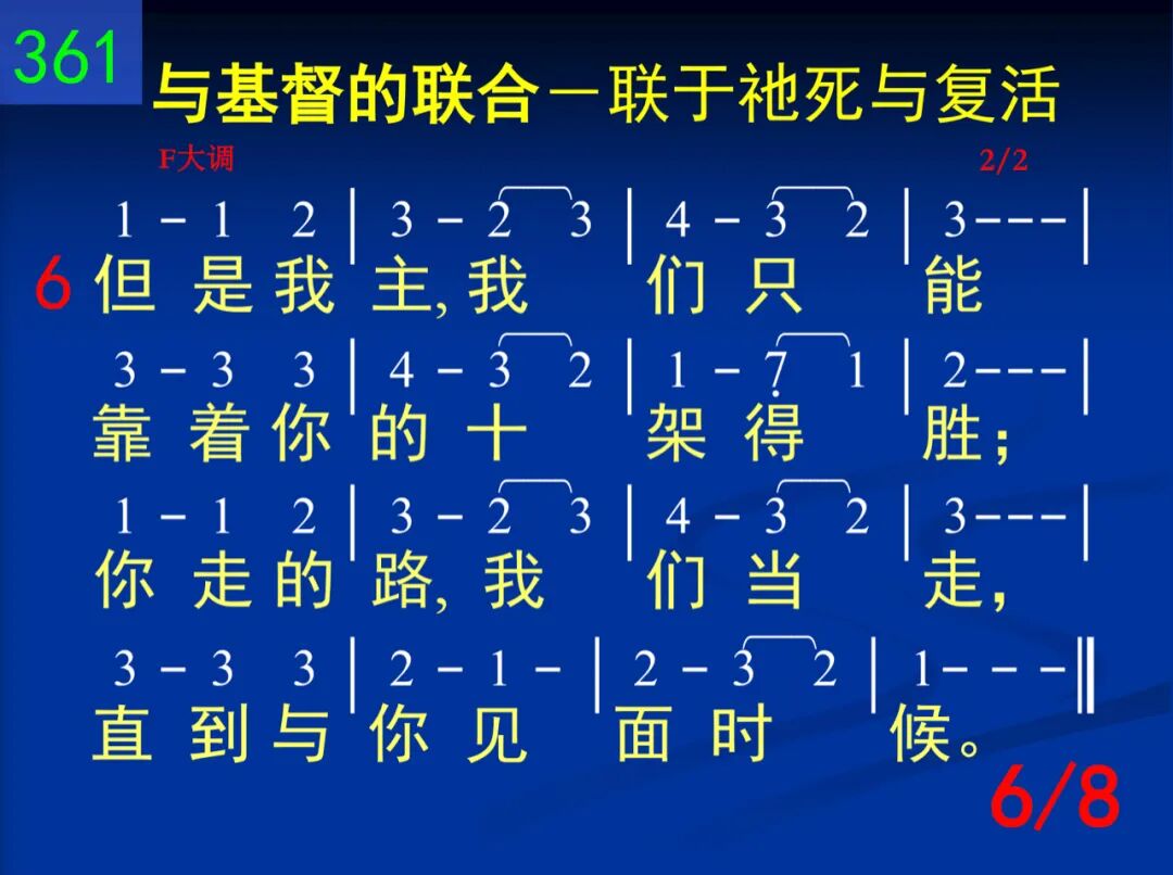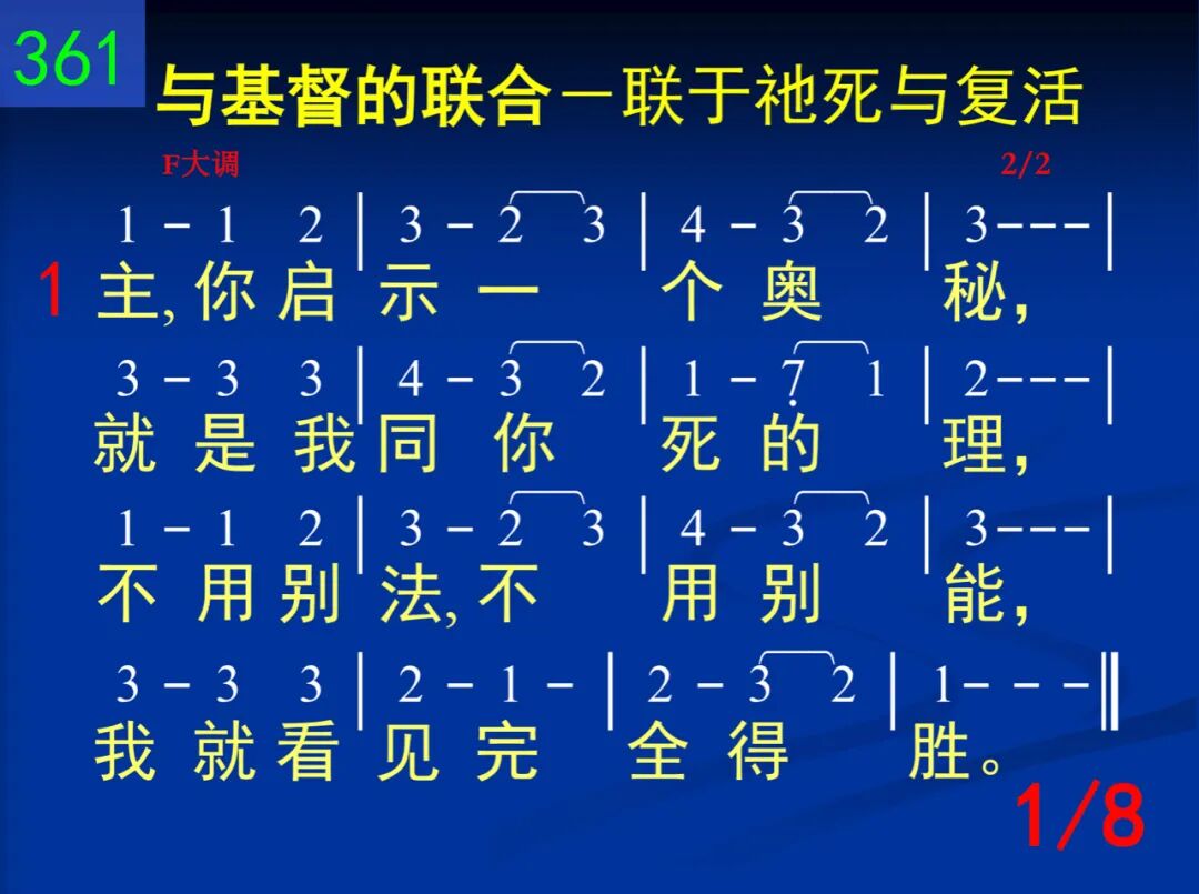 主,你启示一个奥秘,就是我同你死的理,不用别法,不用别能,我就看见完全得胜。 二 你的十架就是我的,其光照耀我生命里;一信与你同钉那里,世界失去它的能力。 三 我既与你十架同钉,胜过罪恶、自己、人情,就怎能尚追求地物?就怎能再盼望世福? 四 因此,我便到你那里,与你同站十架死地,你命、你权,全是我的,因我与你合而为一。 五 你既是来败坏撒但一切作为、势力、死权,我自然可和你同胜,天天经历你的大能。 六 但是我主,我们只能靠着你的十架得胜;你走的路,我们当走,直到与你见面时候。 七 我今接受你的同钉,求你所赐永远的灵使我更懂你死意义,使我脱离罪、己、肉体。 八 我愿得胜像你得胜!与你同王,同得权能!背负十架,我们若肯,这些荣耀必定有分!