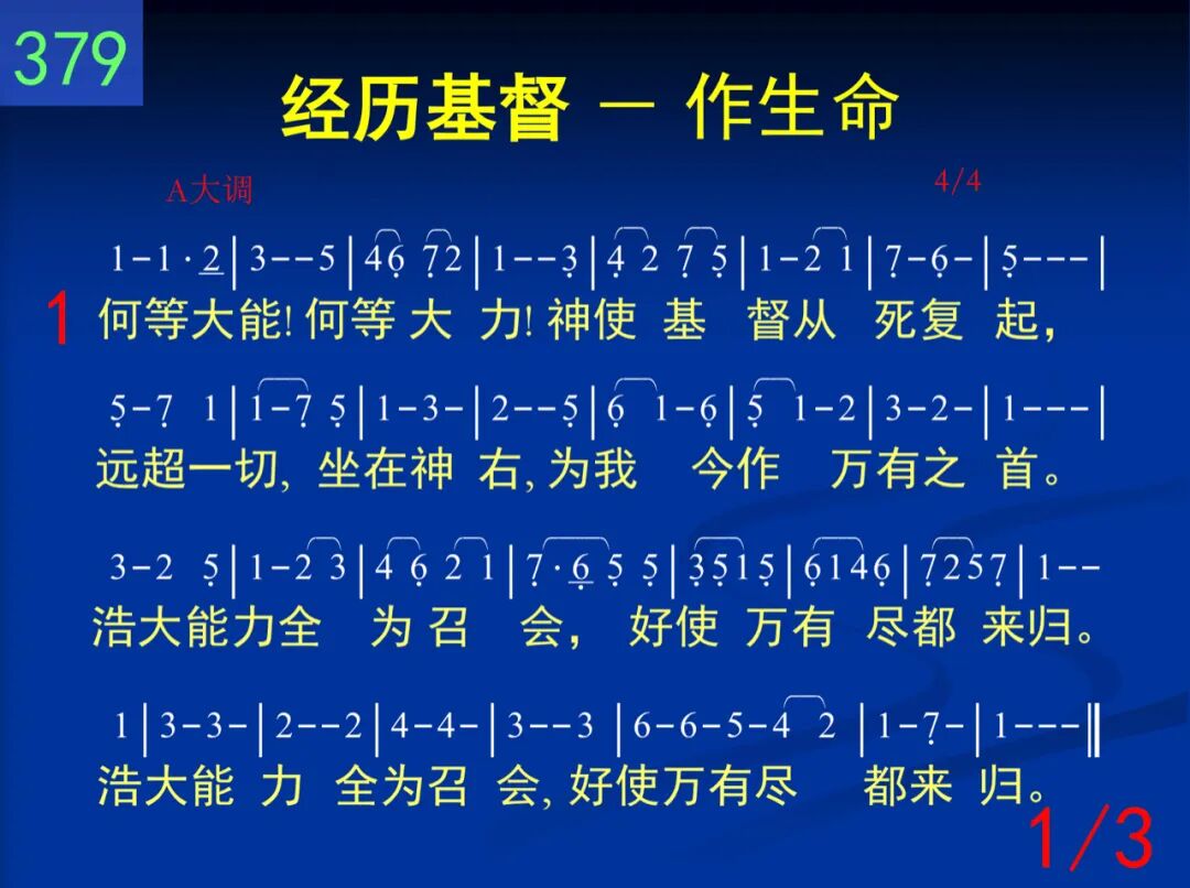 何等大能!何等大力!神使基督从死复起,远超一切,坐在神右,为我今作万有之首。浩大能力全为召会,好使万有尽都来归。浩大能力全为召会,好使万有尽都来归。 二 何等事实!何等奥秘!我今乃是基督肢体;与众圣徒彼此相调,新人里面同被建造;联于我们升天元首,作祂身体,照神所筹。联于我们升天元首,作祂身体,照神所筹。 三 何等高、深!何等长、阔!其度、其量无法测度!神的基督无限、无量,广大无边,超人所想。凡祂所是和祂所有,都是为将召会成就。凡祂所是和祂所有,都是为将召会成就。