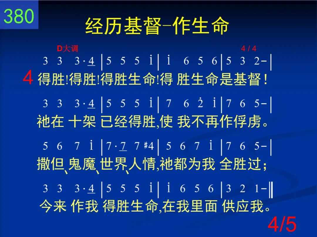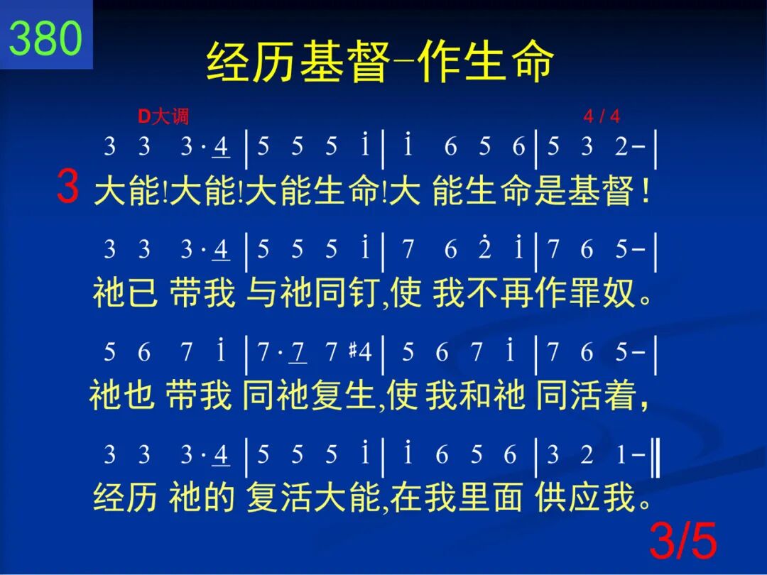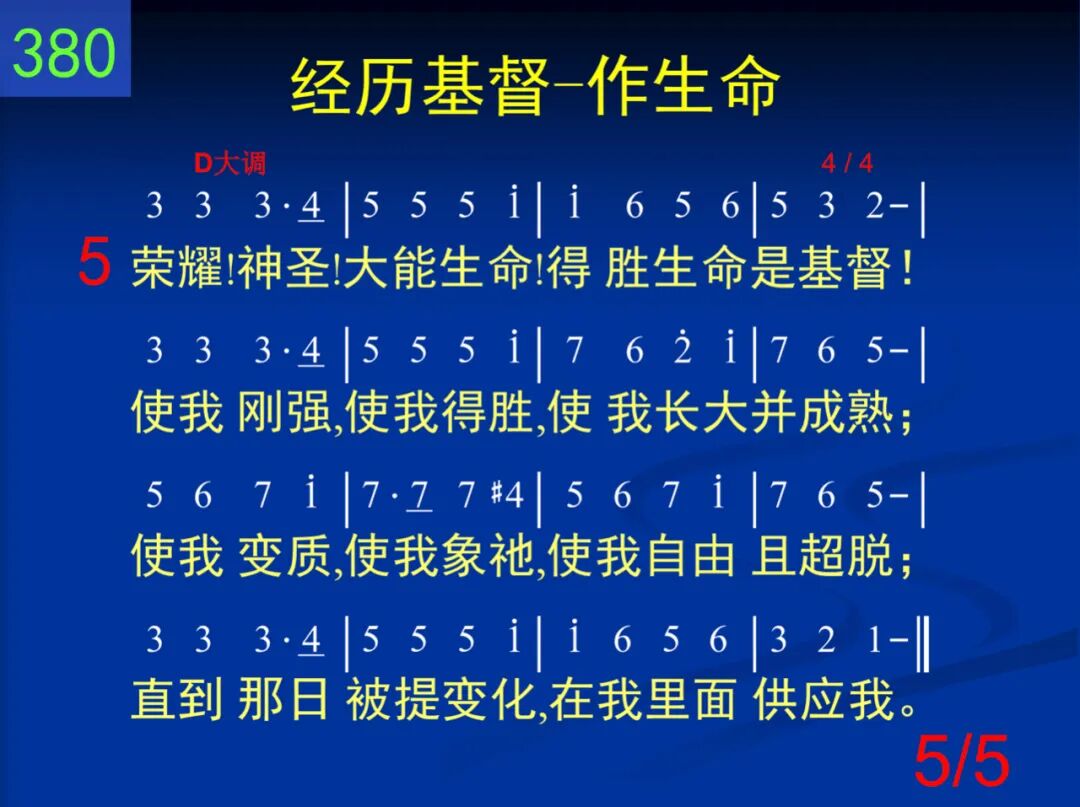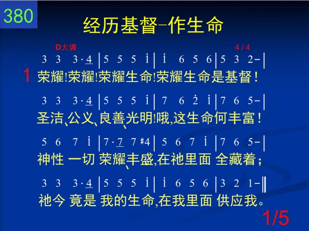 荣耀!荣耀!荣耀生命!荣耀生命是基督!圣洁、公义、良善、光明!哦,这生命何丰富!神性一切荣耀、丰盛,在祂里面全藏着;祂今竟是我的生命,在我里面供应我。 二 神圣!神圣!神圣生命!神圣生命是基督!祂已化身成为圣灵,到我里面来居住。感动、运行、光照、教训,如同膏油在涂抹,充满、浇灌、加力、滋润,在我里面供应我。 三 大能!大能!大能生命!大能生命是基督!祂已带我与祂同钉,使我不再作罪奴。祂也带我同祂复生,使我和祂同活着,经历祂的复活大能,在我里面供应我。 四 得胜!得胜!得胜生命!得胜生命是基督!祂在十架已经得胜,使我不再作俘虏。撒但、鬼魔、世界、人情,祂都为我全胜过;今来作我得胜生命,在我里面供应我。 五 荣耀!神圣!大能生命!得胜生命是基督!使我刚强,使我得胜,使我长大并成熟;使我变质,使我像祂,使我自由且超脱;直到那日被提变化,在我里面供应我。