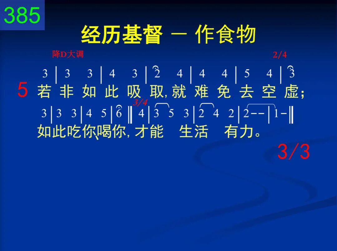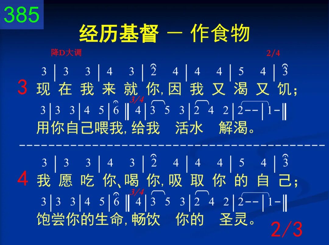 主阿,你是吗哪,已经从天降下;来作我的食物,使我得着饱足。 二 你是磐石裂破,流出活水为我;随时我都可喝,使我免去干渴。 三 现在我来就你,因我又渴又饥;用你自己喂我,给我活水解渴。 四 我愿吃你、喝你,吸取你的自己;饱尝你的生命,畅饮你的圣灵。 五 若非如此吸取,就难免去空虚;如此吃你、喝你,才能生活有力。