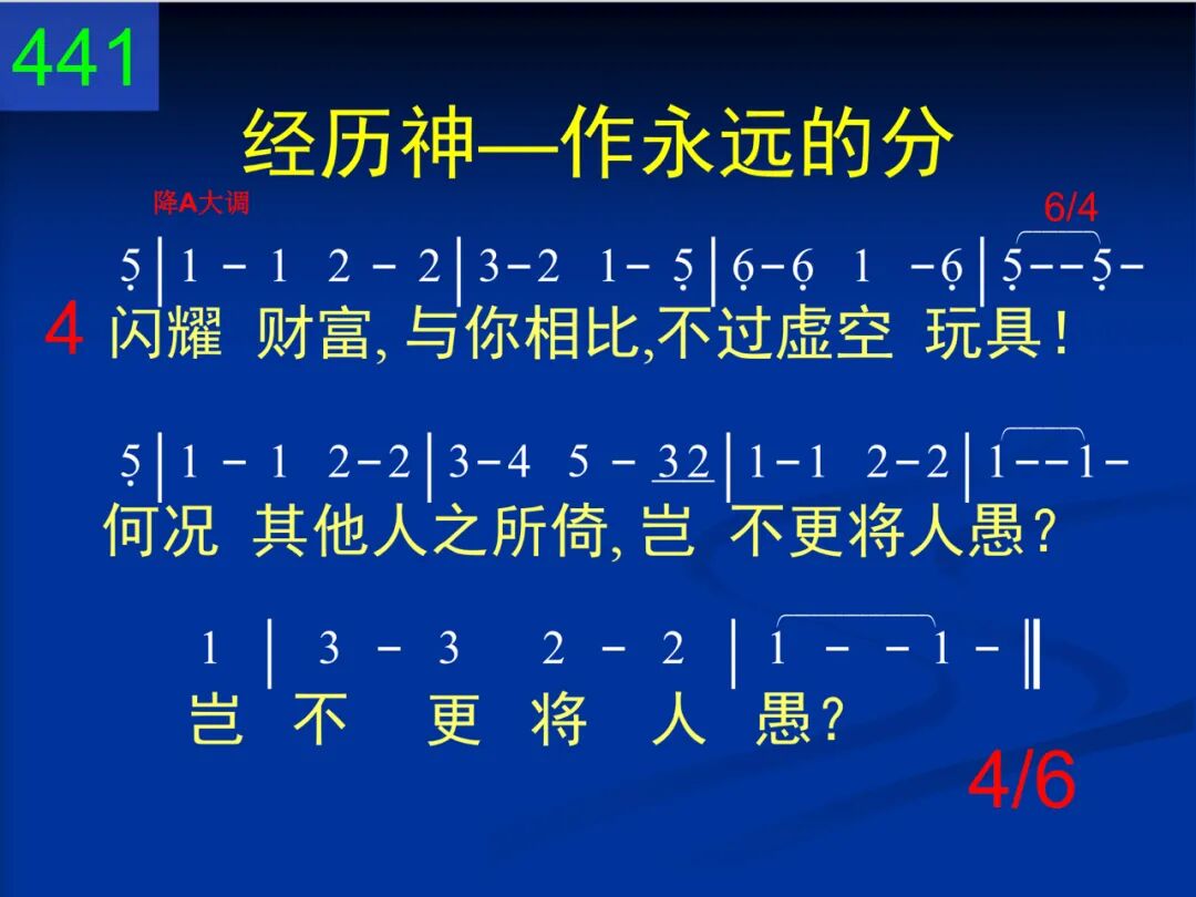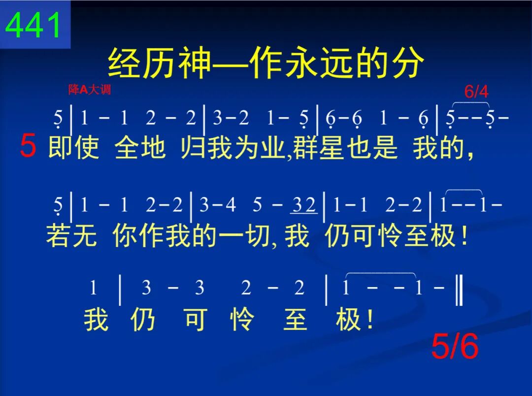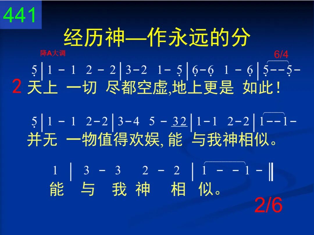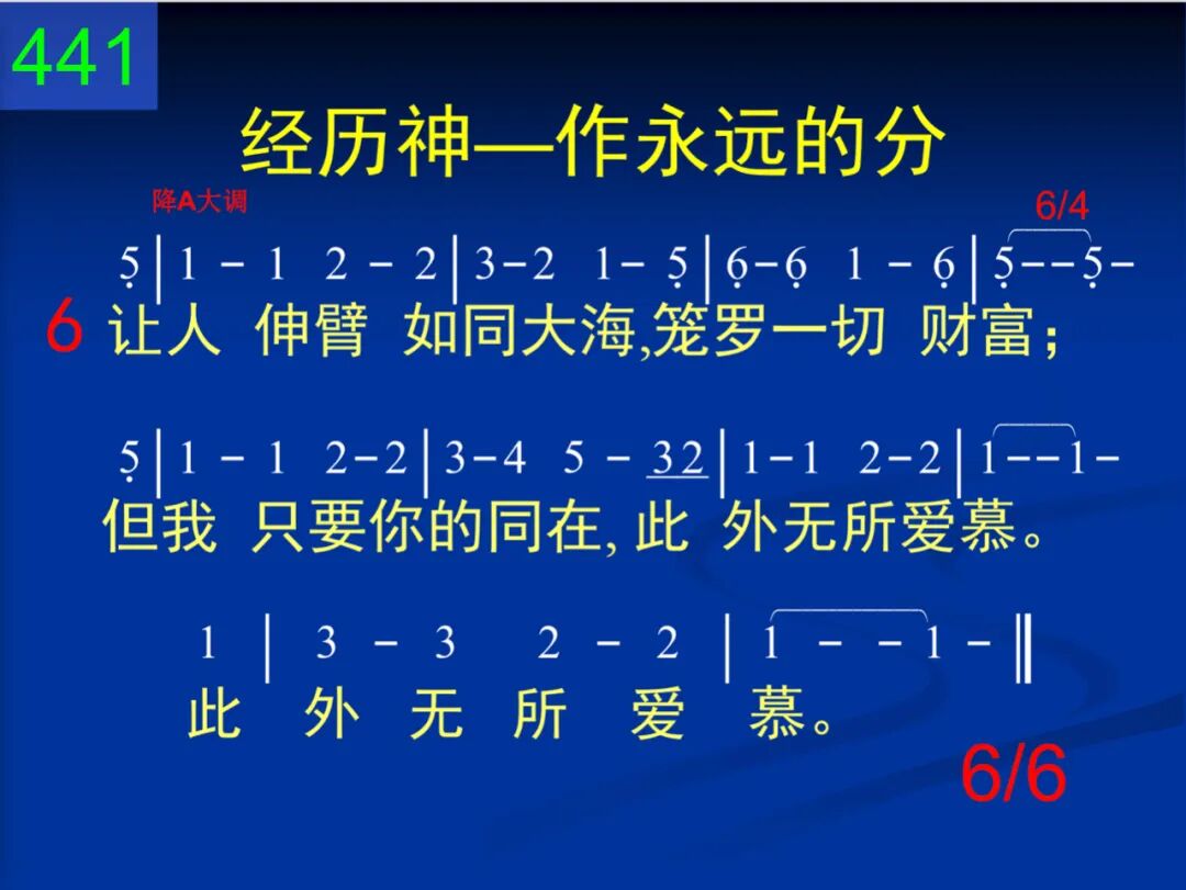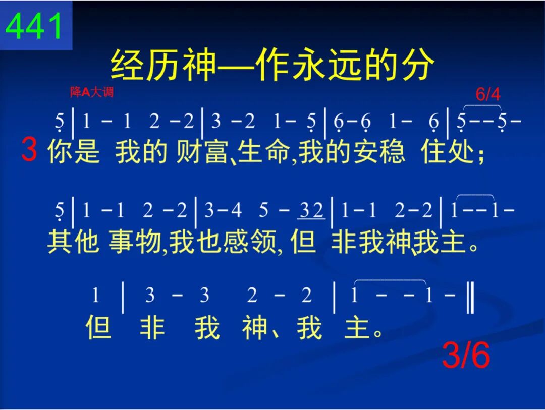 我神、我爱、我的永分,你永是我一切;你外,在天我有何人,在地有你无缺!在地有你无缺! 二 天上一切尽都空虚,地上更是如此!并无一物值得欢娱,能与我神相似。 三 你是我的财富、生命,我的安稳住处;其他事物,我也感领,但非我神、我主。 四 闪耀财富,与你相比,不过虚空玩具!何况其他人之所倚,岂不更将人愚? 五 即使全地归我为业,群星也是我的,若无你作我的一切,我仍可怜至极! 六 让人伸臂如同大海,笼罗一切财富;但我只要你的同在,此外无所爱慕。