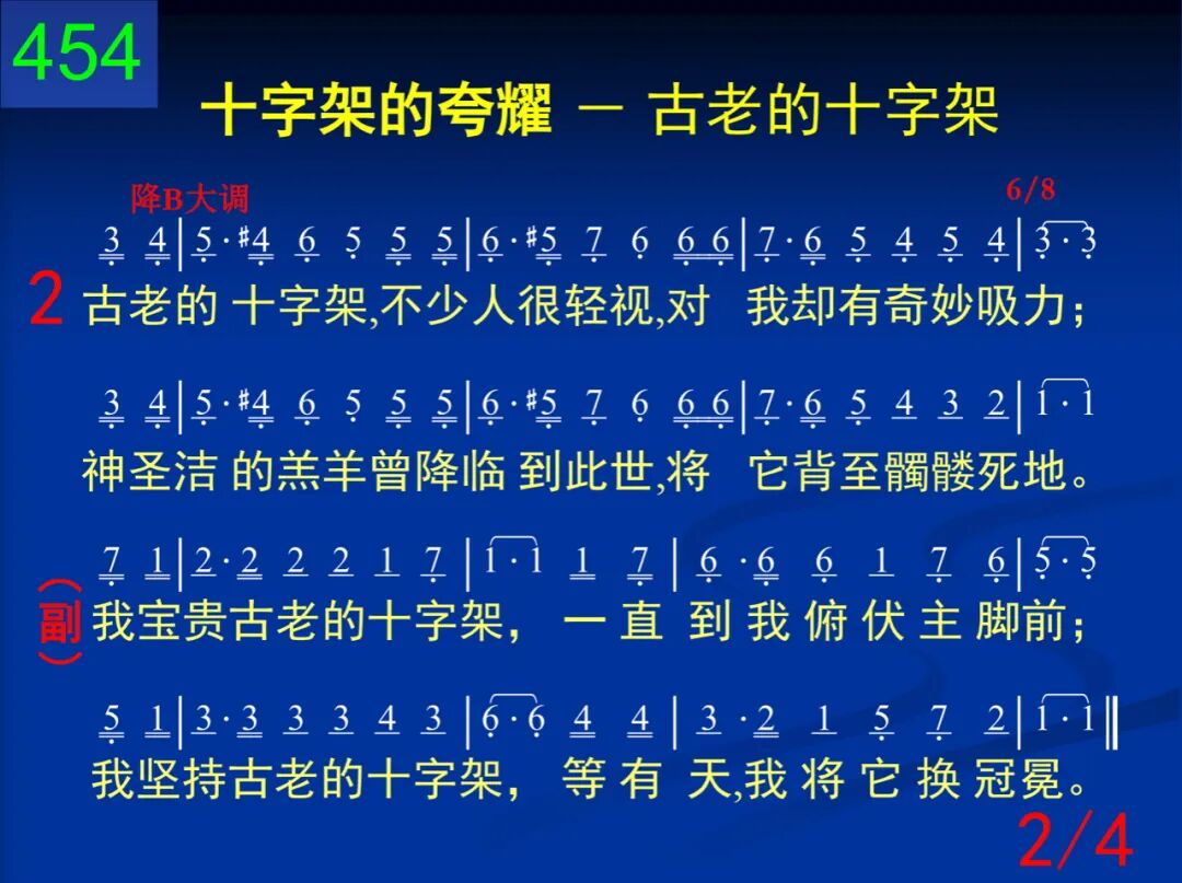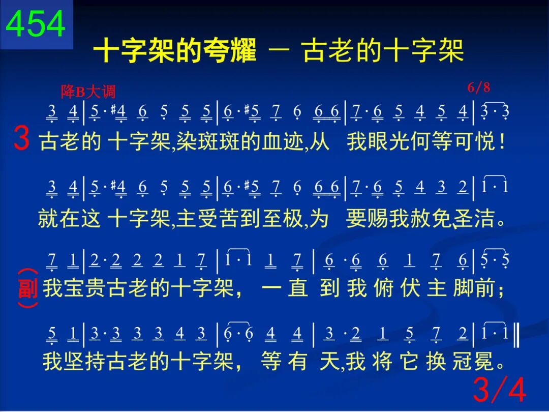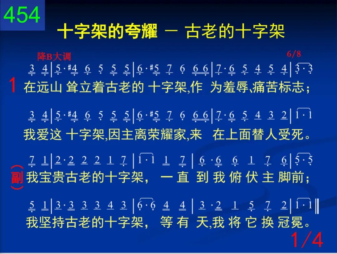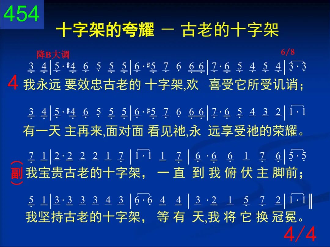 在远山耸立着古老的十字架,作为羞辱、痛苦标志;我爱这十字架,因主离荣耀家,来在上面替人受死。 我宝贵古老的十字架,一直到我俯伏主脚前;我坚持古老的十字架,等有天,我将它换冠冕。 二 古老的十字架,不少人很轻视,对我却有奇妙吸力;神圣洁的羔羊曾降临到此世,将它背至髑髅死地。 我宝贵古老的十字架,一直到我俯伏主脚前;我坚持古老的十字架,等有天,我将它换冠冕。 三 古老的十字架,染斑斑的血迹,从我眼光何等可悦!就在这十字架,主受苦到至极,为要赐我赦免、圣洁。 我宝贵古老的十字架,一直到我俯伏主脚前;我坚持古老的十字架,等有天,我将它换冠冕。 四 我永远要效忠古老的十字架,欢喜受它所受讥诮;有一天主再来,面对面看见祂,永远享受祂的荣耀。 我宝贵古老的十字架,一直到我俯伏主脚前;我坚持古老的十字架,等有天,我将它换冠冕。