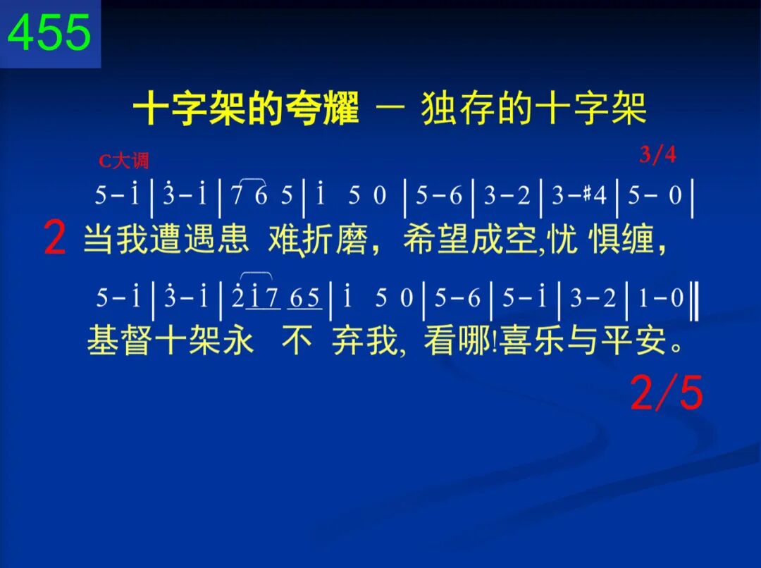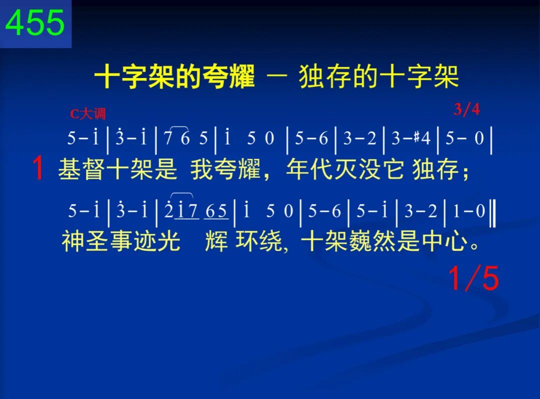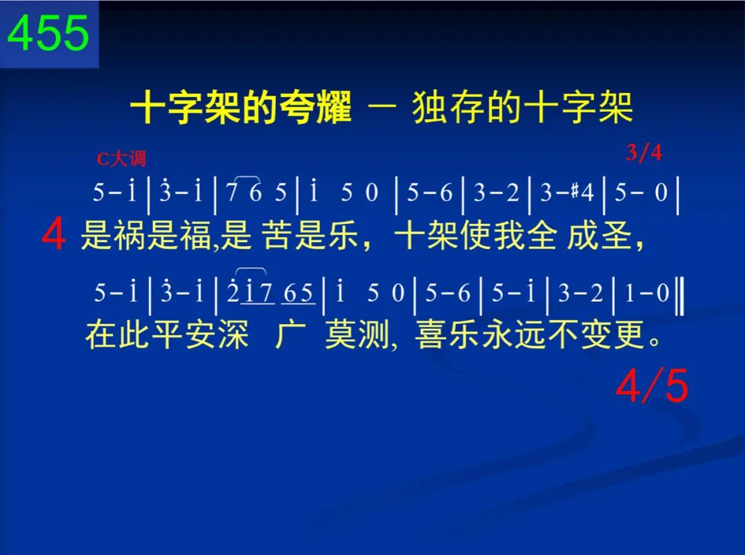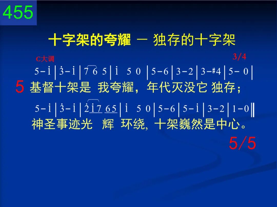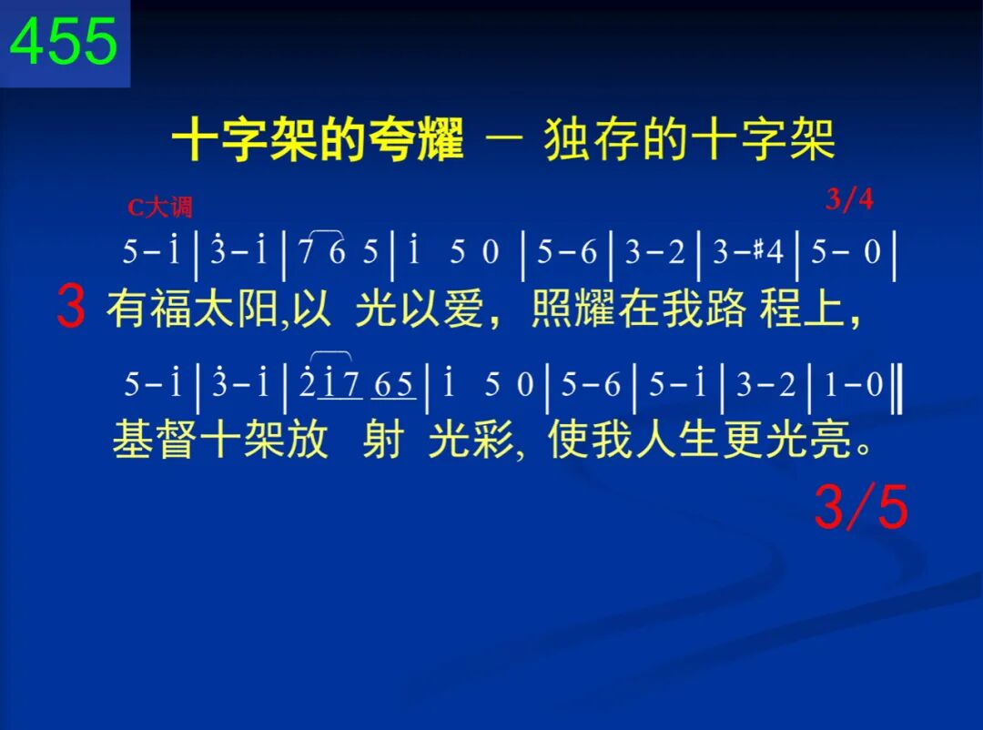 基督十架是我夸耀,年代灭没它独存;神圣事迹光辉环绕,十架巍然是中心。 二 当我遭遇患难、折磨,希望成空,忧惧缠,基督十架永不弃我,看哪!喜乐与平安。 三 有福太阳,以光以爱,照耀在我路程上,基督十架放射光彩,使我人生更光亮。 四 是祸是福,是苦是乐,十架使我全成圣,在此平安深广莫测,喜乐永远不变更。 五 基督十架是我夸耀,年代灭没它独存;神圣事迹光辉环绕,十架巍然是中心。