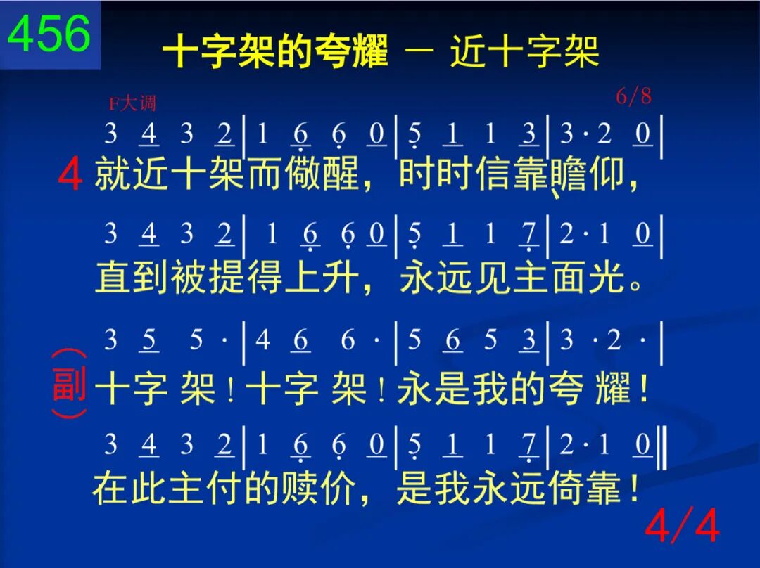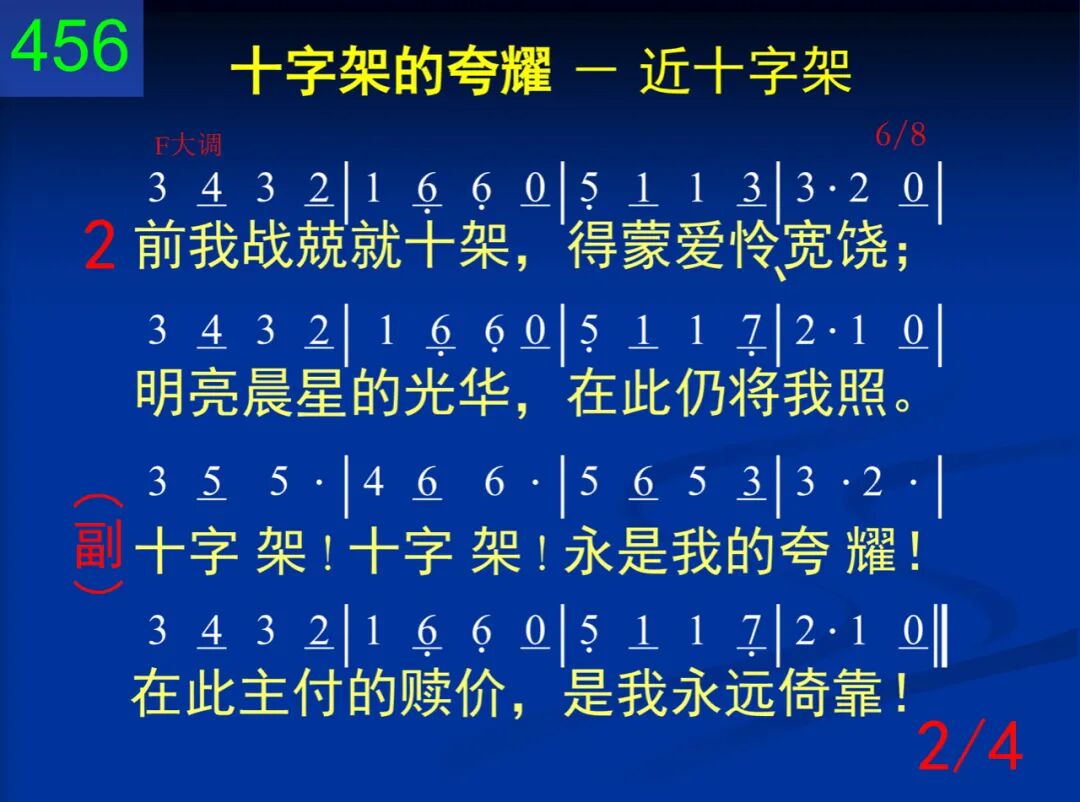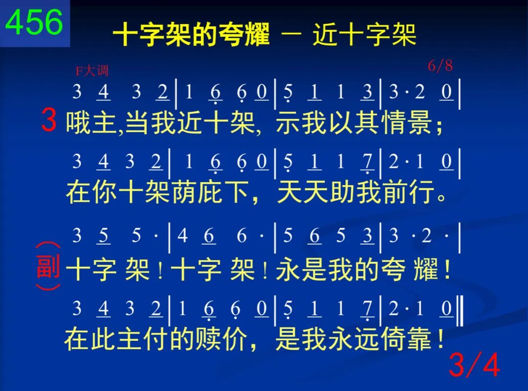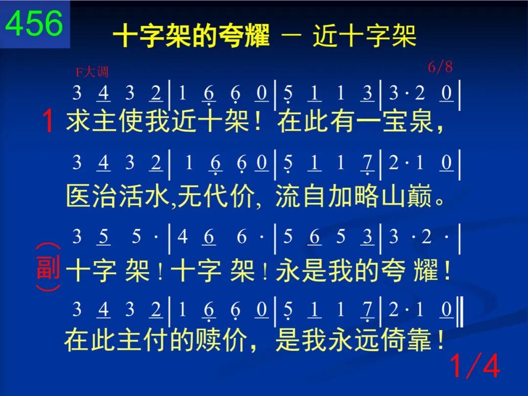 求主使我近十架!在此有一宝泉,医治活水,无代价,流自加略山巅。 十字架!十字架!永是我的夸耀!在此主付的赎价,是我永远倚靠! 二 前我战兢就十架,得蒙爱怜、宽饶;明亮晨星的光华,在此仍将我照。 十字架!十字架!永是我的夸耀!在此主付的赎价,是我永远倚靠! 三 哦主,当我近十架,示我以其情景;在你十架荫庇下,天天助我前行。 十字架!十字架!永是我的夸耀!在此主付的赎价,是我永远倚靠! 四 就近十架而儆醒,时时信靠、瞻仰,直到被提得上升,永远见主面光。 十字架!十字架!永是我的夸耀!在此主付的赎价,是我永远倚靠! 第二节的“明亮晨星”指主基督。