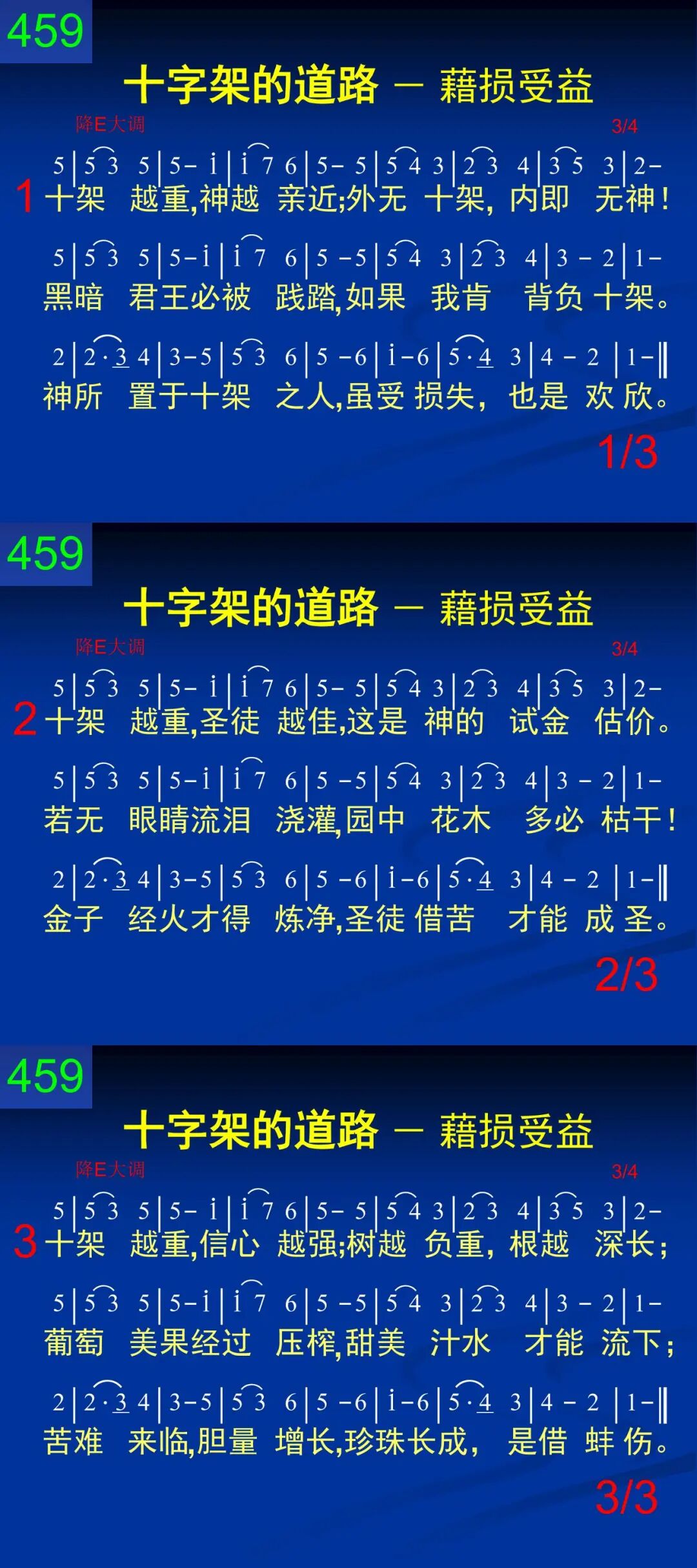 十架越重,神越亲近;外无十架,内即无神!黑暗君王必被践踏,如果我肯背负十架。神所置于十架之人,虽受损失,也是欢欣。 二 十架越重,圣徒越佳,这是神的试金估价。若无眼睛流泪浇灌,园中花木多必枯干!金子经火才得炼净,圣徒藉苦才能成圣。 三 十架越重,信心越强;树越负重,根越深长;葡萄美果经过压榨,甜美汁水才能流下;苦难来临,胆量增长,珍珠长成,是藉蚌伤。