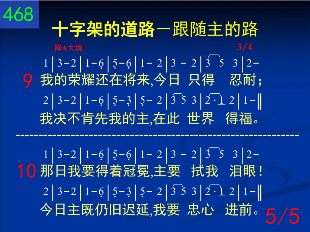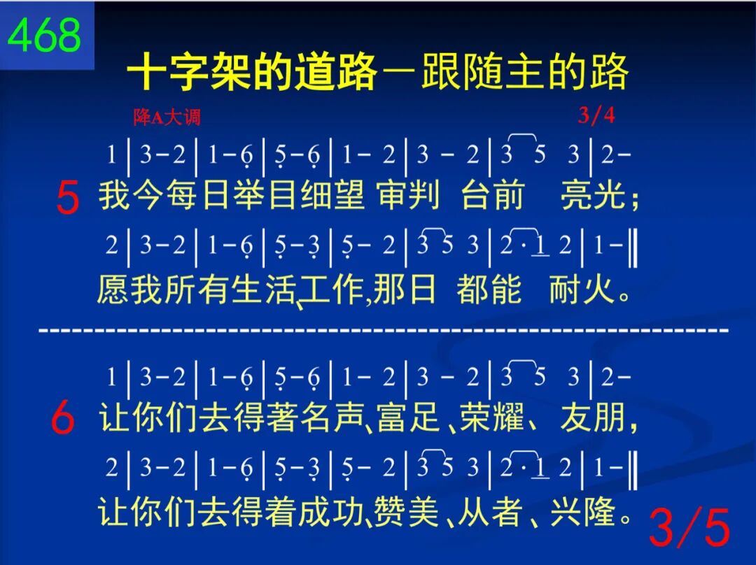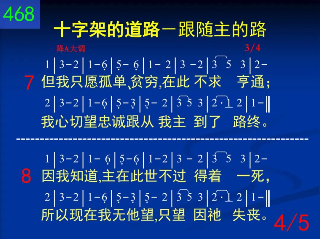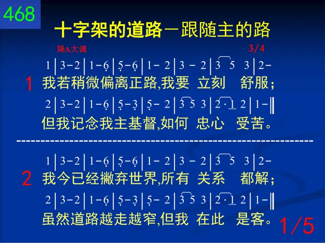 我若稍微偏离正路,我要立刻舒服;但我记念我主基督,如何忠心受苦。 二 我今已经撇弃世界,所有关系都解;虽然道路越走越窄,但我在此是客。 三 管他世人怒目白眼,我只求主笑脸;群众虽然喜欢外貌,但我要主的“好。” 四 我心所望不是伟大,不是今生通达;我愿现在卑微事主,那日得祂称许。 五 我今每日举目细望审判台前亮光;愿我所有生活、工作,那日都能耐火。 六 让你们去得著名声、富足、荣耀、友朋,让你们去得着成功、赞美、从者、兴隆。 七 但我只愿孤单、贫穷,在此不求亨通;我心切望忠诚跟从我主到了路终。 八 因我知道,主在此世不过得着一死,所以现在我无他望,只望因祂失丧。 九 我的荣耀还在将来,今日只得忍耐;我决不肯先我的主,在此世界得福。 十 那日我要得着冠冕,主要拭我泪眼!今日主既仍旧迟延,我要忠心进前。