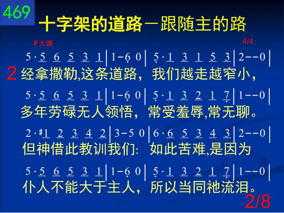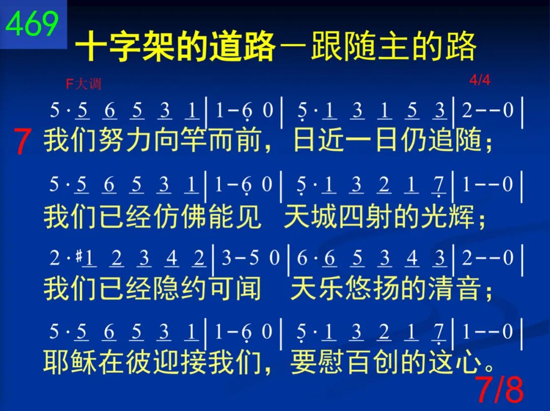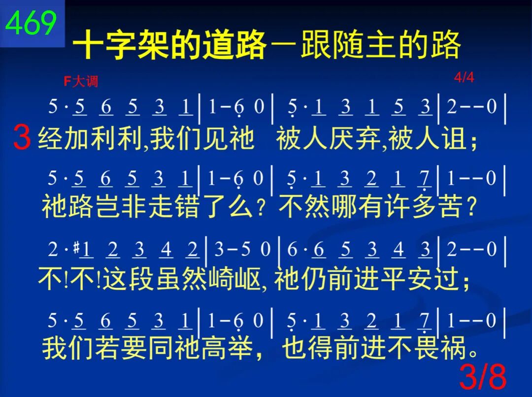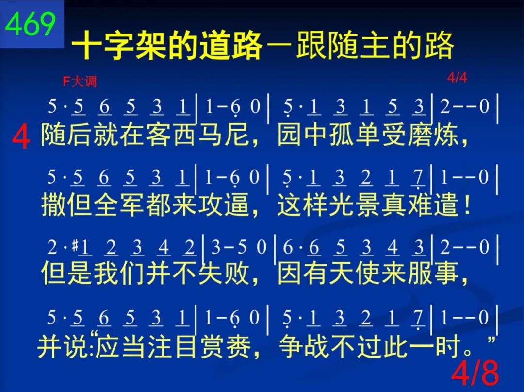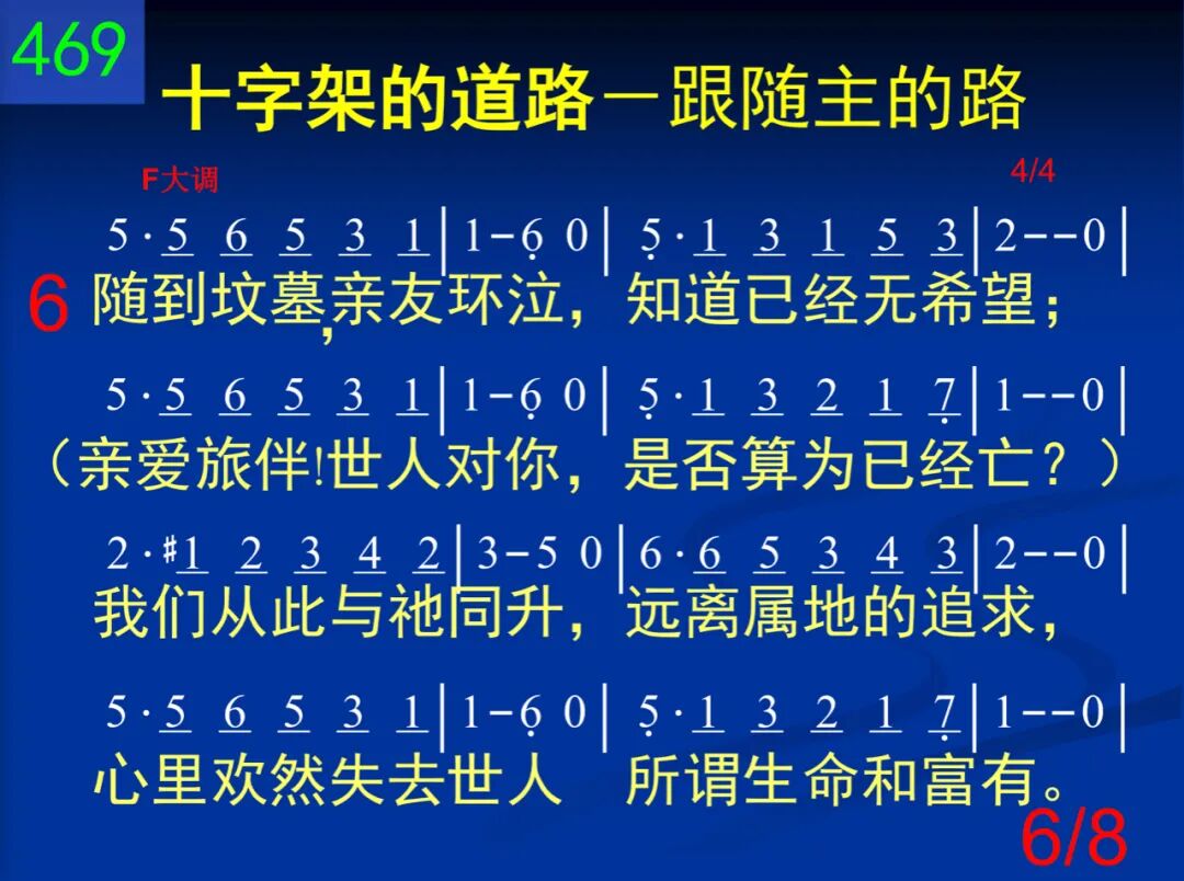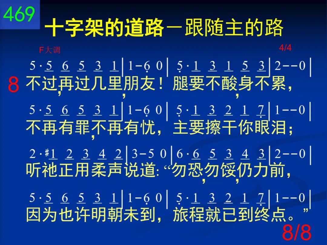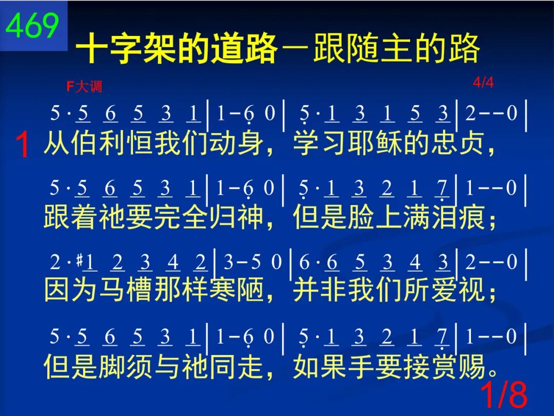 从伯利恒我们动身,学习耶稣的忠贞,跟着祂要完全归神,但是脸上满泪痕;因为马槽那样寒陋,并非我们所爱视;但是脚须与祂同走,如果手要接赏赐。 二 经拿撒勒,这条道路,我们越走越窄小,多年劳碌无人领悟,常受羞辱,常无聊。但神藉此教训我们:如此苦难,是因为仆人不能大于主人,所以当同祂流泪。 三 经加利利,我们见祂被人厌弃,被人诅;祂路岂非走错了么?不然那有许多苦?不!不!这段虽然崎岖,祂仍前进平安过;我们若要同祂高举,也得前进不畏祸。 四 随后就在客西马尼,园中孤单受磨炼,撒但全军都来攻逼,这样光景真难遣!但是我们并不失败,因有天使来服事,并说:“应当注目赏赉,争战不过此一时。” 五 十架到了!因为所有忠魂都当经加略;我们在此同祂蒙羞,不肯自怜,不退却;因为不过一点时候,我们如此感苦痛;将来见祂,一切忧愁,要消在祂笑容中。 六 随到坟墓,亲友环泣,知道已经无希望;(亲爱旅伴!世人对你,是否算为已经亡?我们从此与祂同升,远离属地的追求,心里欢然失去世人所谓生命和富有。) 七 我们努力向竿而前,日近一日仍追随;我们已经仿佛能见天城四射的光辉;我们已经隐约可闻天乐悠扬的清音;耶稣在彼迎接我们,要慰百创的这心。 八 不过,再过几里,朋友!腿要不酸,身不累,不再有罪,不再有忧,主要擦干你眼泪;听祂正用柔声说道:“勿恐,勿馁,仍力前,因为也许明朝未到,旅程就已到终点。”
