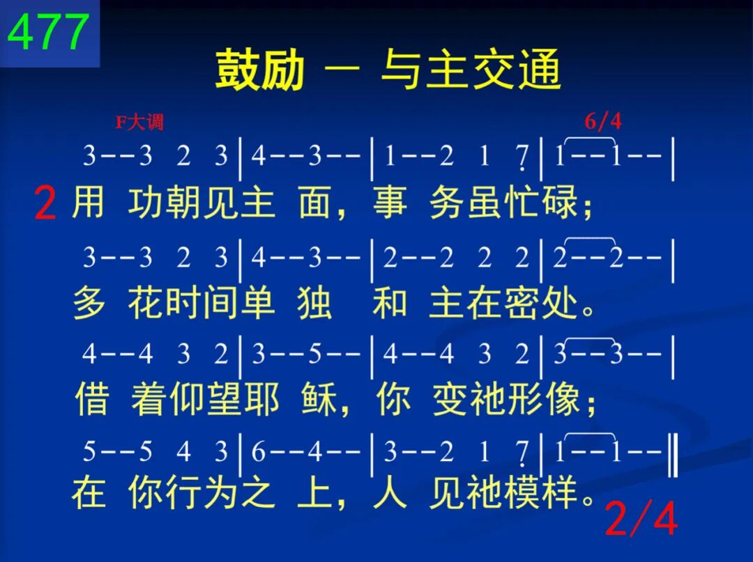 用功朝见主面,多和主对讲,常住在祂里面,以祂话为粮。等候在祂面前,柔顺且降服,每件事上不忘寻求祂祝福。 二 用功朝见主面,事务虽忙碌;多花时间单独和主在密处。藉着仰望耶稣,你变祂形像;在你行为之上,人见祂模样。 三 用功朝见主面,让祂作领导;任何事情发生,不在祂前跑;无论是乐是苦,始终跟随主,始终相信祂话,常仰望耶稣。 四 用功朝见主面,内心须宁静;让祂前来管理意念和性情。祂灵把你带到爱的发源所,如此你才配作属天的工作。