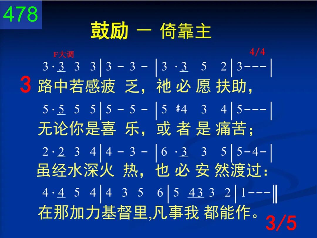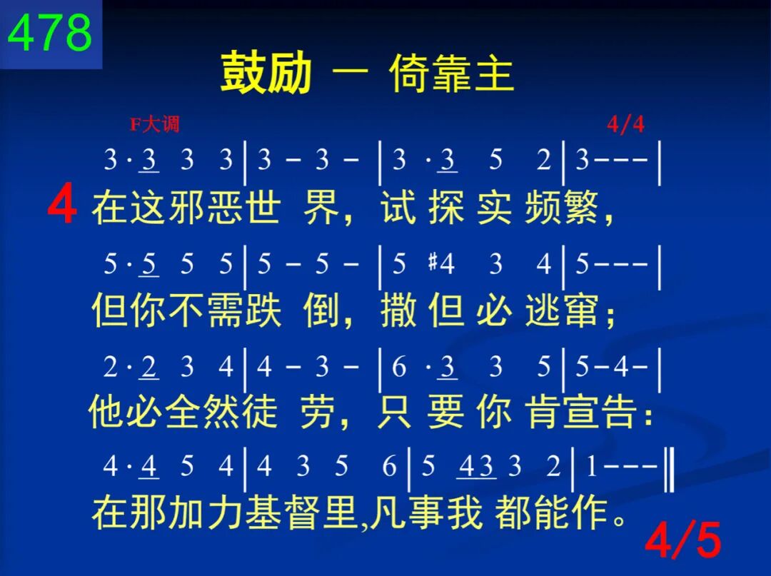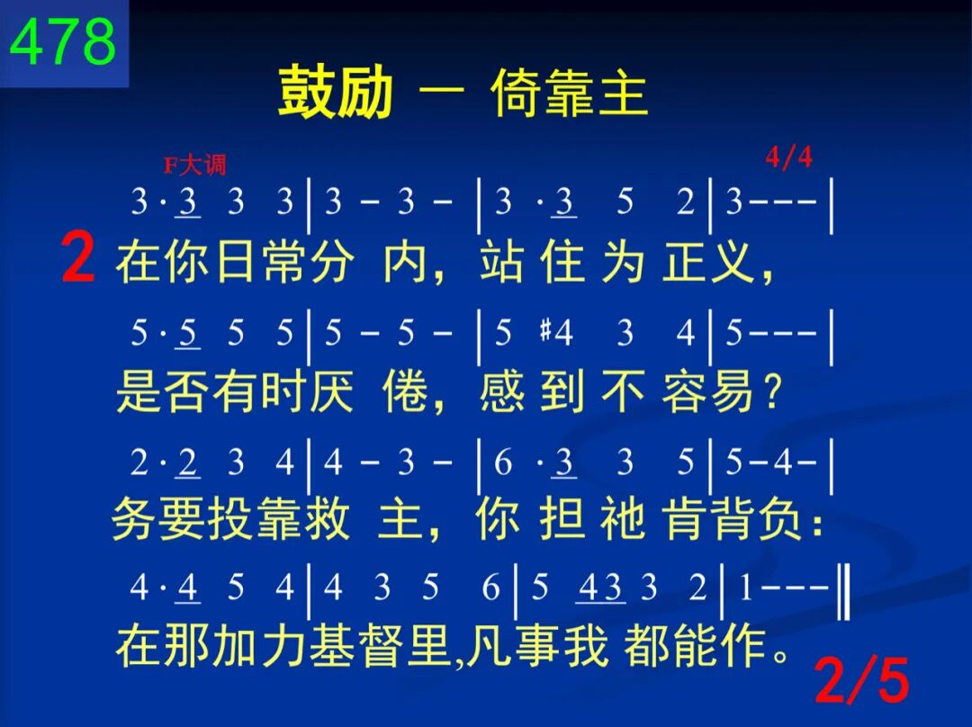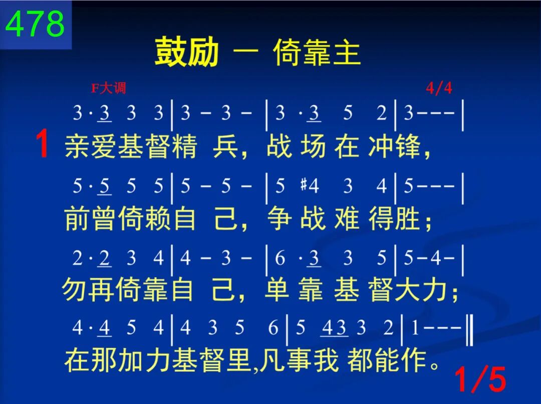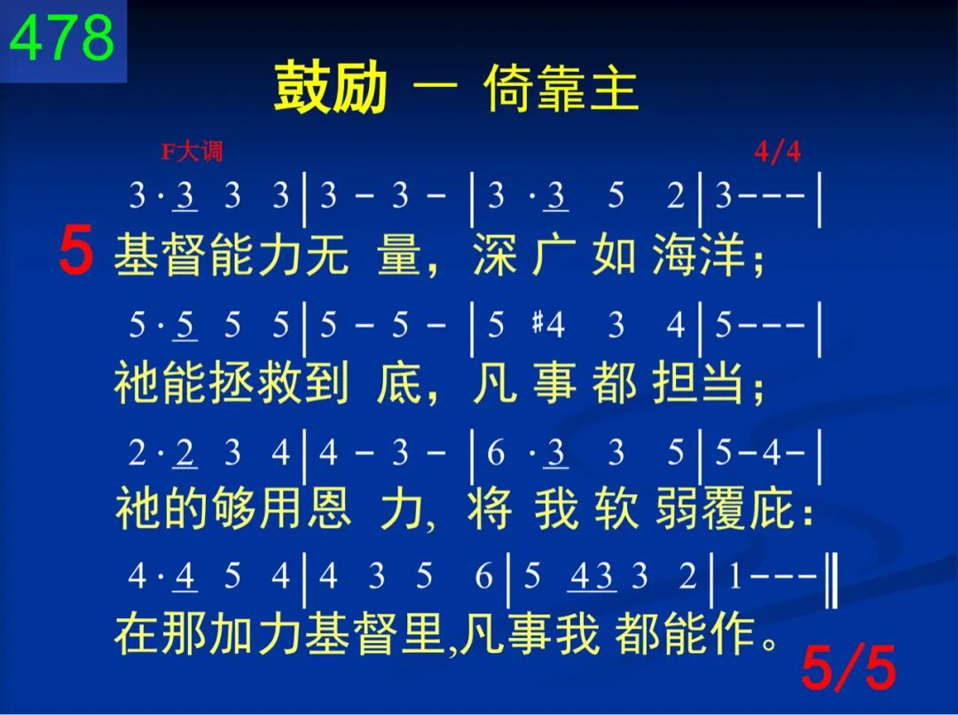 亲爱基督精兵,战场在冲锋,前曾倚赖自己,争战难得胜;勿再倚靠自己,单靠基督大力;在那加力基督里,凡事我都能作。 二 在你日常分内,站住为正义,是否有时厌倦,感到不容易?务要投靠救主,你担祂肯背负:在那加力基督里,凡事我都能作。 三 路中若感疲乏,祂必愿扶助,无论你是喜乐,或者是痛苦;虽经水深火热,也必安然渡过:在那加力基督里,凡事我都能作。 四 在这邪恶世界,试探实频繁,但你不需跌倒,撒但必逃窜;他必全然徒劳,只要你肯宣告:在那加力基督里,凡事我都能作。 五 基督能力无量,深广如海洋;祂能拯救到底,凡事都担当;祂的够用恩力,将我软弱覆庇:在那加力基督里,凡事我都能作。
