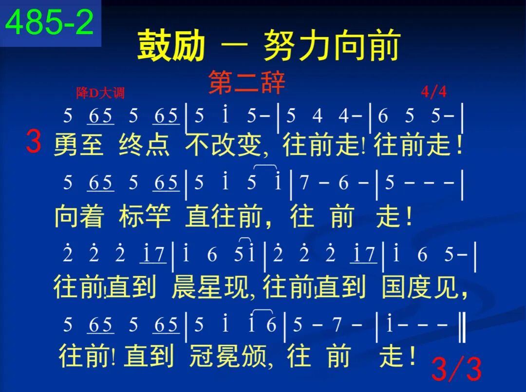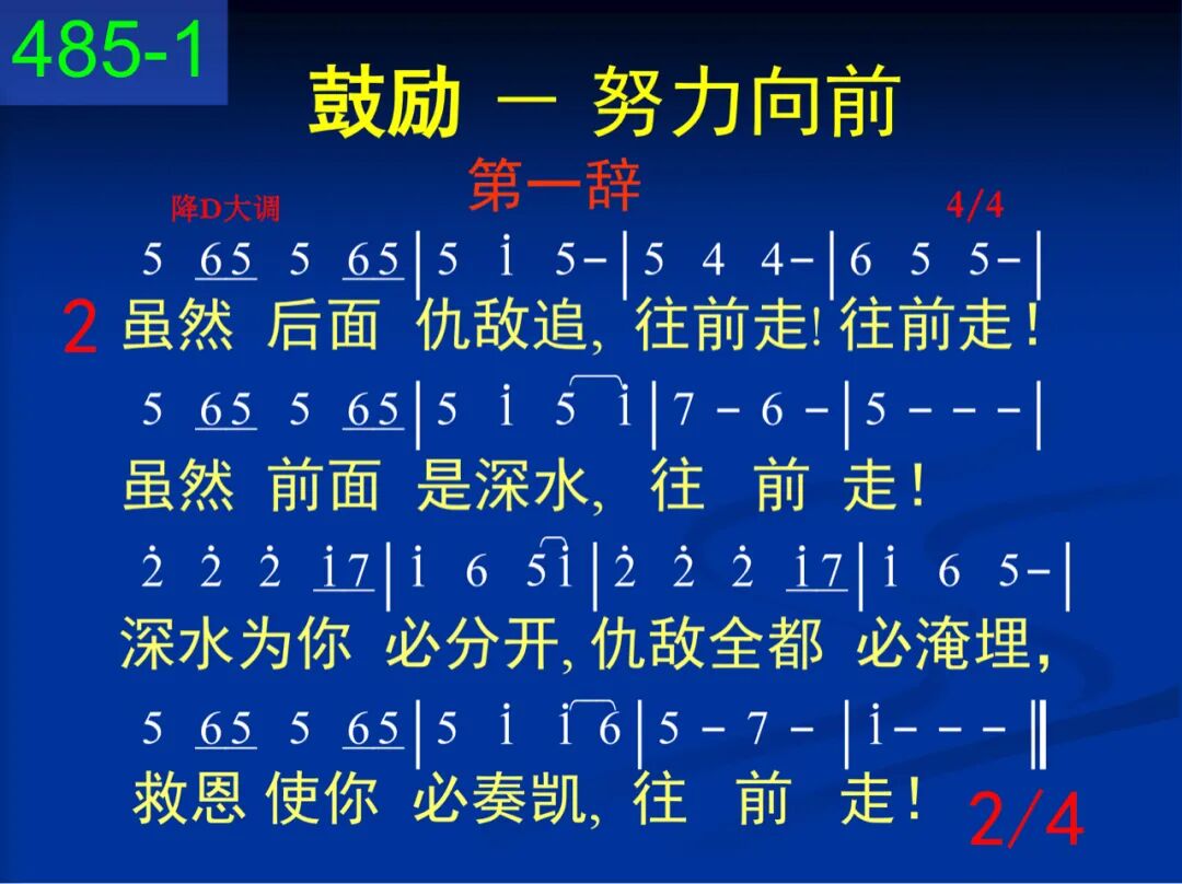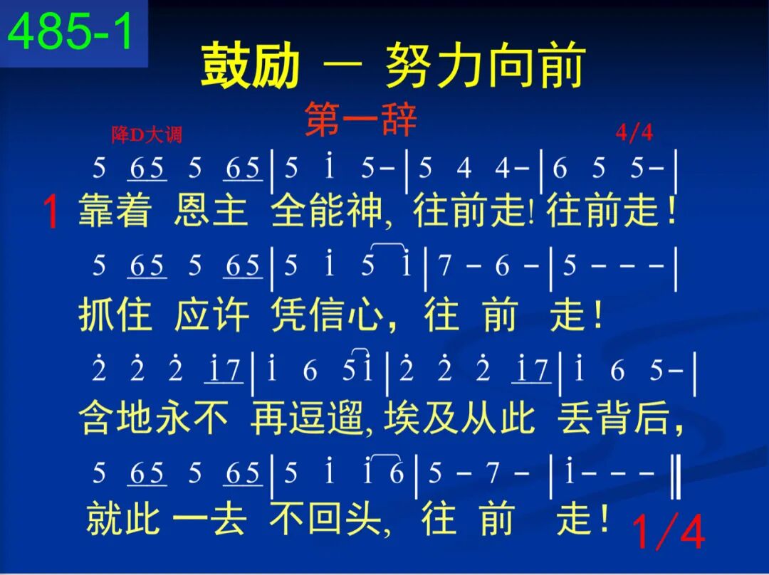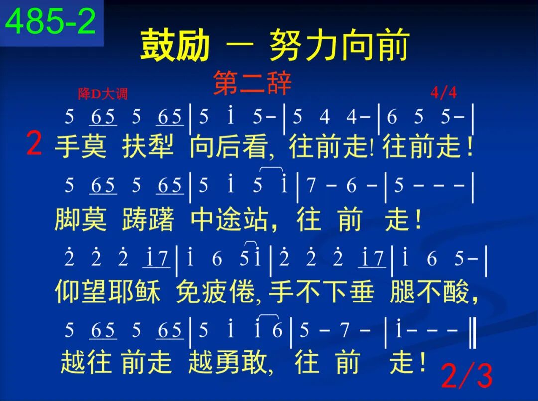 靠着恩主全能神,往前走!往前走!抓住应许凭信心,往前走!含地永不再逗遛,埃及从此丢背后,就此一去不回头,往前走! 二 虽然后面仇敌追,往前走!往前走!虽然前面是深水,往前走!深水为你必分开,仇敌全都必淹埋,救恩使你必奏凯,往前走! 三 白昼云柱来引导,往前走!往前走!黑夜火柱来光照,往前走!饥饿,吗哪必降来,干渴,磐石必裂开,遇敌,尼西必击败,往前走! 四 旷野道路虽艰险,往前走!往前走!跟随约柜直往前,往前走!往前!直到过约但,往前!直到进迦南!往前!直到在锡安,往前走! 第二辞 五 莫在世界仍留恋,往前走!往前走!放下重担脱累缠,往前走!父神召你来成圣,基督是你的生命,圣灵作你的大能,往前走! 六 手莫扶犁向后看,往前走!往前走!脚莫踌躇中途站,往前走!仰望耶稣免疲倦,手不下垂腿不酸,越往前走越勇敢,往前走! 七 勇至终点不改变,往前走!往前走!向着标竿直往前,往前走!往前!直到晨星现,往前!直到国度见,往前!直到冠冕颁,往前走!