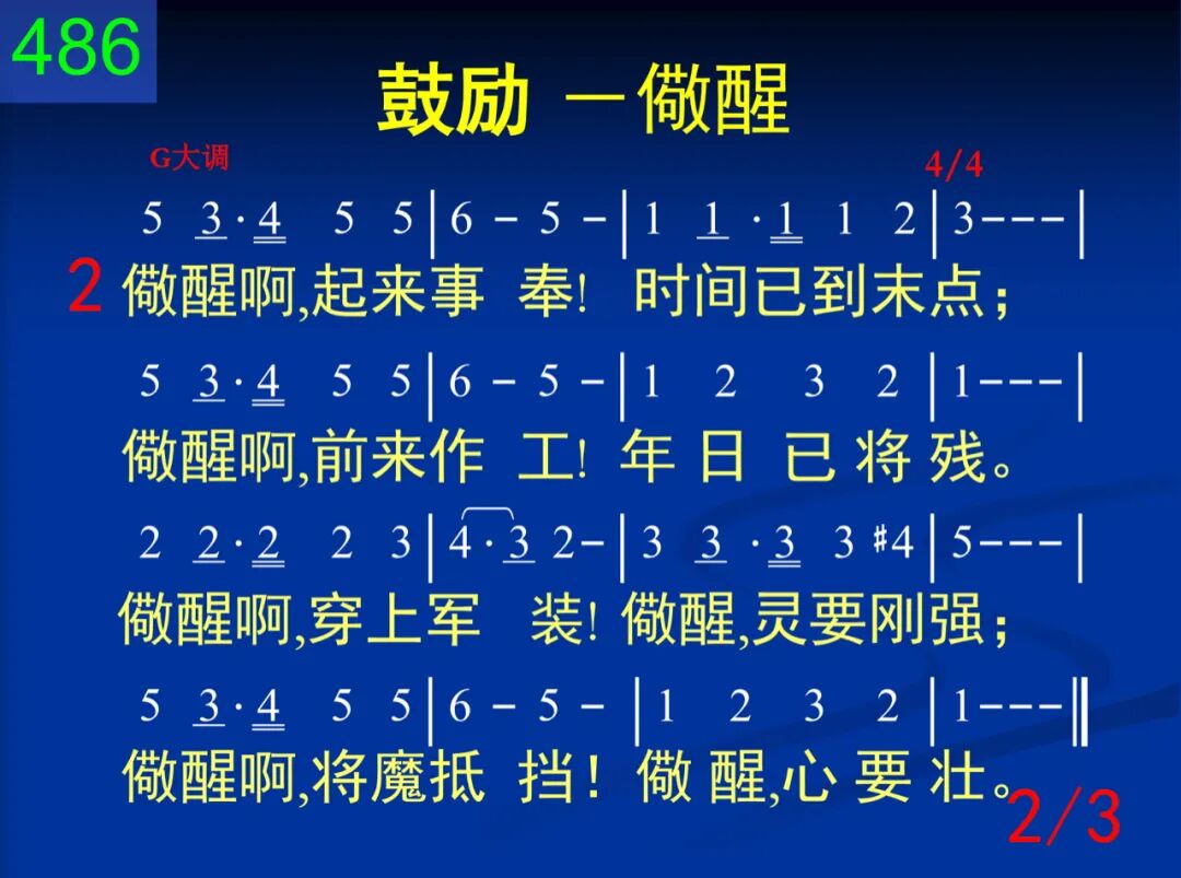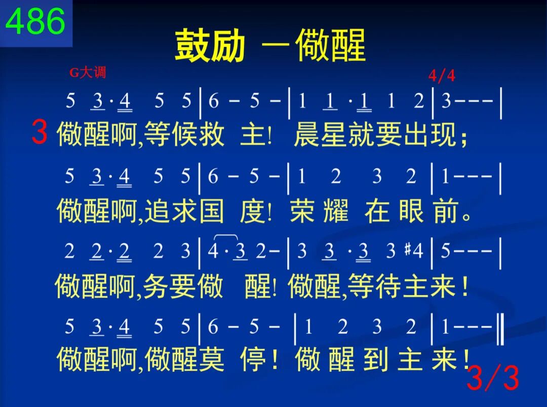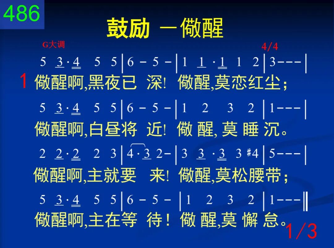 儆醒阿,黑夜已深!儆醒,莫恋红尘;儆醒阿,白昼将近!儆醒,莫睡沉。儆醒阿,主就要来!儆醒,莫松腰带;儆醒阿,主在等待!儆醒,莫懈怠。 二 儆醒阿,起来事奉!时间已到末点;儆醒阿,前来作工!年日已将残。儆醒阿,穿上军装!儆醒,灵要刚强;儆醒阿,将魔抵挡!儆醒,心要壮。 三 儆醒阿,等候救主!晨星就要出现;儆醒阿,追求国度!荣耀在眼前。儆醒阿,务要儆醒!儆醒,等待主来!儆醒阿,儆醒莫停!儆醒到主来!