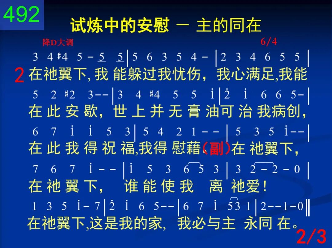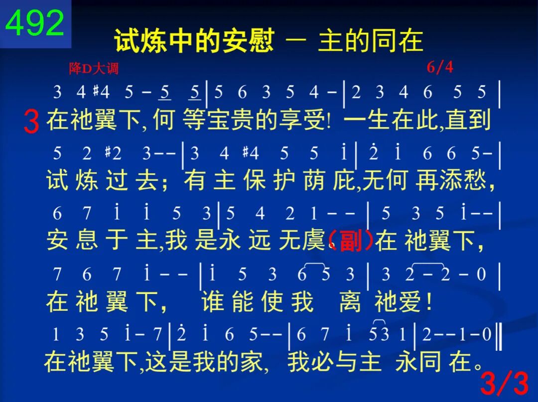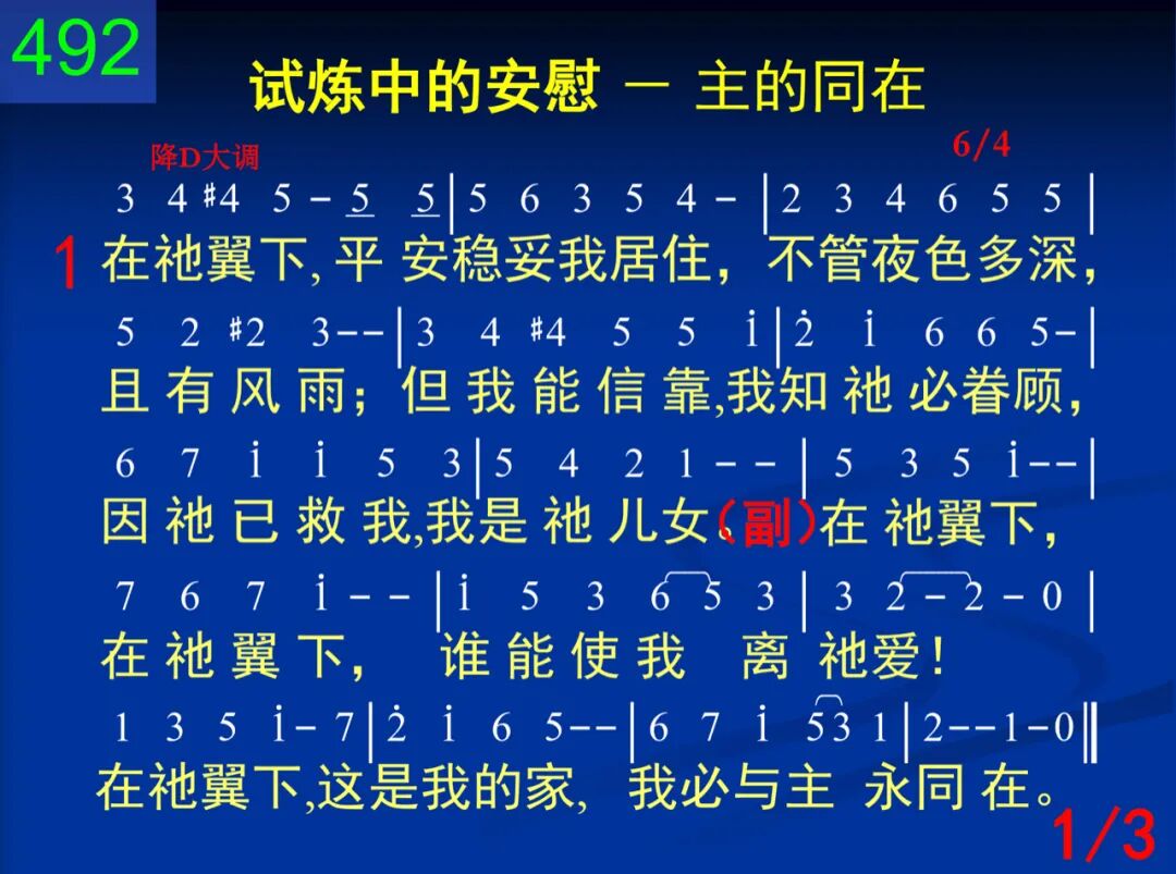 在祂翼下,平安稳妥我居住,不管夜色多深,且有风雨;但我能信靠,我知祂必眷顾,因祂已救我,我是祂儿女。 在祂翼下,在祂翼下,谁能使我离祂爱!在祂翼下,这是我的家,我必与主永同在。 二 在祂翼下,我能躲过我忧伤,我心满足,我能在此安歇,世上并无膏油可治我病创,在此我得祝福,我得慰藉。 在祂翼下,在祂翼下,谁能使我离祂爱!在祂翼下,这是我的家,我必与主永同在。 三 在祂翼下,何等宝贵的享受!一生在此,直到试炼过去;有主保护荫庇,无何再添愁,安息于主,我是永远无虞。 在祂翼下,在祂翼下,谁能使我离祂爱!在祂翼下,这是我的家,我必与主永同在。