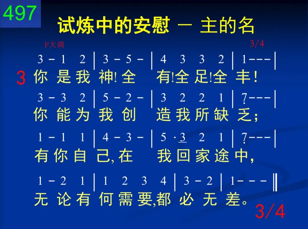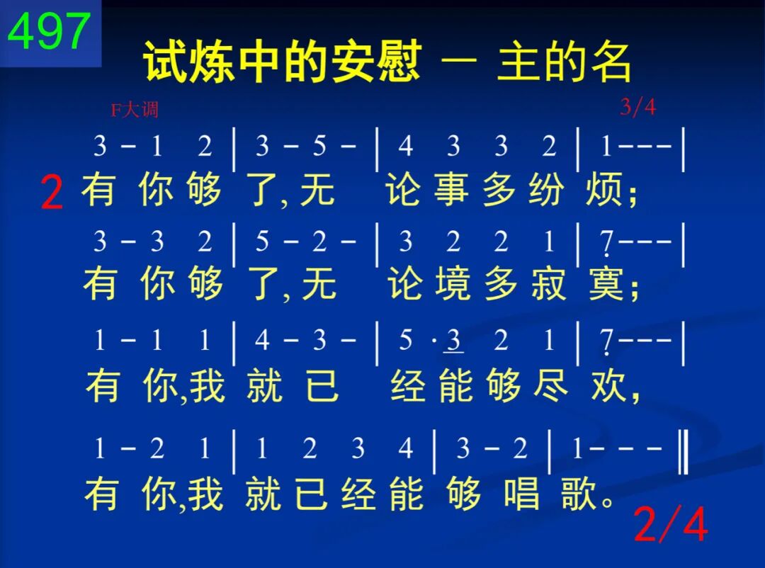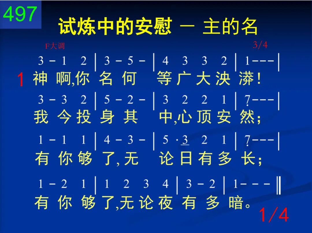 神阿,你名何等广大泱漭!我今投身其中,心顶安然;有你够了,无论日有多长;有你够了,无论夜有多暗。 二 有你够了,无论事多纷烦;有你够了,无论境多寂寞;有你,我就已经能够尽欢,有你,我就已经能够唱歌。 三 你是我神!全有!全足!全丰!你能为我创造我所缺乏;有你自己,在我回家途中,无论有何需要,都必无差。 四 我的神阿,你在已过路上,曾用爱的神迹多方眷顾;故我敢再投入你的胸膛,因信心安,赞美你的道路。