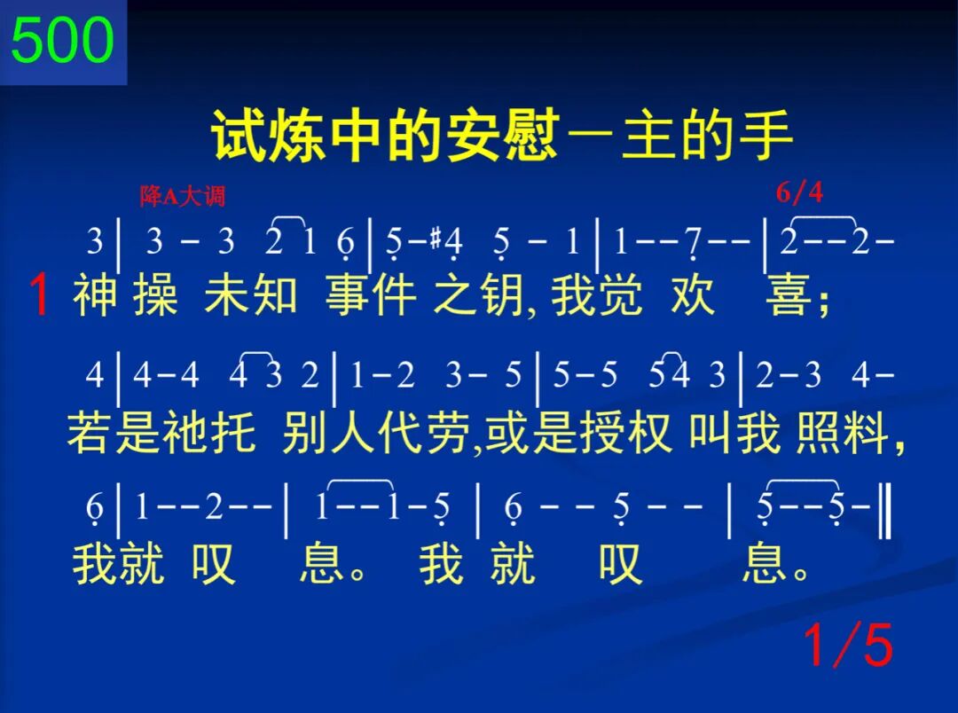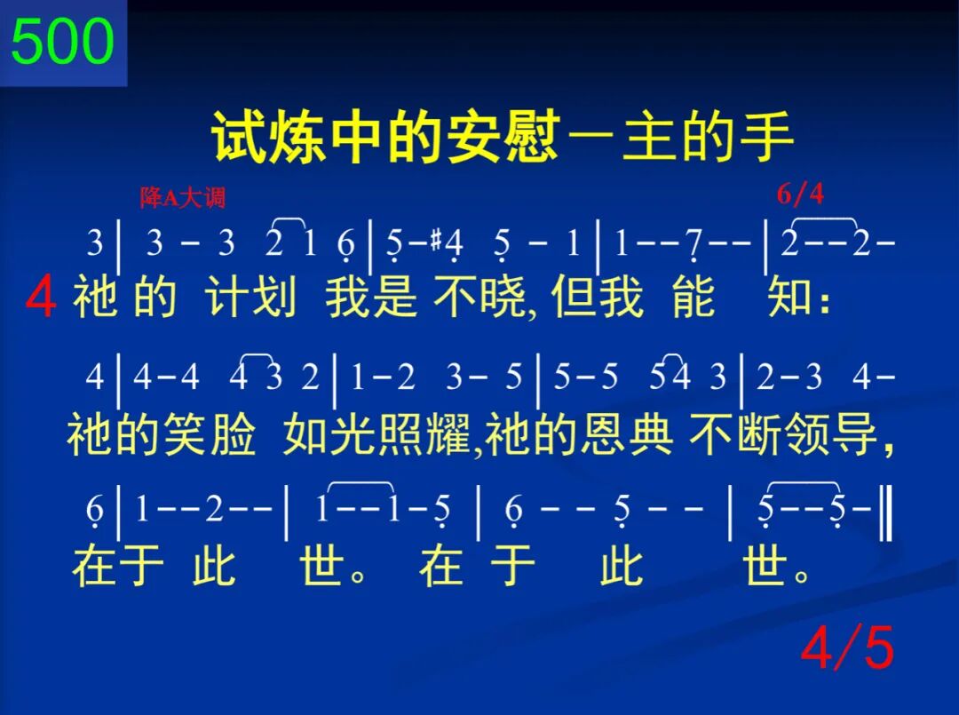 神操未知事件之钥,我觉欢喜;若是祂托别人代劳,或是授权叫我照料,我就叹息。我就叹息。 二 若是我的明天烦恼,今天临到,而又没有明天关照,我就不知怎样是好!无法祷告。 三 就因我的眼目不明,我反安全;我在暗中摸索失凭,祂手能觉,祂声能听,祂并不远。 四 祂的计划我是不晓,但我能知:祂的笑脸如光照耀,祂的恩典不断领导,在于此世。 五 够了,这已包罗万有,我可安息!我所不能,祂都能救,有祂替我事事讲究,我不着急。