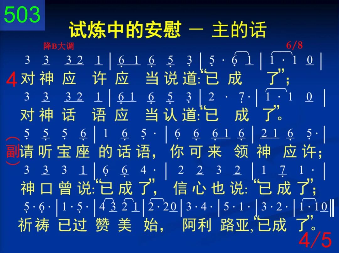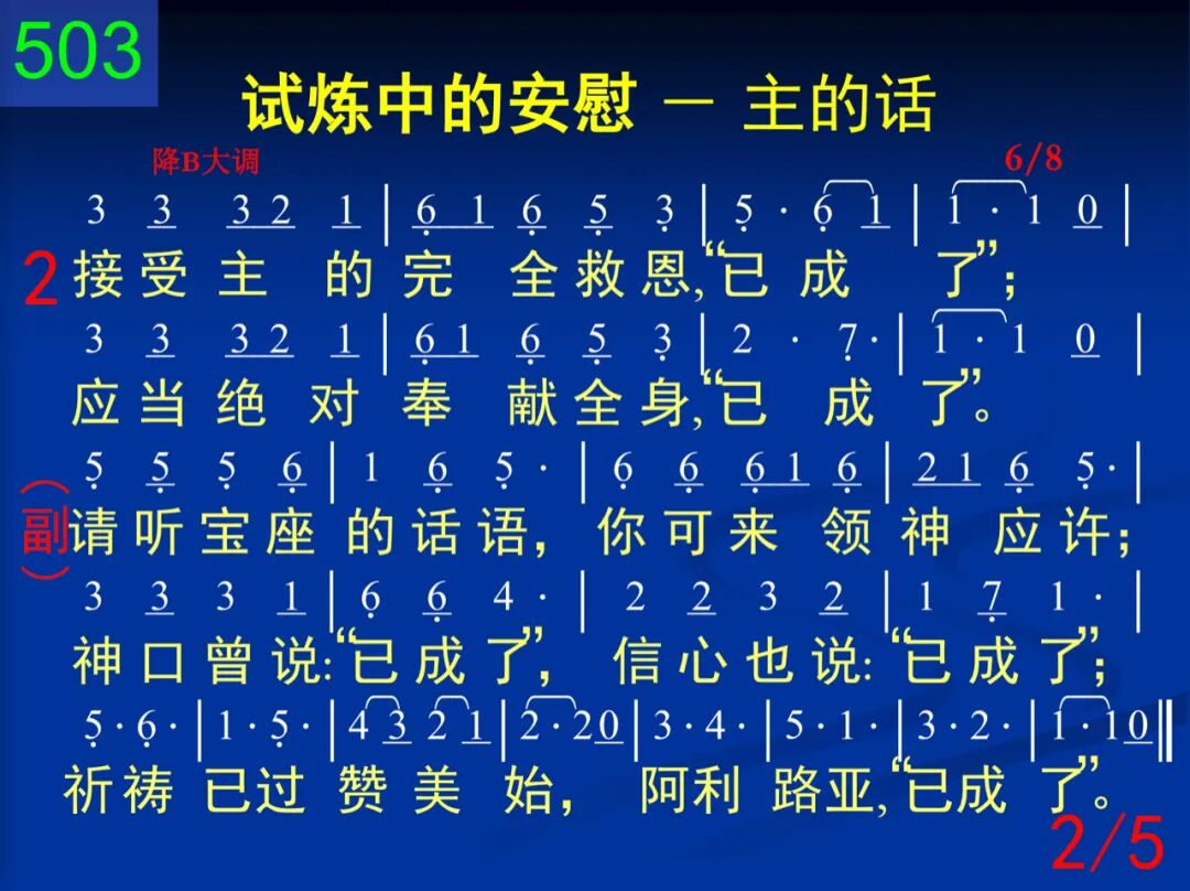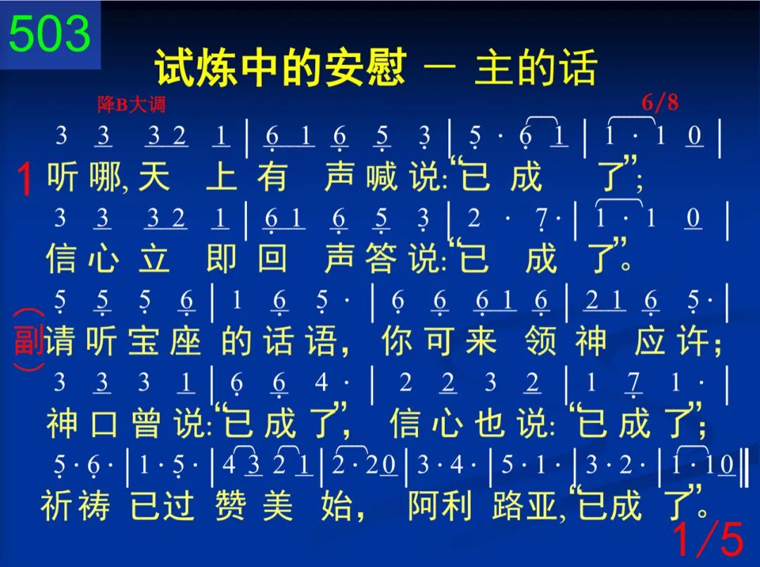 听哪,天上有声喊说:“已成了;”信心立即回声答说:“已成了。” 请听宝座的话语,你可来领神应许;神口曾说:“已成了,”信心也说:“已成了;”祈祷已过赞美始,阿利路亚,“已成了。” 二 接受主的完全救恩,“已成了;”应当绝对奉献全身,“已成了。” 请听宝座的话语,你可来领神应许;神口曾说:“已成了,”信心也说:“已成了;”祈祷已过赞美始,阿利路亚,“已成了。” 三 领取神的医治恩约,“已成了;”只要相信,不要感觉,“已成了。” 请听宝座的话语,你可来领神应许;神口曾说:“已成了,”信心也说:“已成了;”祈祷已过赞美始,阿利路亚,“已成了。” 四 对神应许应当说道:“已成了;”对神话语应当认道:“已成了。” 请听宝座的话语,你可来领神应许;神口曾说:“已成了,”信心也说:“已成了;”祈祷已过赞美始,阿利路亚,“已成了。” 五 按祂所说来相信祂,“已成了;”这个就是接受秘法,“已成了。” 请听宝座的话语,你可来领神应许;神口曾说:“已成了,”信心也说:“已成了;”祈祷已过赞美始,阿利路亚,“已成了。”