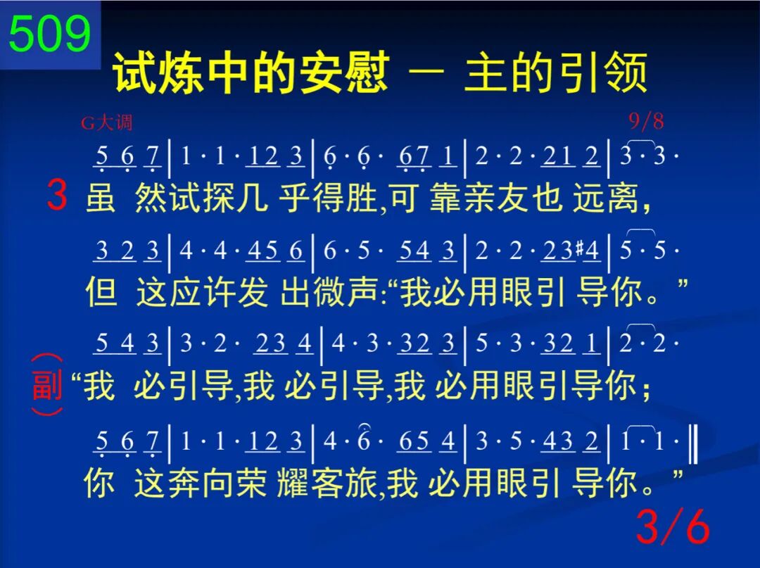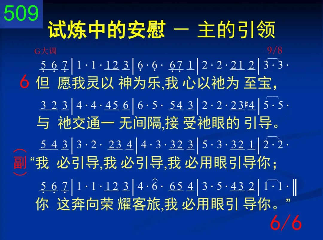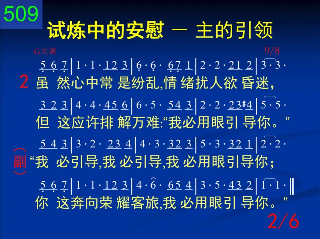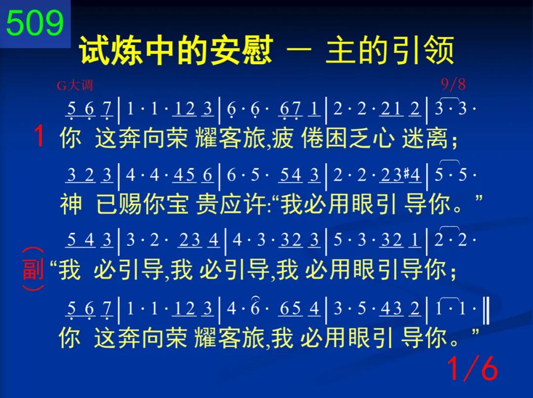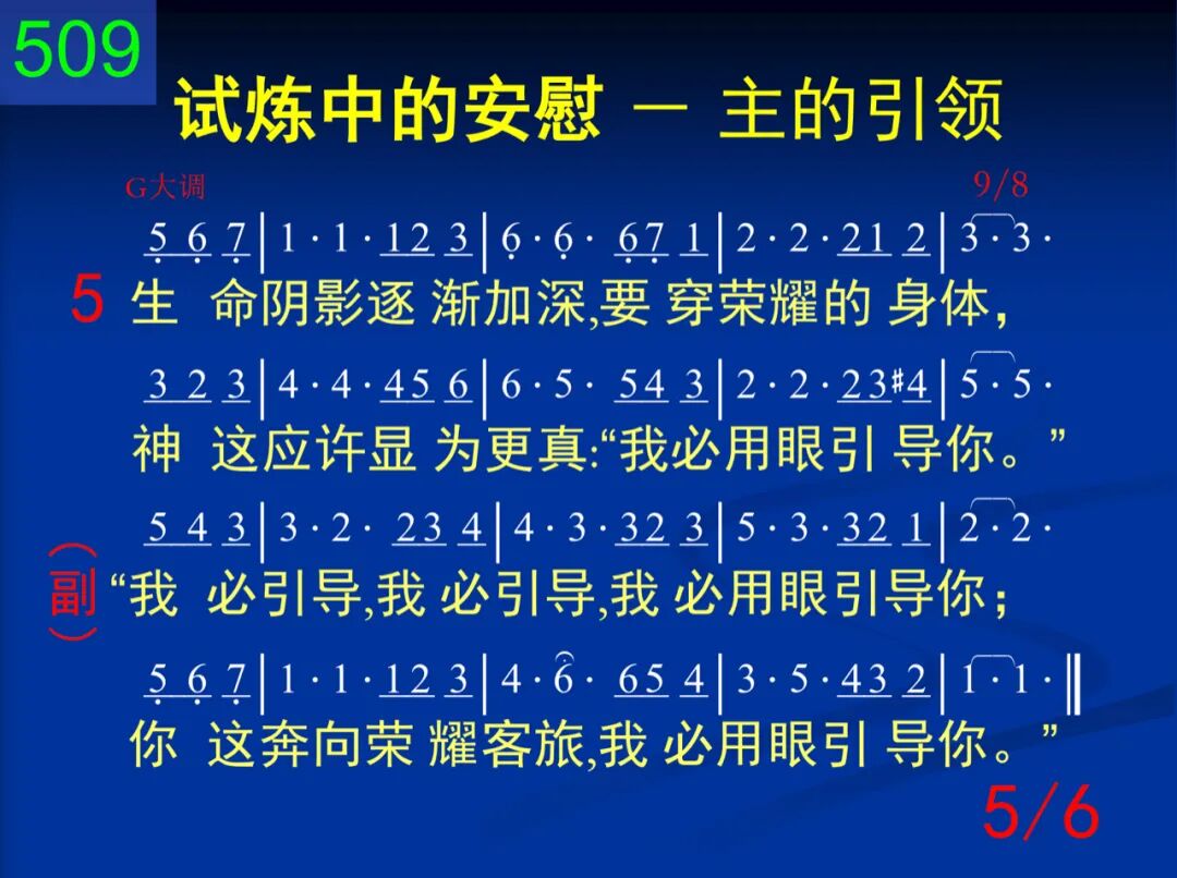 你这奔向荣耀客旅,疲倦困乏心迷离;神已赐你宝贵应许:“我必用眼引导你。” “我必引导,我必引导,我必用眼引导你;你这奔向荣耀客旅,我必用眼引导你。” 二 虽然心中常是纷乱,情绪扰人欲昏迷,但这应许排解万难:“我必用眼引导你。” “我必引导,我必引导,我必用眼引导你;你这奔向荣耀客旅,我必用眼引导你。” 三 虽然试探几乎得胜,可靠亲友也远离,但这应许发出微声:“我必用眼引导你。” “我必引导,我必引导,我必用眼引导你;你这奔向荣耀客旅,我必用眼引导你。” 四 你的隐秘盼望消逝,埋在年日坟墓里,让这应许将你支持:“我必用眼引导你。” “我必引导,我必引导,我必用眼引导你;你这奔向荣耀客旅,我必用眼引导你。” 五 生命阴影逐渐加深,要穿荣耀的身体,神这应许显为更真:“我必用眼引导你。” “我必引导,我必引导,我必用眼引导你;你这奔向荣耀客旅,我必用眼引导你。” 六 但愿我灵以神为乐,我心以祂为至宝,与祂交通一无间隔,接受祂眼的引导。 “我必引导,我必引导,我必用眼引导你;你这奔向荣耀客旅,我必用眼引导你。”