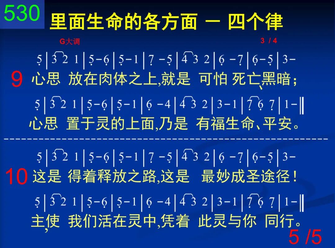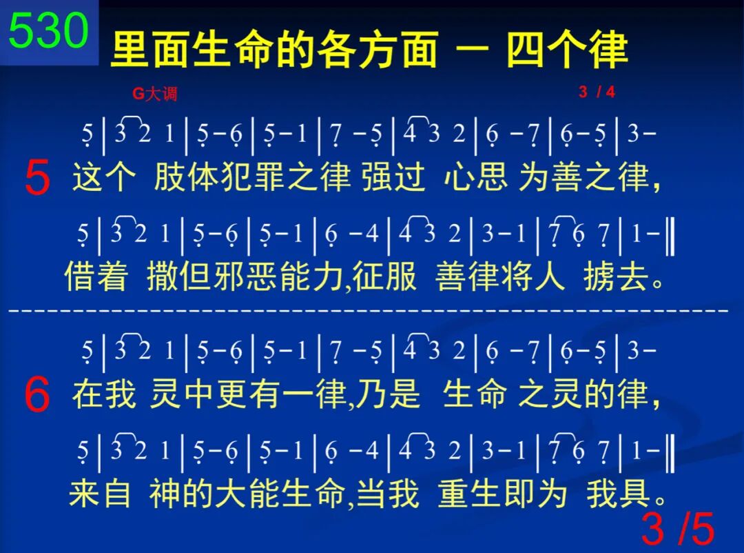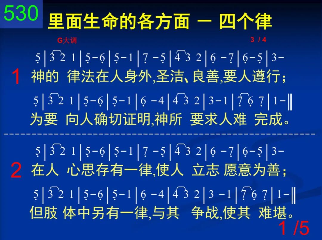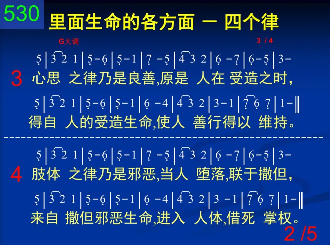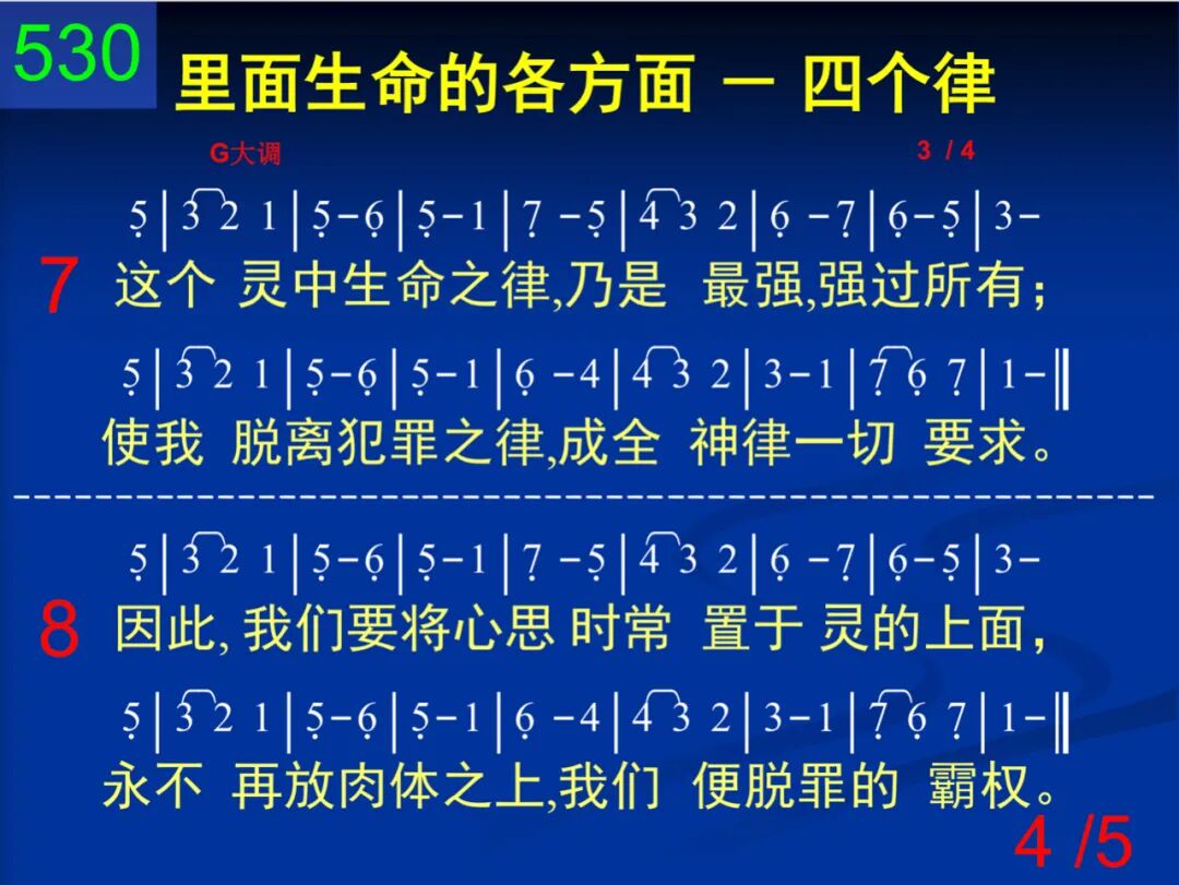 神的律法在人身外,圣洁、良善,要人遵行;为要向人确切证明,神所要求人难完成。 二 在人心思存有一律,使人立志愿意为善;但肢体中另有一律,与其争战,使其难堪。 三 心思之律乃是良善,原是人在受造之时,得自人的受造生命,使人善行得以维持。 四 肢体之律乃是邪恶,当人堕落,联于撒但,来自撒但邪恶生命,进入人体,藉死掌权。 五 这个肢体犯罪之律强过心思为善之律,藉着撒但邪恶能力,征服善律将人掳去。 六 在我灵中更有一律,乃是生命之灵的律,来自神的大能生命,当我重生即为我具。 七 这个灵中生命之律,乃是最强,强过所有;使我脱离犯罪之律,成全神律一切要求。 八 因此,我们要将心思时常置于灵的上面,永不再放肉体之上,我们便脱罪的霸权。 九 心思放在肉体之上,就是可怕死亡、黑暗;心思置于灵的上面,乃是有福生命、平安。 十 这是得着释放之路,这是最妙成圣途径!主,使我们活在灵中,凭着此灵与你同行。
