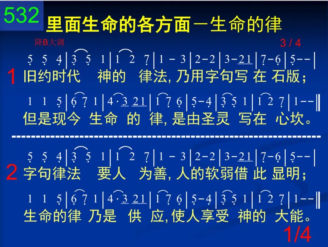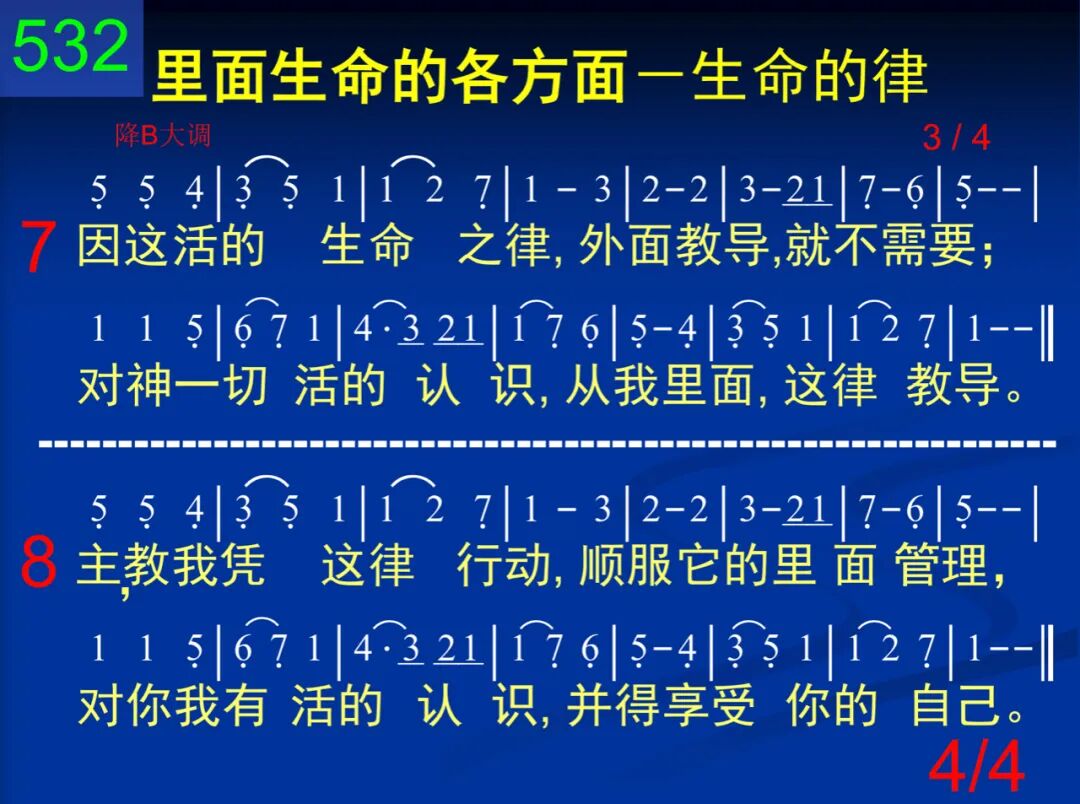 旧约时代神的律法,乃用字句写在石版;但是现今生命的律,是由圣灵写在心坎。 二 字句律法要人为善,人的软弱藉此显明;生命的律乃是供应,使人享受神的大能。 三 字句律法乃在外面,使我对神有所认识;生命的律是在里面,供我以神更深启示。 四 字句律法乃在外面,藉着死的诫命管治;生命的律是在里面,藉着活的知识节制。 五 这个活的生命之律,在我里面多方运行,照着里面生命感觉,从我里面管治、规正。 六 这个管治极细、极深,在我全人最深之处,带来活的生命感觉,将神自己向我供输。 七 因这活的生命之律,外面教导,就不需要;对神一切活的认识,从我里面,这律教导。 八 主,教我凭这律行动,顺服它的里面管理,对你我有活的认识,并得享受你的自己。