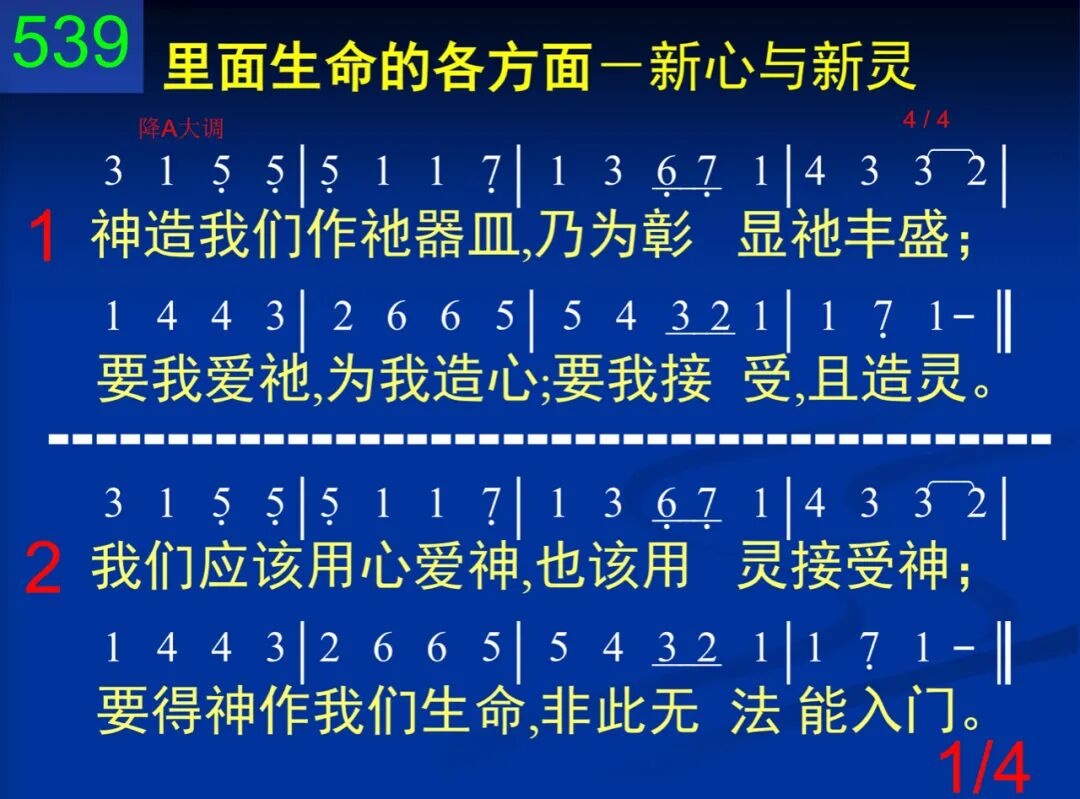 神造我们作祂器皿,乃为彰显祂丰盛;要我爱祂,为我造心;要我接受,且造灵。 二 我们应该用心爱神,也该用灵接受神;要得神作我们生命,非此无法能入门。 三 撒但败坏我们的心,也弄死了我们灵;使我不能与神接触,反倒靠赖己生命。 四 因此,主在祂救恩里,更新我的心与灵;恢复了我爱的心情,并我接受的本能。 五 乃是藉着更新的心,我们爱神,渴慕神;且是藉着更新的灵,我们拜神,接受神。 六 对神,我们的心应当诚实、清洁又单纯;并且我们的灵该是贫穷、寻求且温顺。 七 神阿,保守我心爱你,常是新鲜、无陈迹;并使我灵刚强、活泼,永以新样接触你。